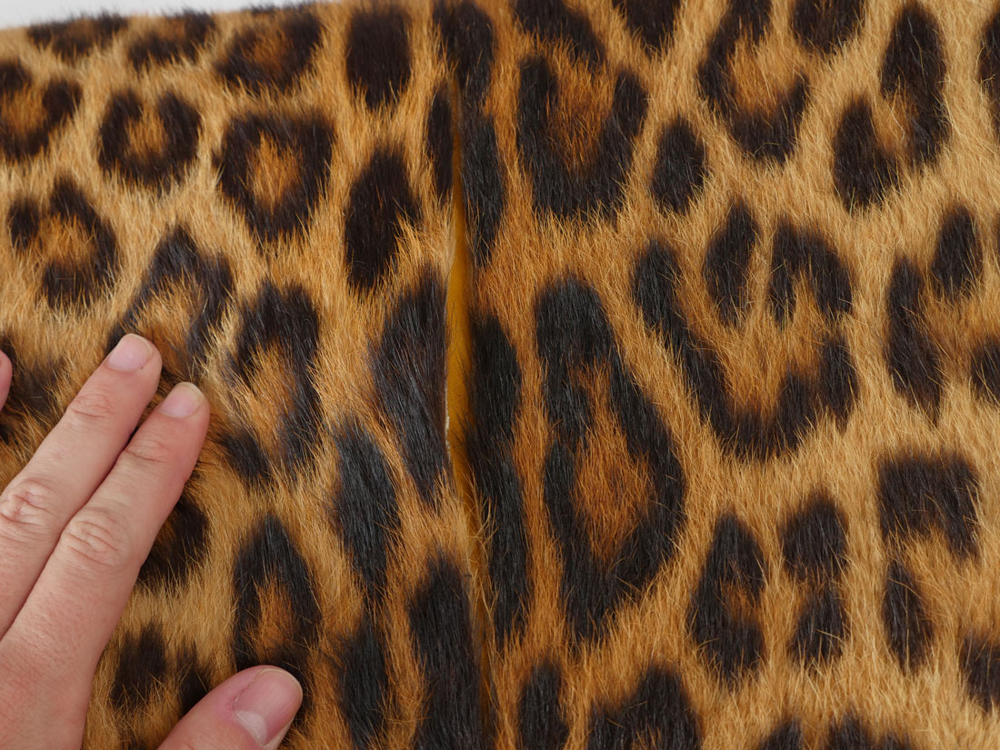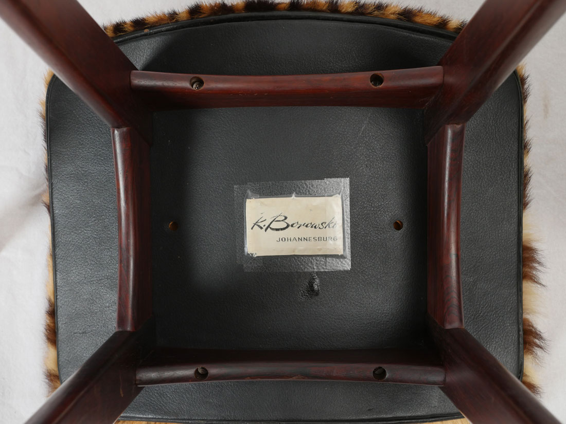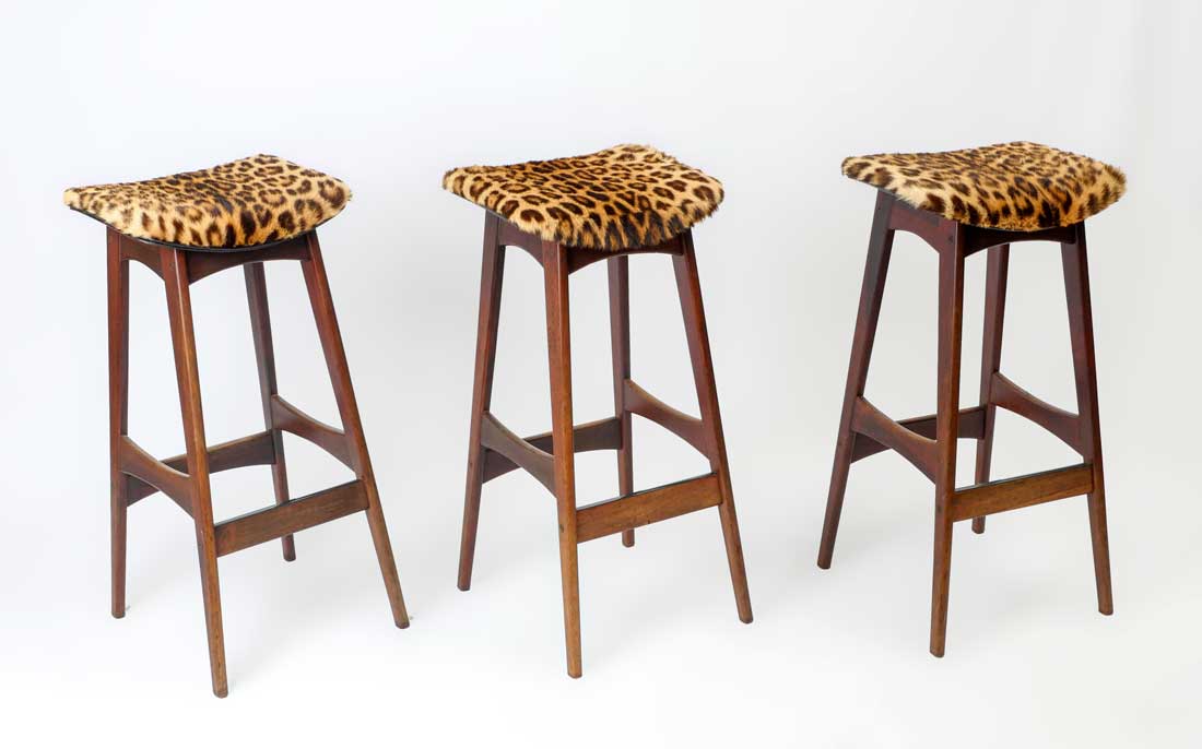 3 ERIK BUCK FOR ODDENSE MASKINSNEDKERI BAR STOOLS: Uniquely modified from the original stools with vintage leopard fur upholstered seats. Teak frames missing foot rests, overall 31'' h. x 15 1/2'' x 16''.