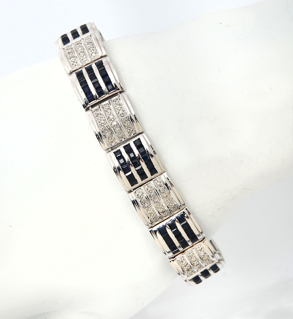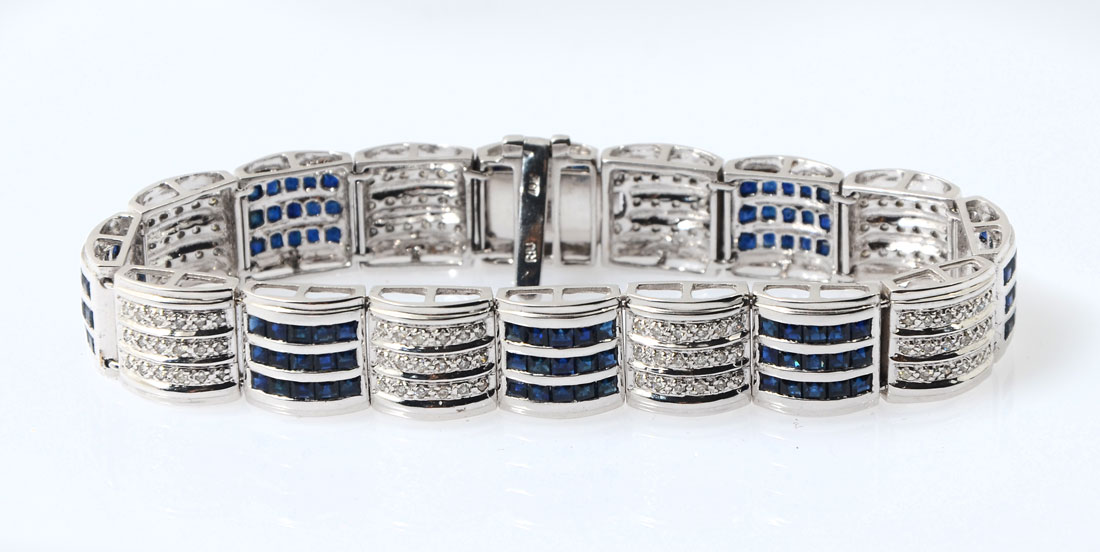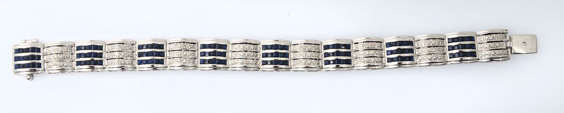 18K SAPPHIRE & DIAMOND BRACELET: 18 karat white gold bracelet with 120 square sapphires WEIGHT: 9.33 ctw. approx. Also has 144 round full cut diamonds. WEIGHT: 1.44 ctw. approx. Rating is M-N in color and I-1 to I-2 in clarity. 38.3 grams. Measures approx 7'' in length and .5'' in width. Weight 38.3 grams.
