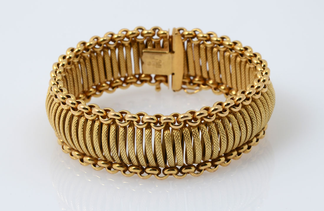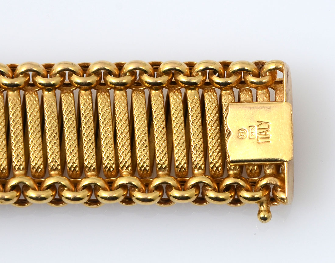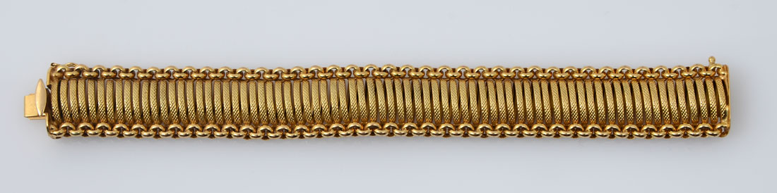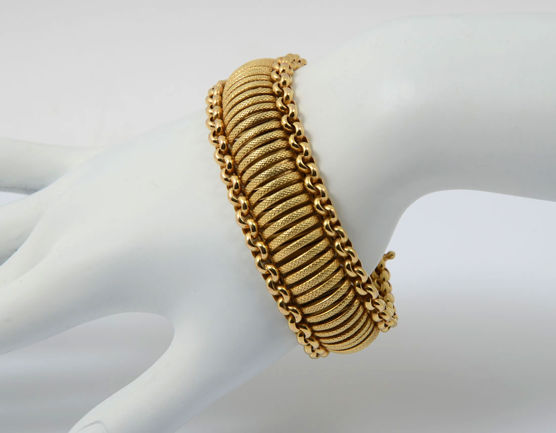 14K ITALIAN CUFF BRACELET: This statement piece in yellow gold with textured spiral links and hollow cable link strands on each side. weighs in at 35.4 grams. Marked 14K Italy B (Brev). 8'' in length and .875'' wide.