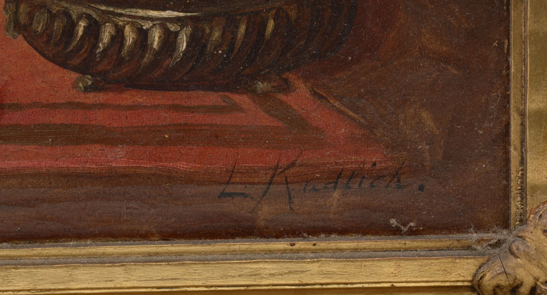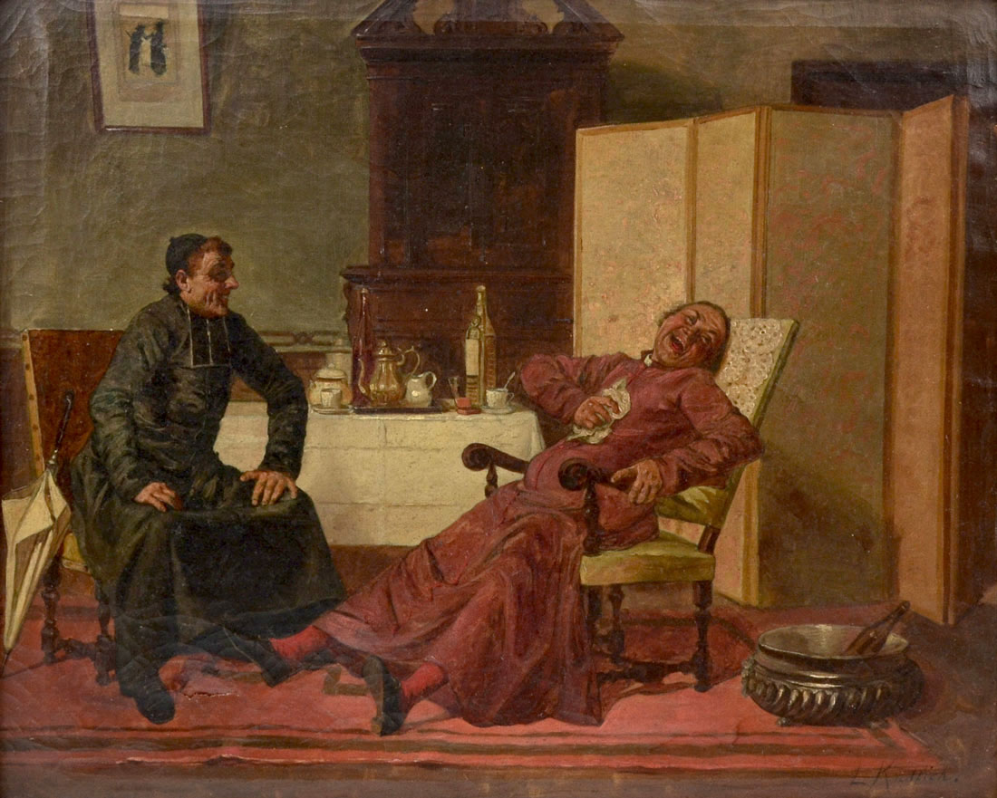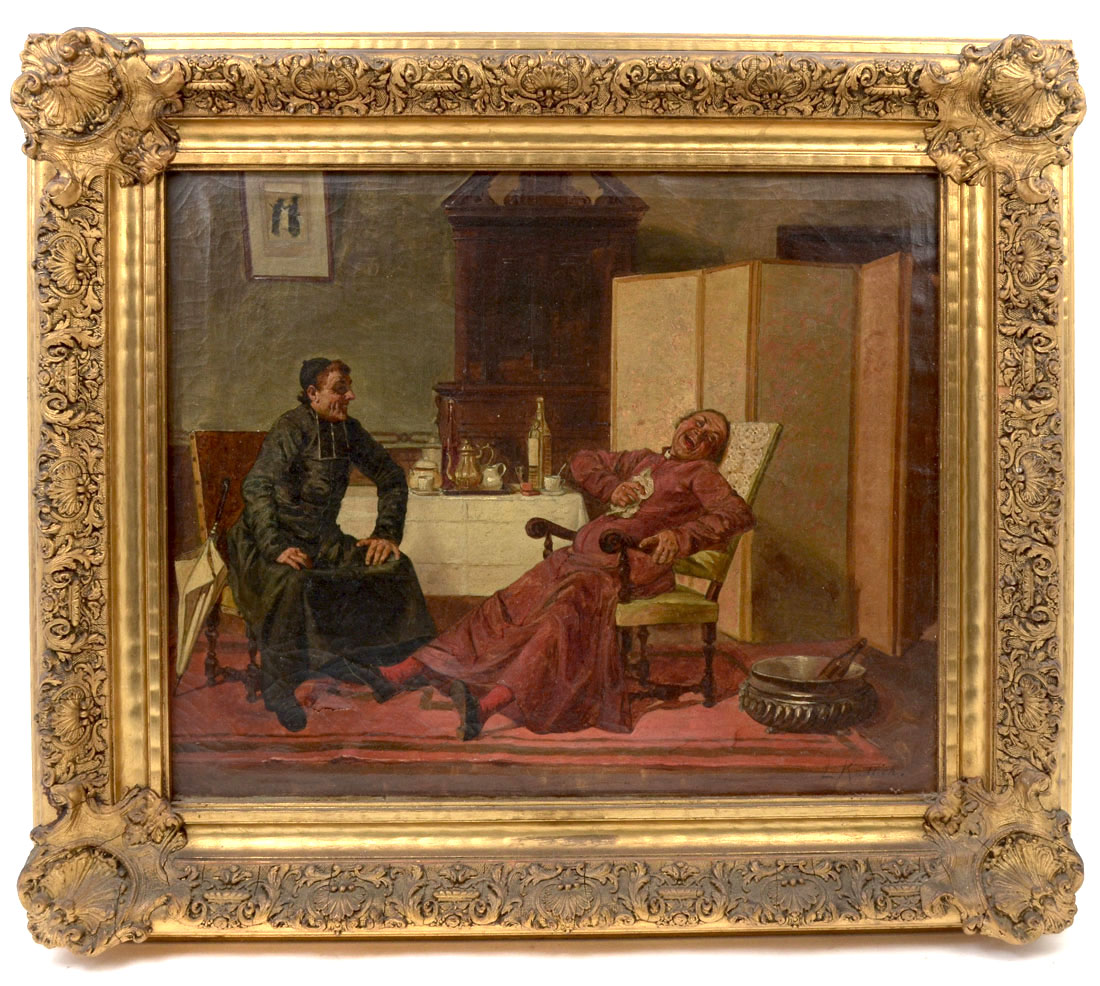 RELIGIOUS GENRE PAINTING: Oil/Canvas Interior Scene with Cardinal and Bishop Sharing a Laugh at Tea, 18.75'' x 23.25'', signed lower right L. Kudlich?, carved and gilded period frame, 26.5'' x 30.5''.