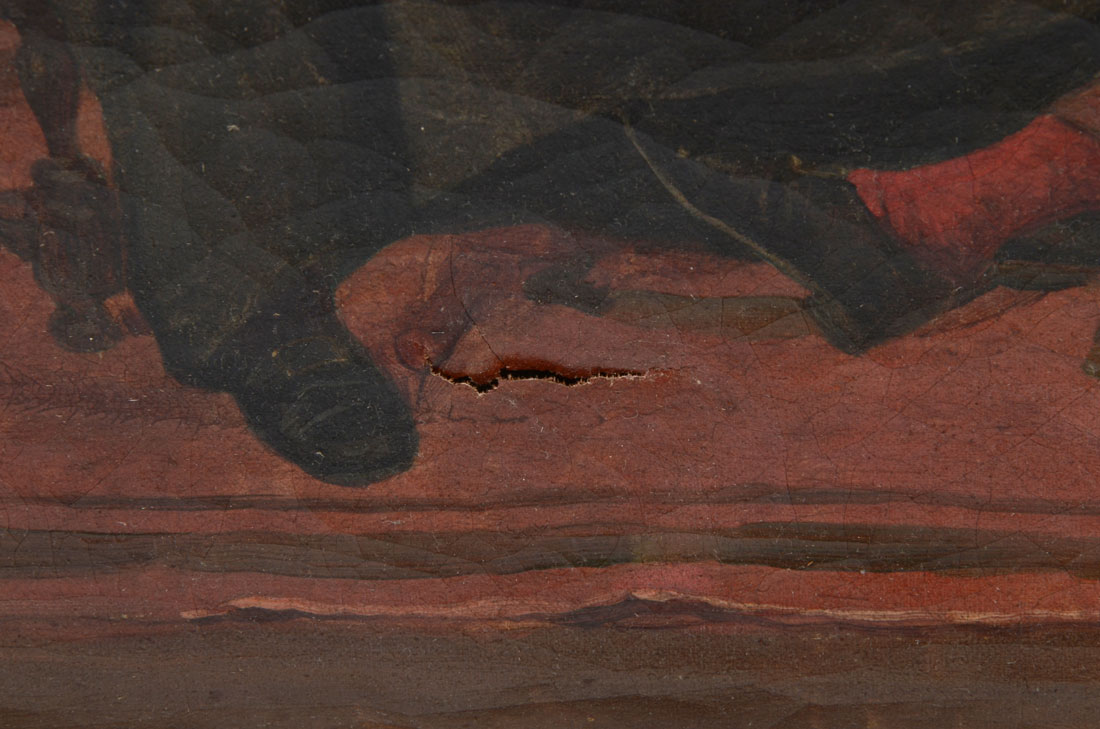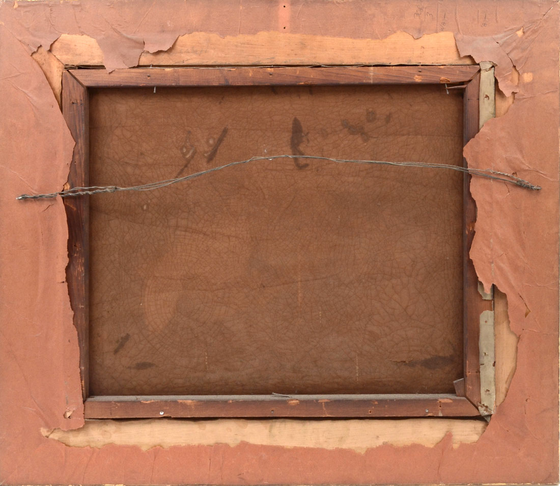 CONDITION: Craquelure throughout, needs cleaning, puncture lower left, painted frame.