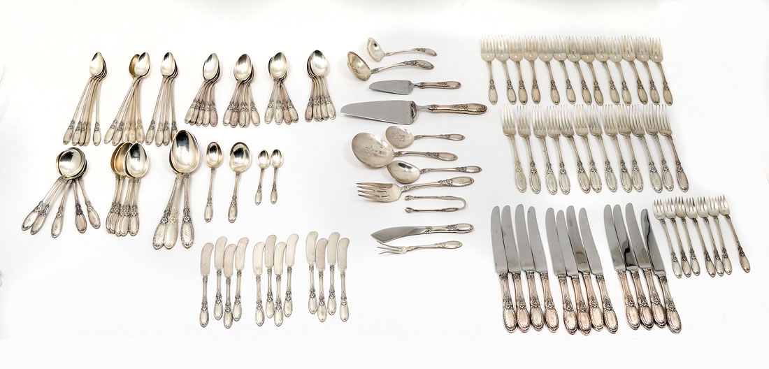 TOWLE OLD MIRROR STERLING FLATWARE: Approx. 113 piece in the Old Mirror pattern by Towle to include 12 forks (7 1/8''), 12 salad forks (6 3/8''), 19 teaspoons (6''), 5 soup spoons round (6 1/4''), 5 dessert spoons(6 5/8''), 14 iced tea spoons (7 7/8''), 12 hollow knives (8 3/4''), hollow master butter knife, 12 solid butter knives (5 3/4''), 2 demitasse spoons (4 1/8''), lemon fork (5 3/8''), 6 cocktail forks (5 5/8''), 3 tablespoons (8 1/2''), gravy ladle (6 5/8''), cream ladle (5 1/2''), jelly server (6 1/2''), tomato server (7 1/4), bon bon spoon (5 1/2''''), sugar tongs (4''), hollow cake server (10 1/2''), cheese server (6 3/4''). Majority of pieces with ''S'' monogram. Approx. 102.7 troy oz.