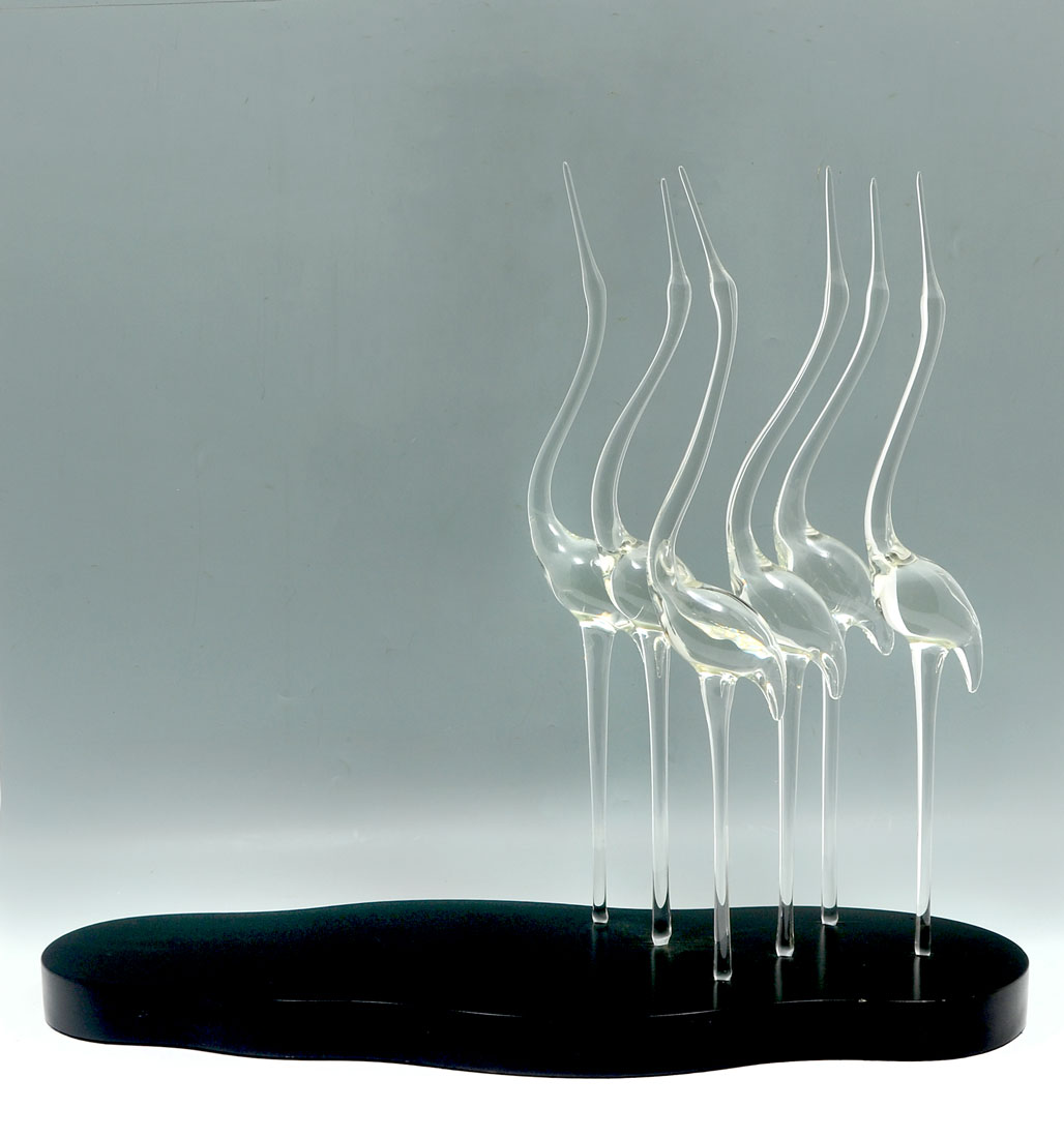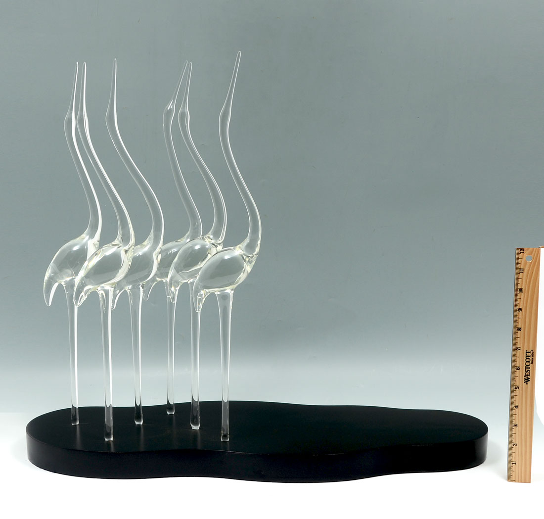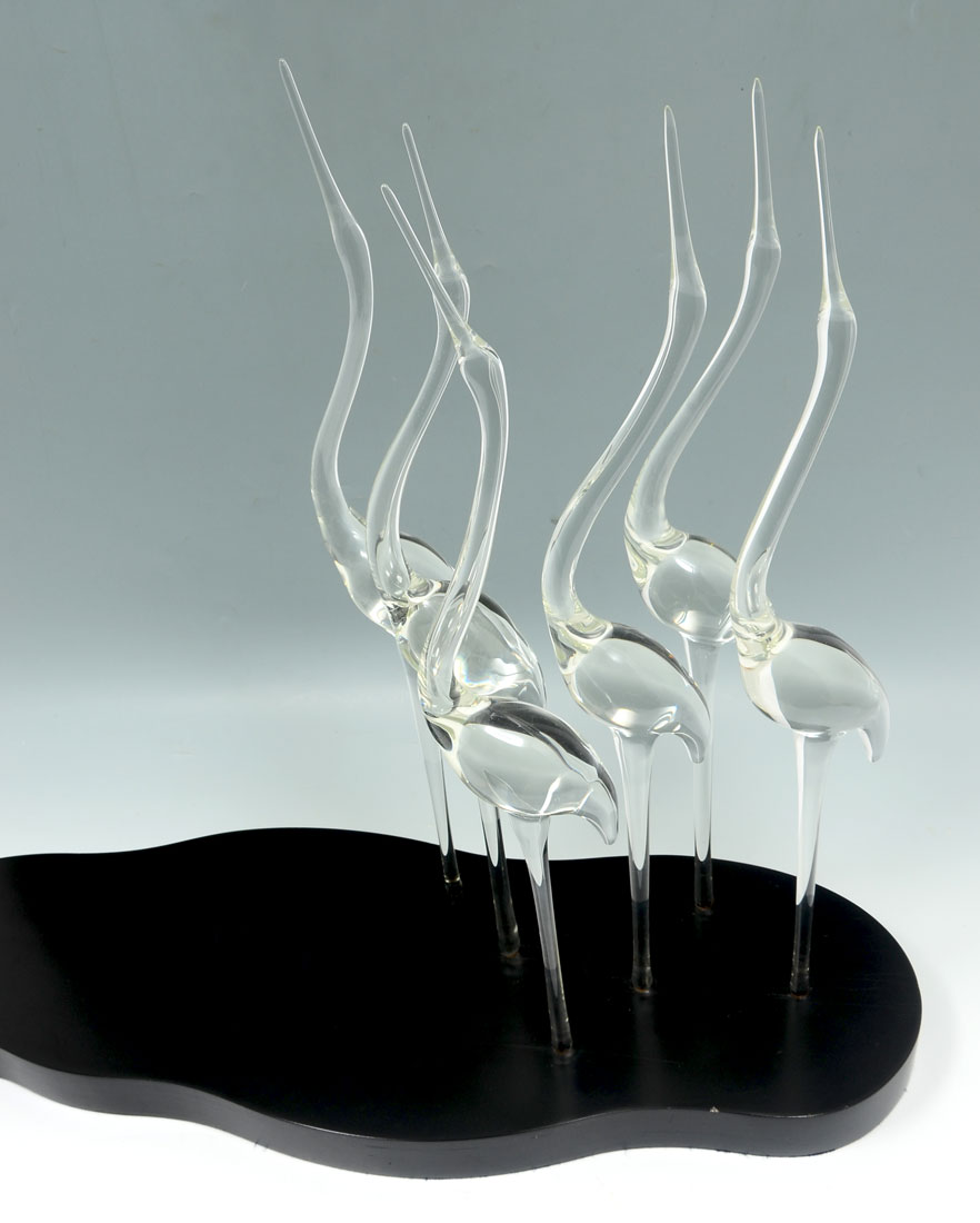 FRABEL, Hans, (American, 1941): Mixed Media Sculpture with the Flamingos Consisting of a Clear Blown Glass, measures approximately 19.50'' in height, they are inserted in to a painted and sculpted wood surface which is approximately 25'' long x 8.50'' wide x 1.50'' tall.