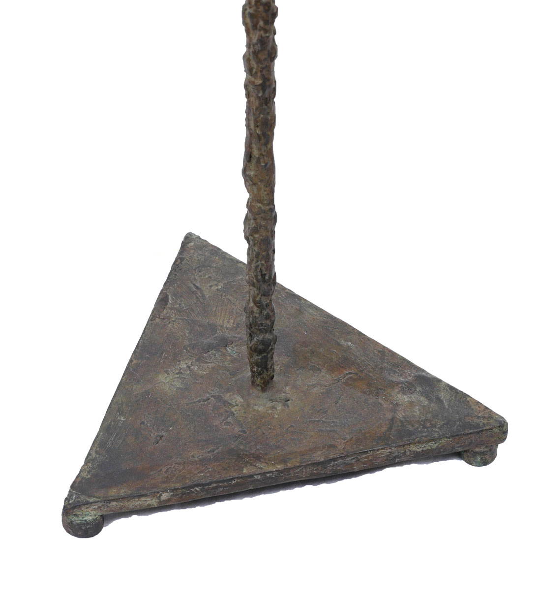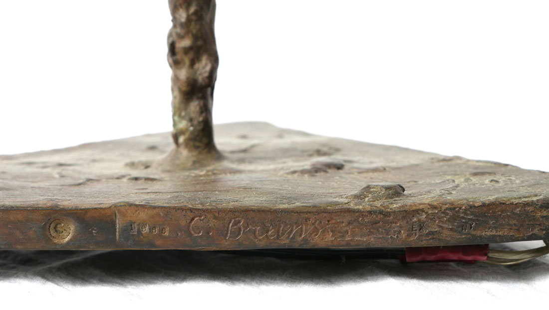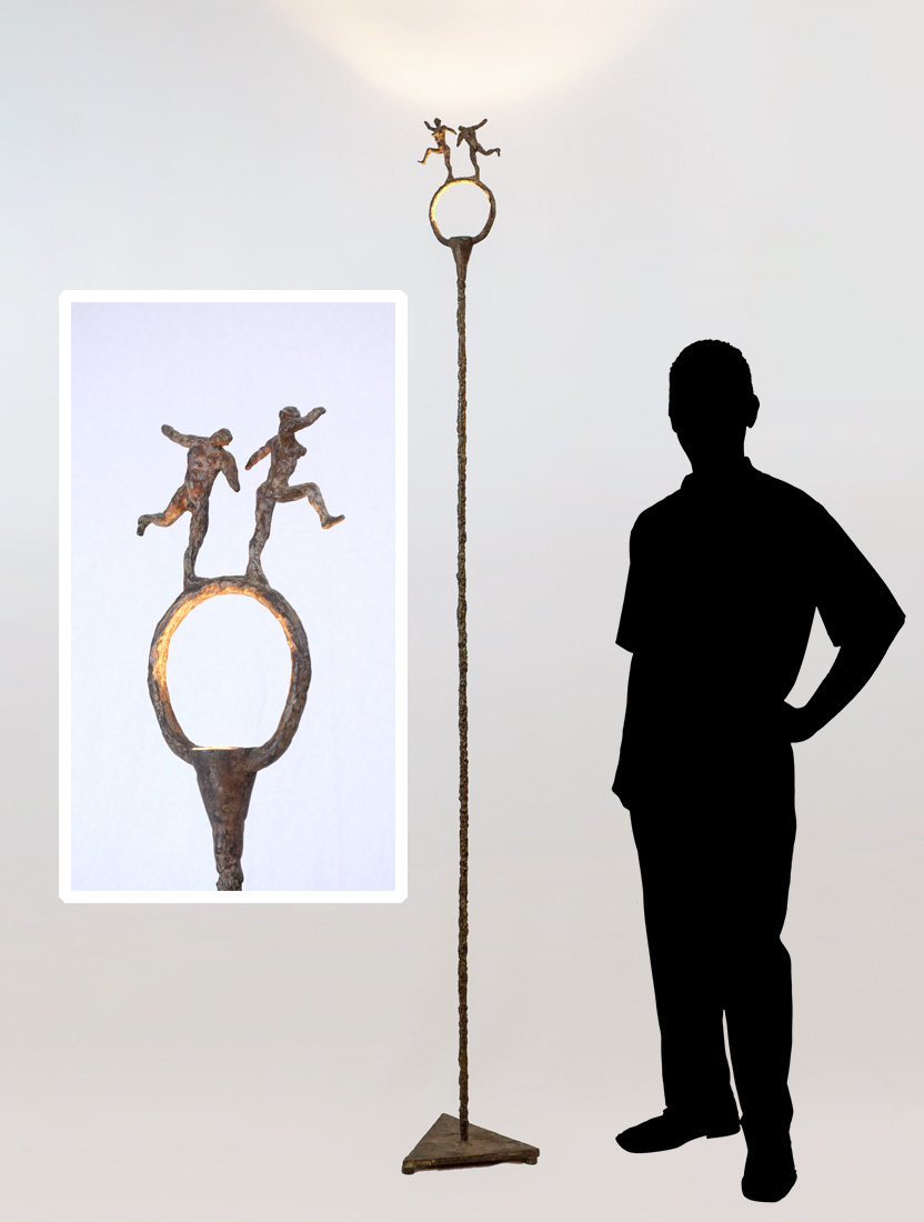 CAROLO BRUNS DOUBLE RUNNING FIGURE BRONZE LAMP: Bronze sculpted floor lamp with 2 figures in a running motion at top. Signed on base C. Bruns, 1983. 89.5'' h x 10.25'' w.