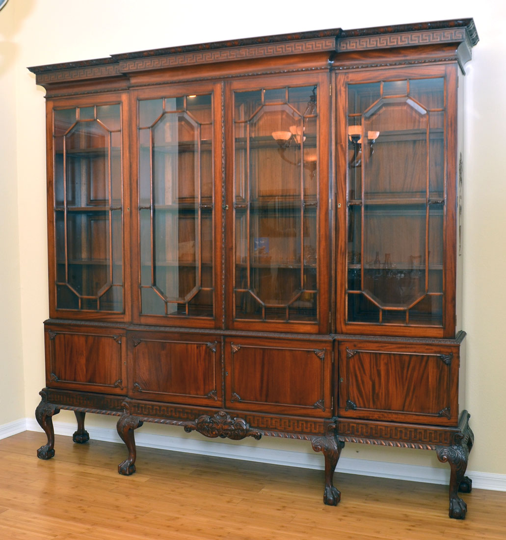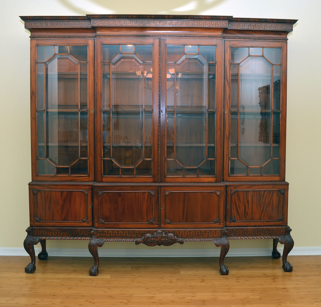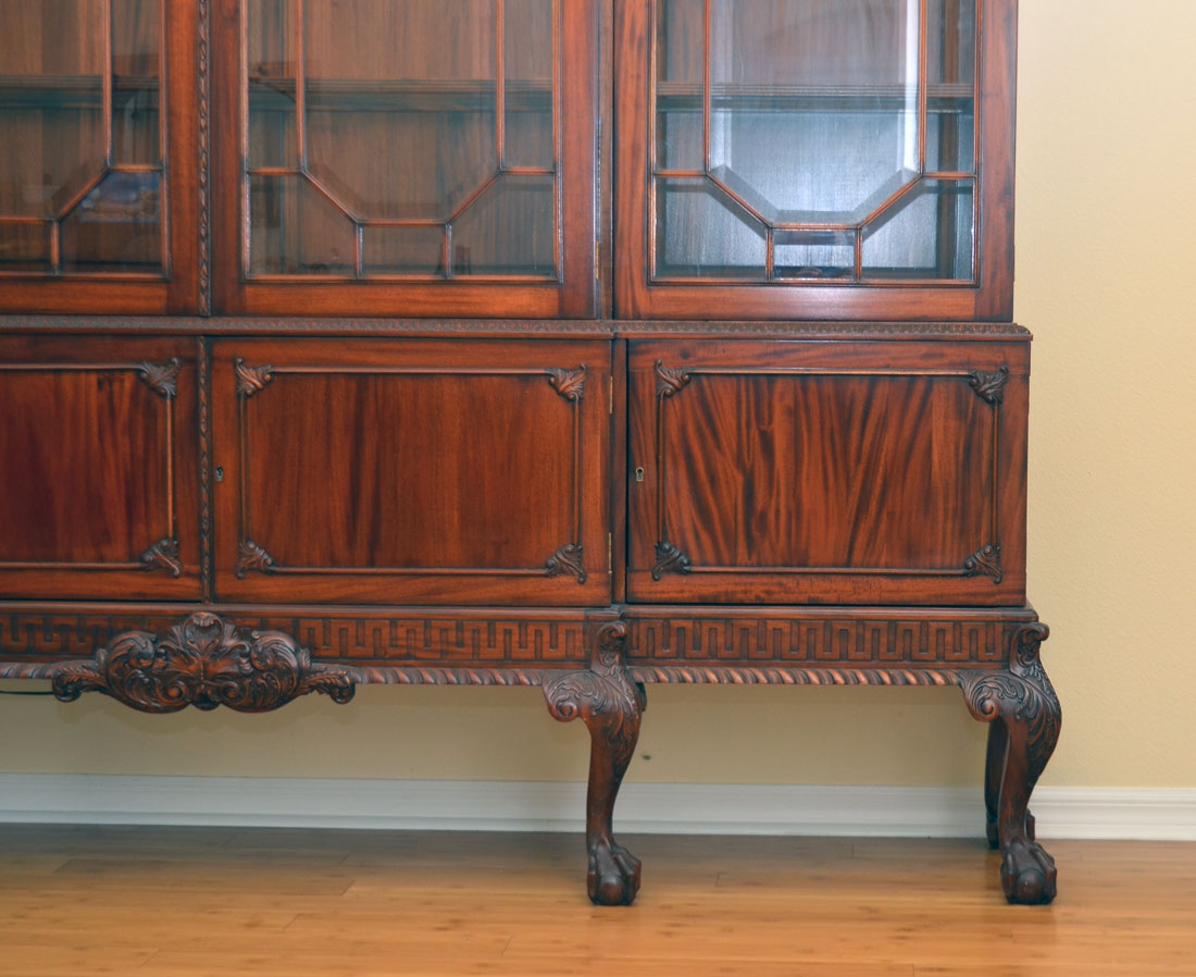 CHIPPENDALE STYLE BLOCKFRONT BREAKFRONT BEVELED GLASS: Elegant, carved Mahogany red detailed end panels. 87'' h x 93'' w x 17.50''