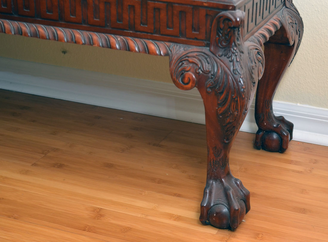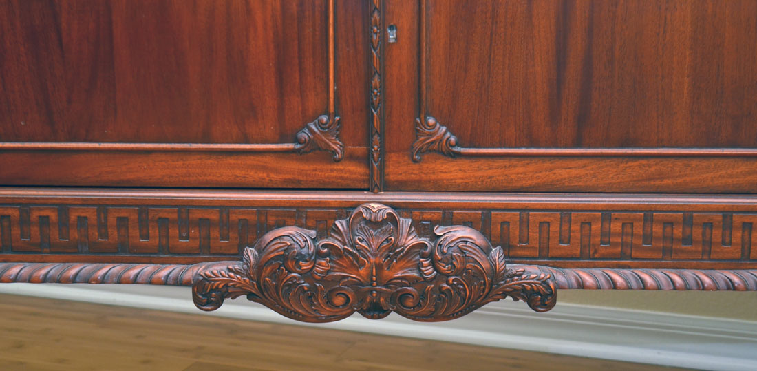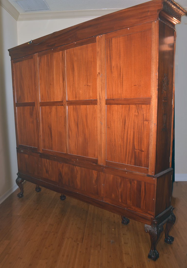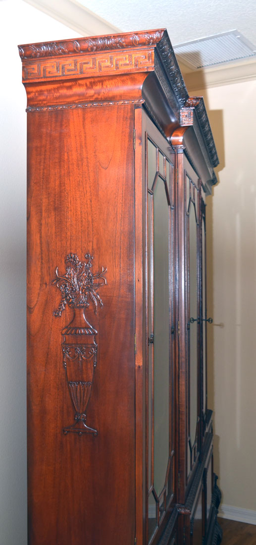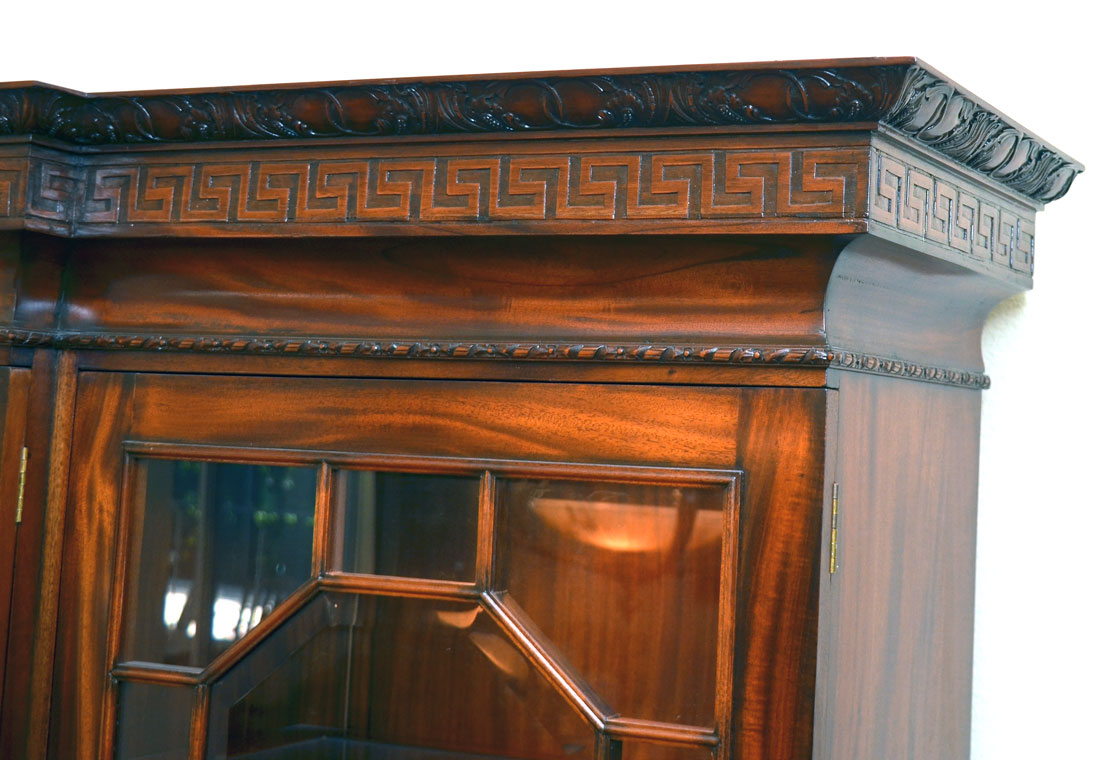 CHIPPENDALE STYLE BLOCKFRONT BREAKFRONT BEVELED GLASS: Elegant, carved Mahogany red detailed end panels. 87'' h x 93'' w x 17.50''