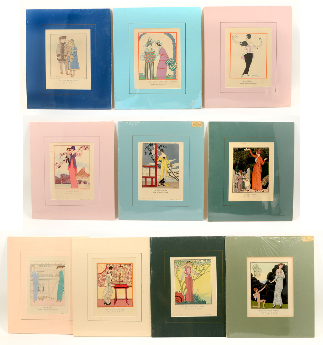 10 POCHOIR FASHION PRINTS LA GAZETTE DU BON TON: Circa 1912-1925, from the French publication La Gazette du Bon Ton, each piece matted and shrink wrapped, matted 14 3/4'' x 12 1/2''.