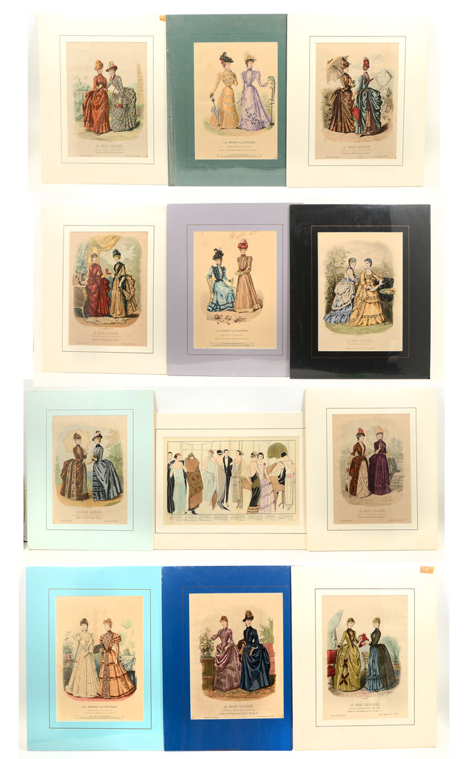 11 FRENCH LA MODE ILLUSTREE FASHION PRINTS: Circa late mid to late 19th century, a total of 12 prints, 11 from ''La Mode Illustree'', the 12th circa 1923 from ''Arte Gout Beaute''. All matted and shrink wrapped, largest mat 17'' x 23''.