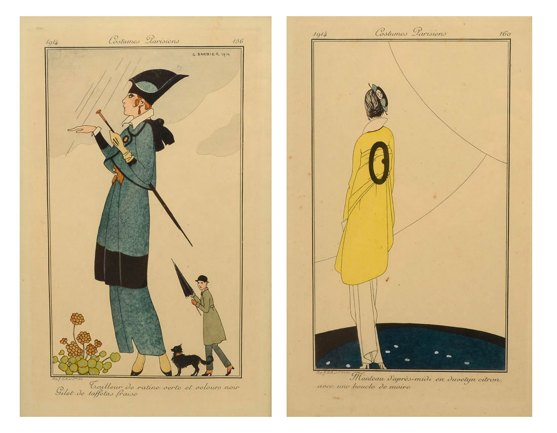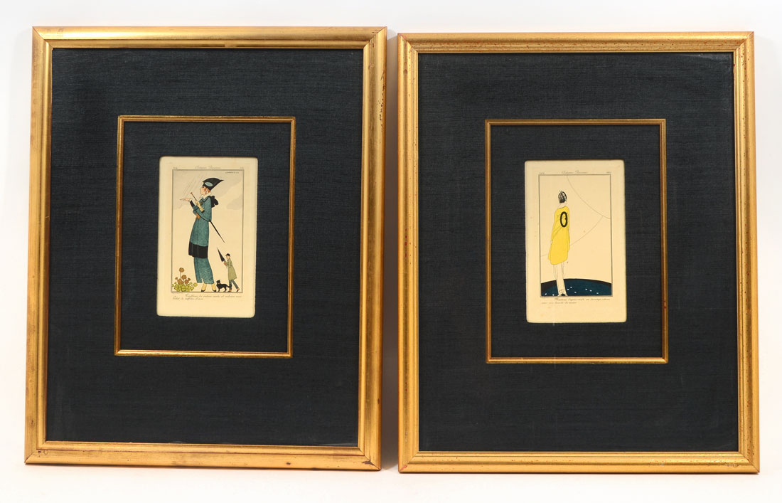 2 FRAMED COSTUMES PARISIENES FASHION PRINTS: Circa 1914, hand colored engravings, each nicely framed and matted. Sight size 8'' x 5'', framed 21 3/4'' x 17 3/4''.