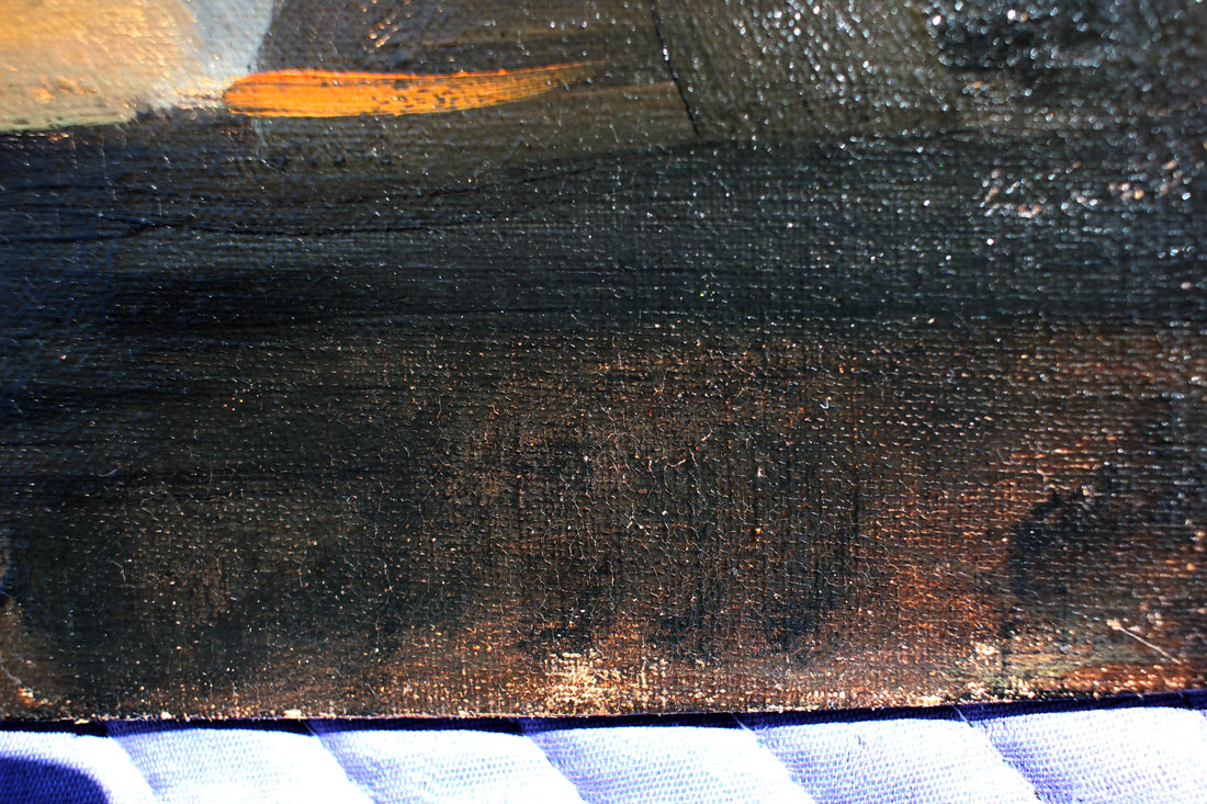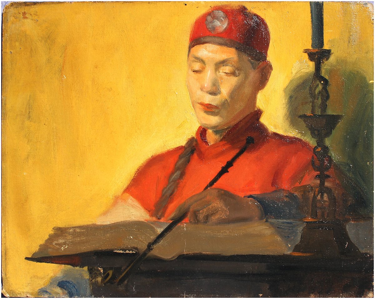 ATTRACTIVE MYSTERY PAINTING CHINESE SCHOLAR: Oil/Canvasboard, 16'' x 19.75'', possible signature lower right, unframed, circa 1940, possibly earlier.