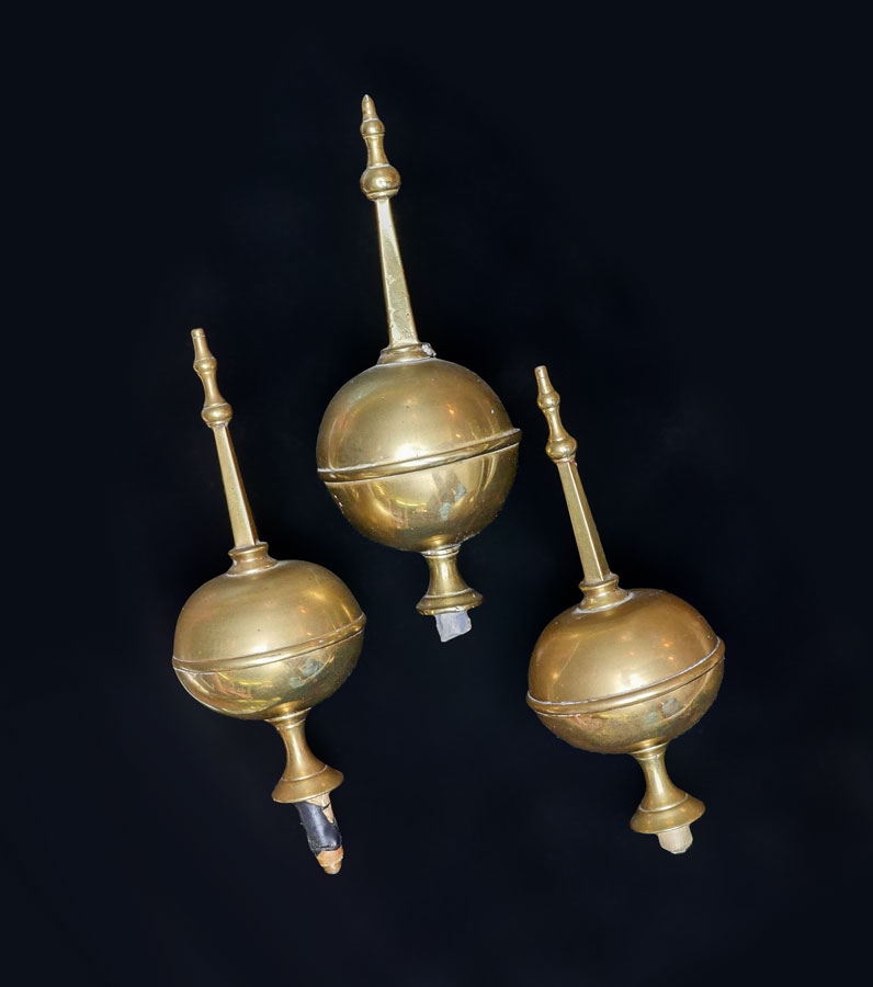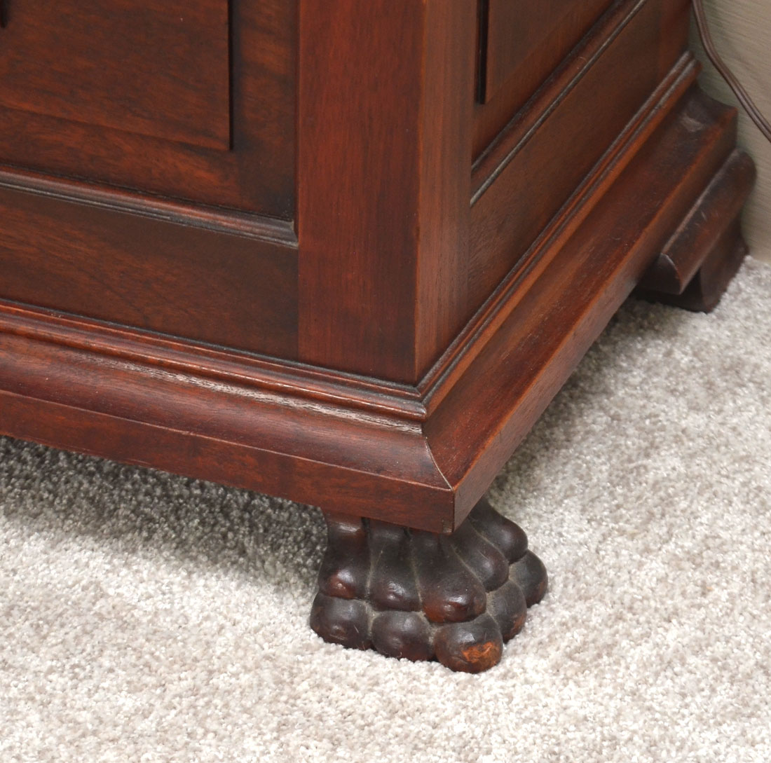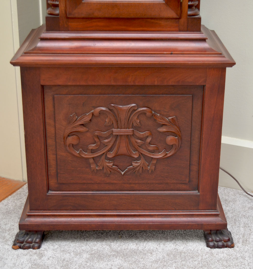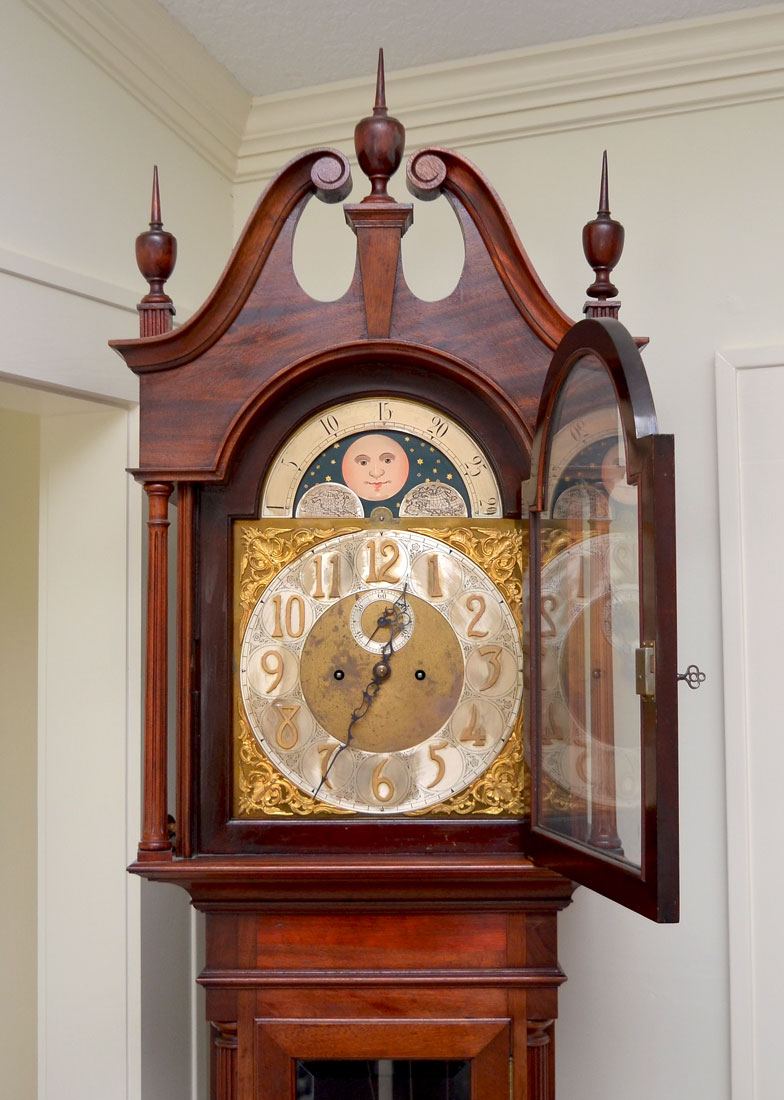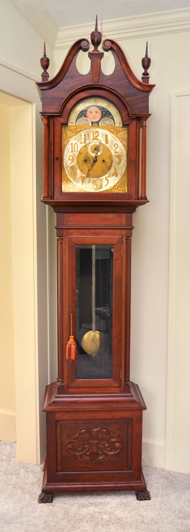 MAHOGANY TALLCASE CLOCK WITH MOONPHASE DIAL: Late 19th to early 20th century, bonnet with broken arch pediment, 3 spire finials, fluted full columns. Trunk with fluted quarter columns, glass door, base with applied carved decoration, front paw feet. Mixed metal dial with applied spandrels, moon phase dial, unmarked as to maker. Sold with extra 3 extra brass finials just in case you like that polished look. Overall measures 97'' h. with finials x 23 1/2'' x 15 1/2''.