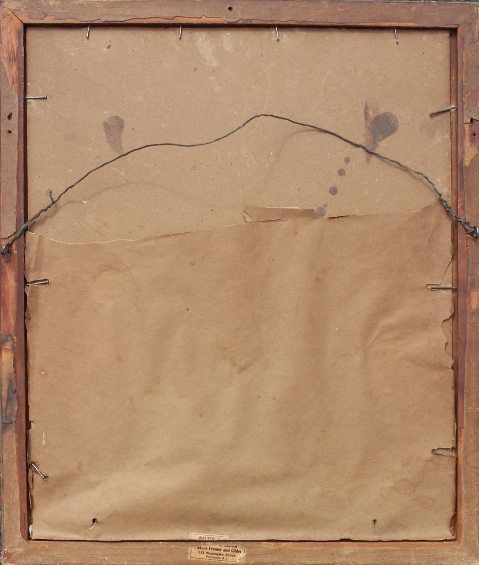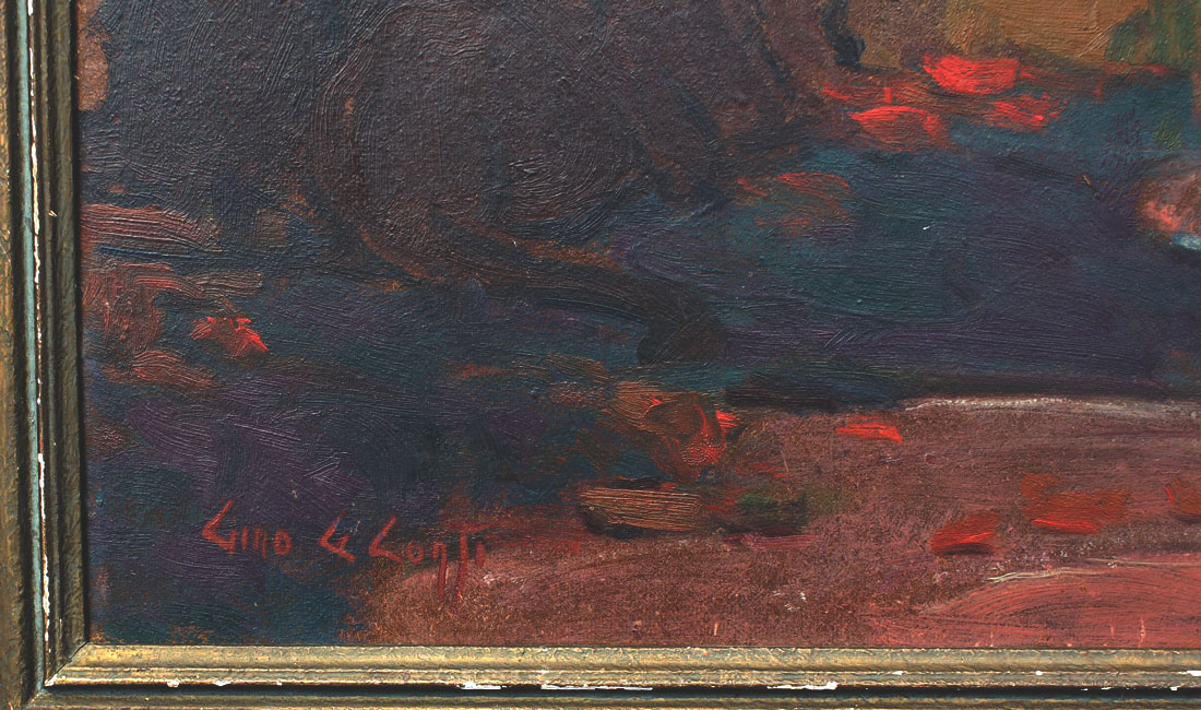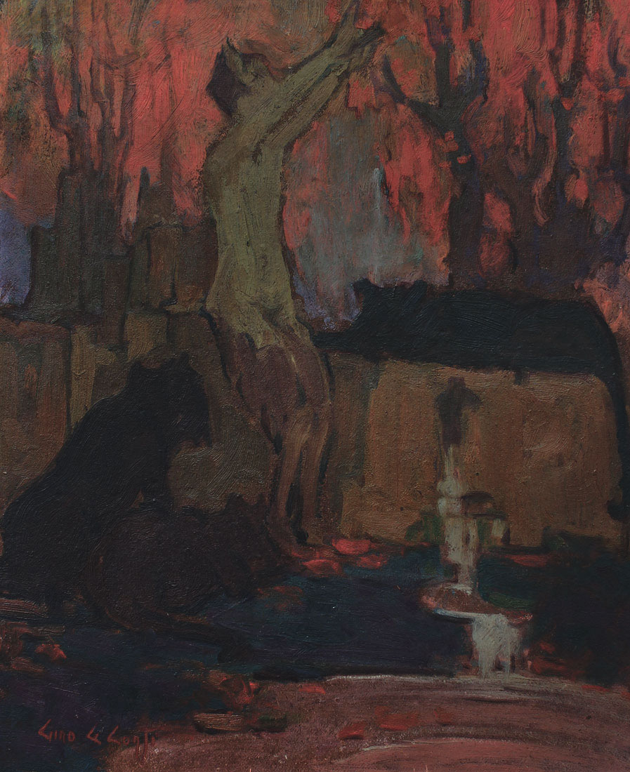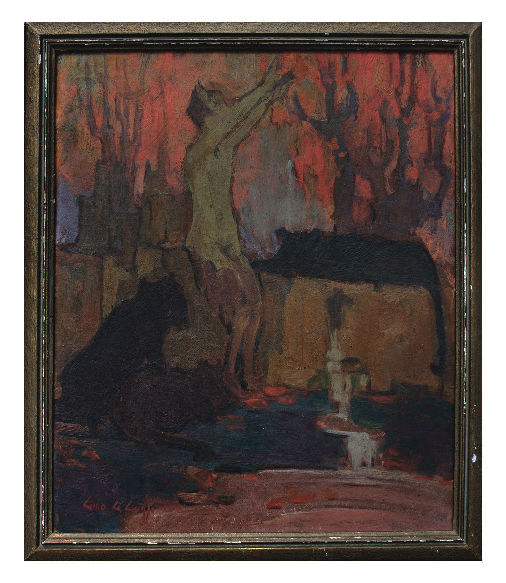 CONTI, Gino, (American, 1900-1983): Macabre Scene with Satyr and 2 Large Hounds or Cats, Oil/Board, 16'' x 13'', signed lower left, framed, 17.5'' x 15''.