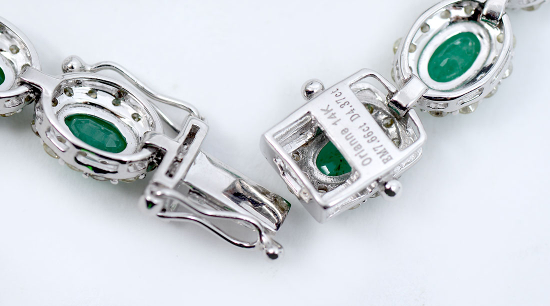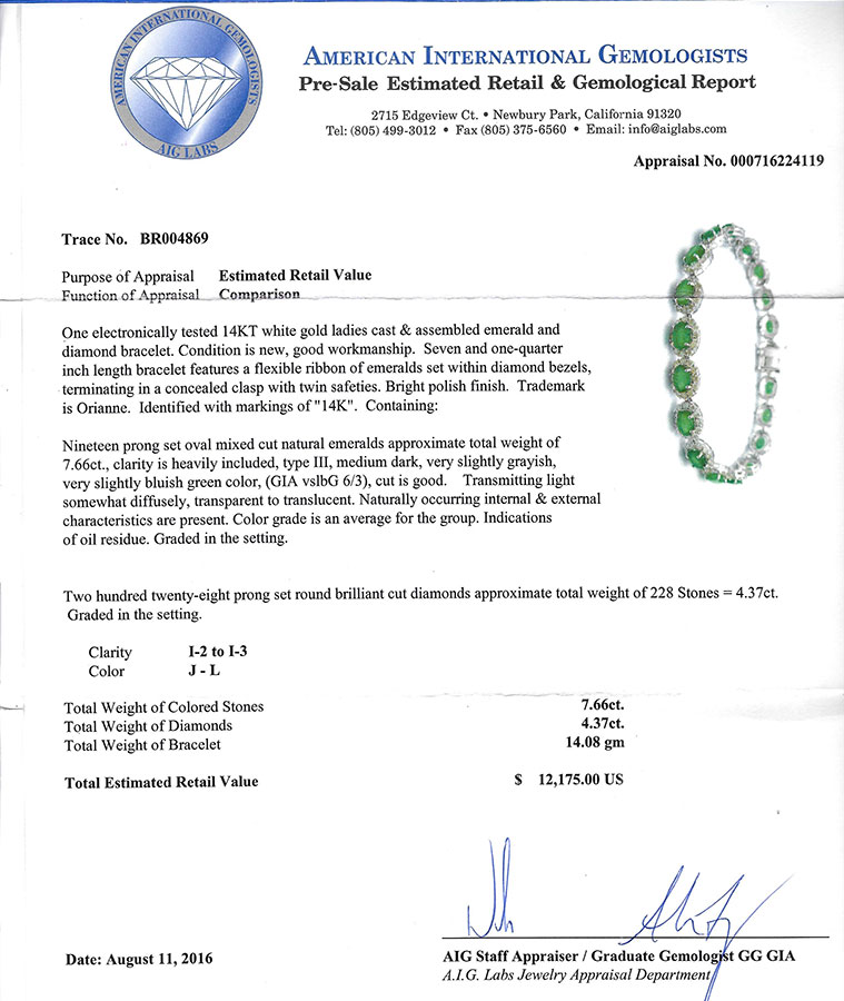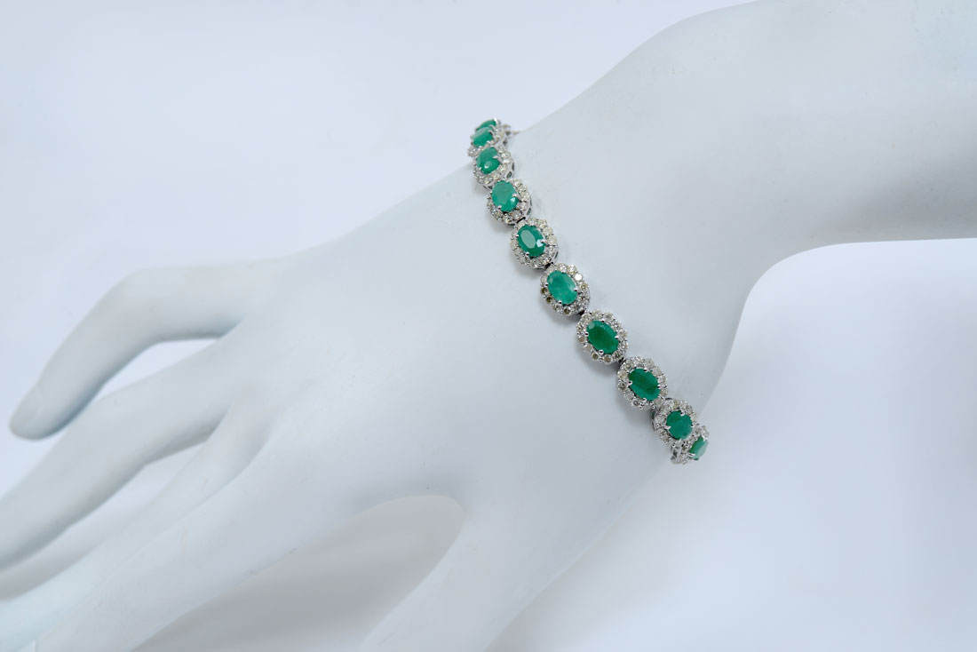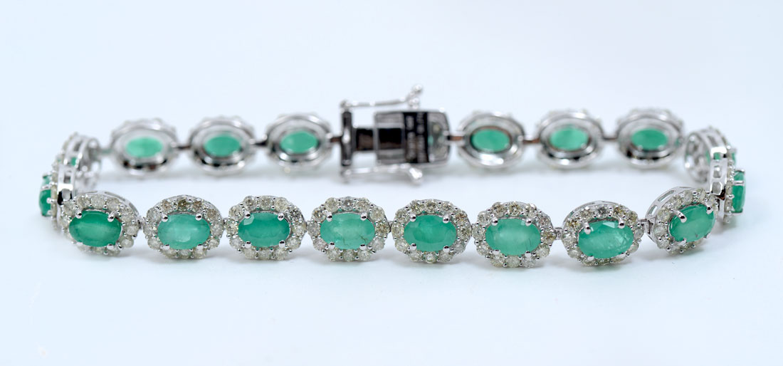 14K EMERALD & DIAMOND BRACELET: 7.25'' bracelet features a flexible ribbon of emeralds set within diamond bezels and secured with a twin safety clasp. 19 oval mixed cut emeralds approx 7.66CTW with 228 prong set brilliant cut diamonds perfectly accenting each stone. Total weight approx 14.08 grams. Sold with American International Gemologists appraisal of $12,175.