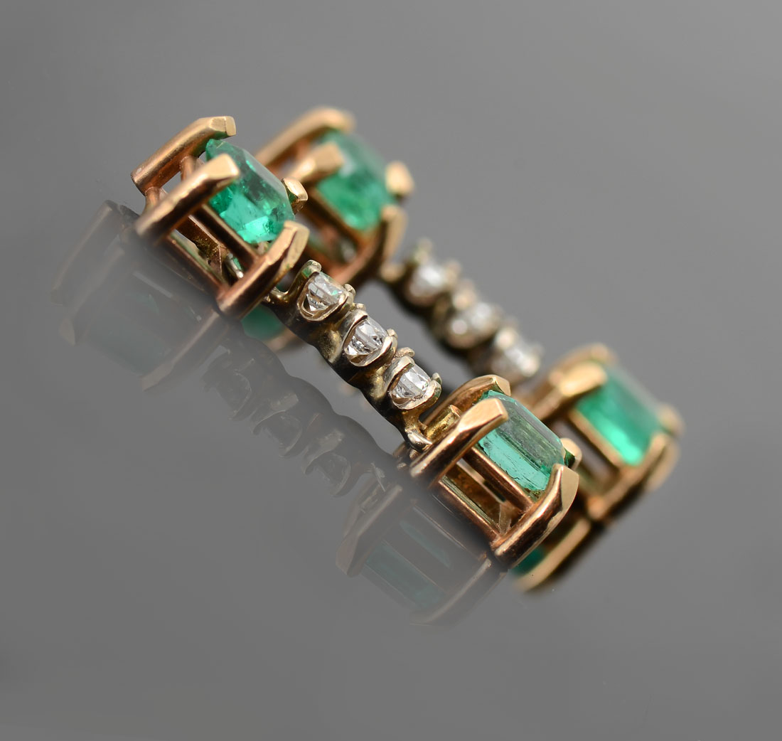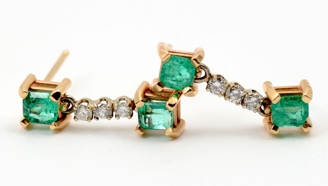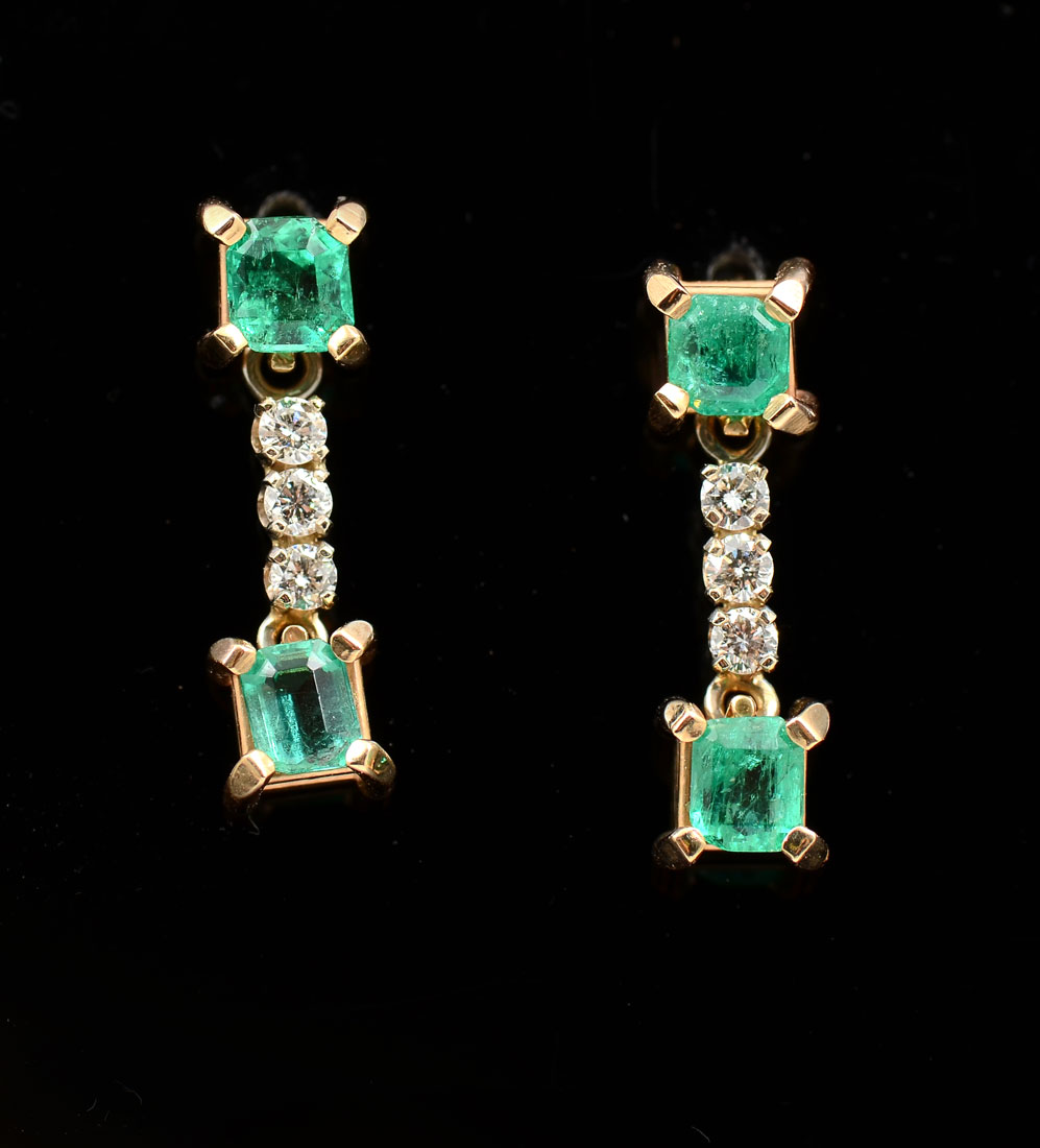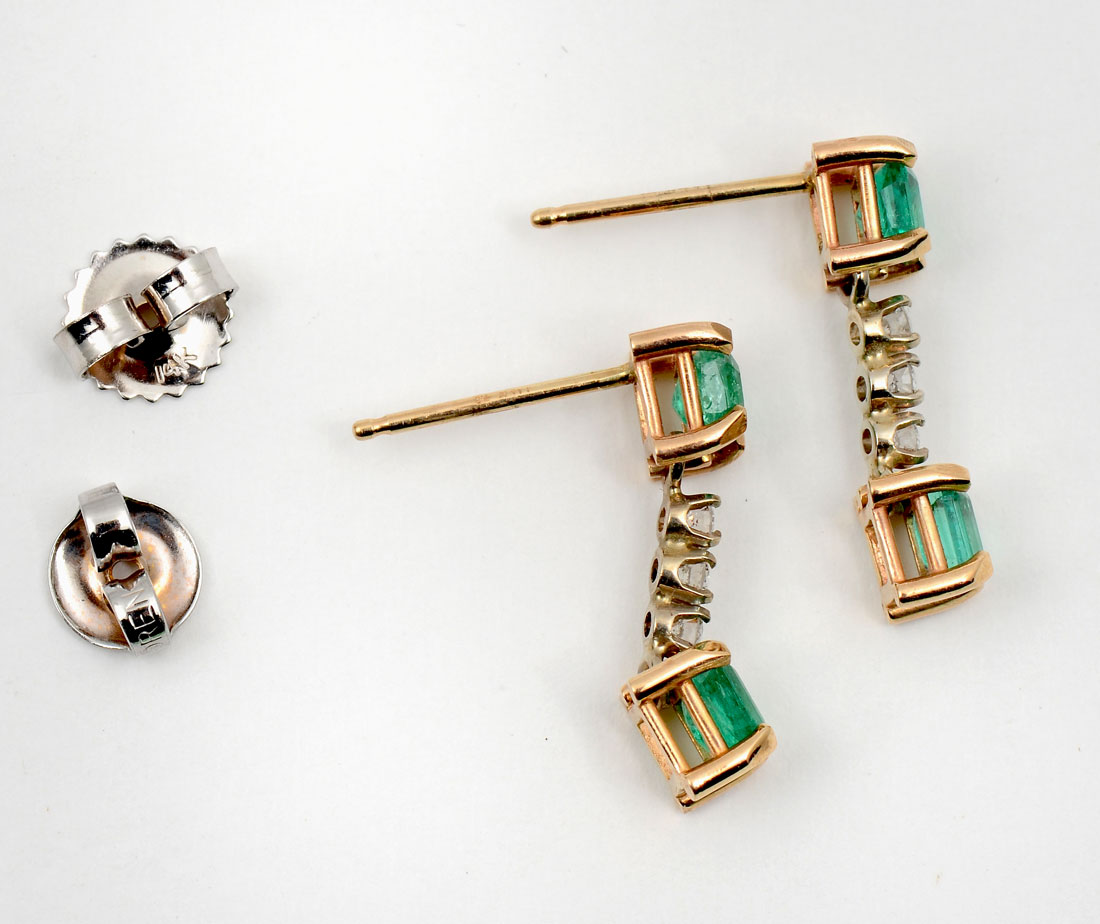 14K EMERALD & DIAMOND DANGLE EARRINGS: Petite dangle yellow gold earrings are anchored top and bottom with 4 natural Columbian emeralds approx 1.60 CTW. 6 VS diamonds connect the emeralds. Weight 2.5 grams.