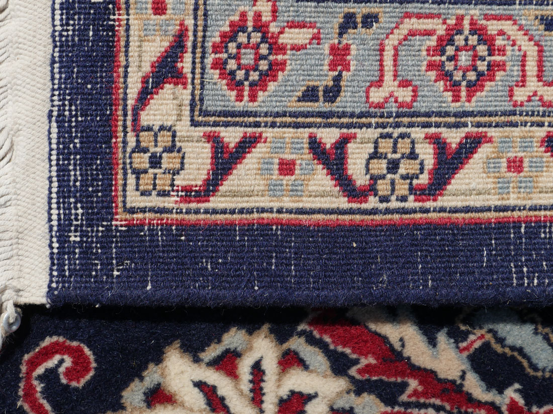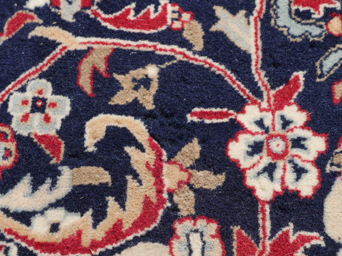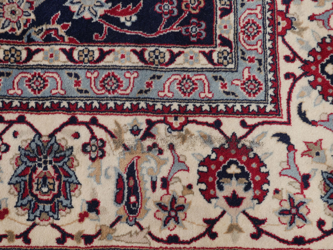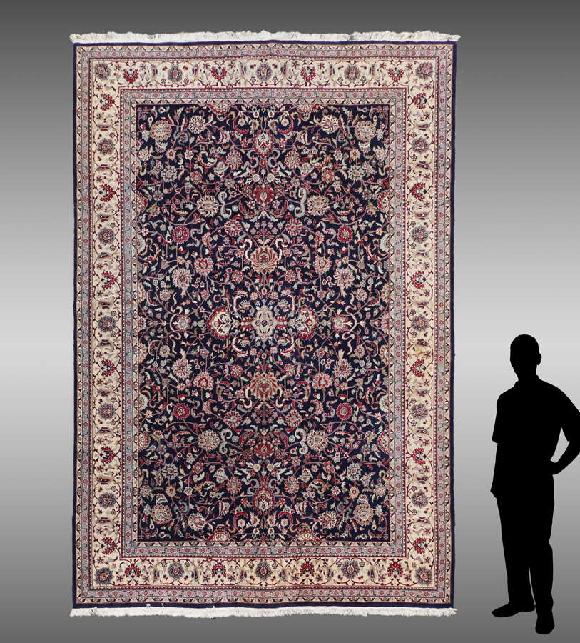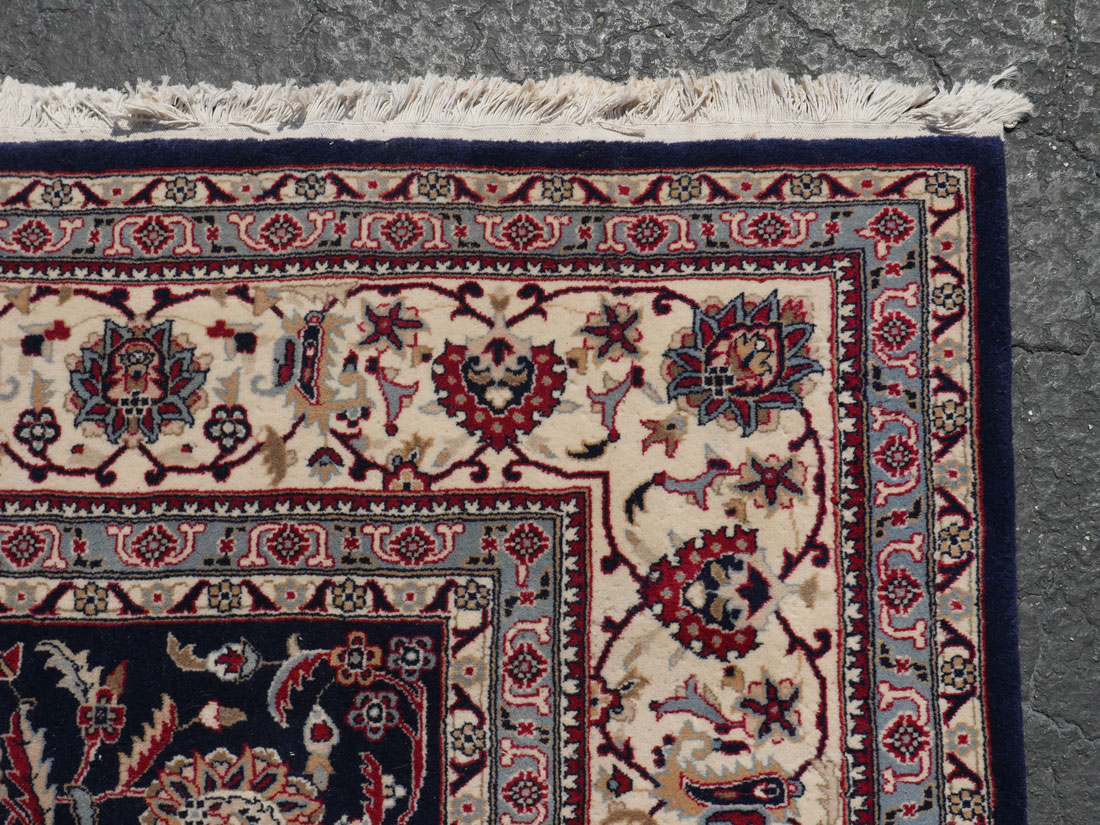 PERSIAN HAND KNOTTED WOOL RUG, 8'4'' x 11'3'': The midnight blue field is covered with a well-drawn, colorful traditional floral Persian design. Pale blue guard and ivory main border complete the rug.