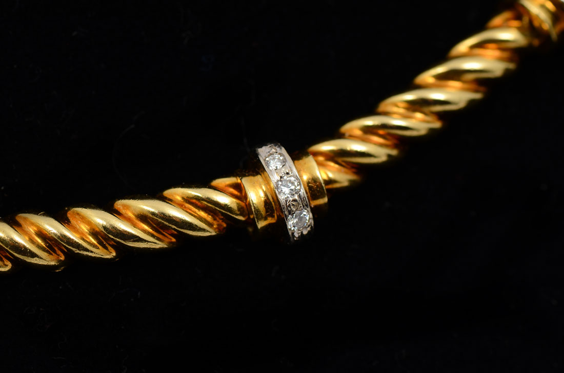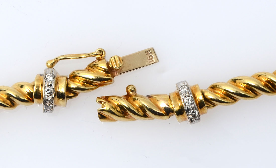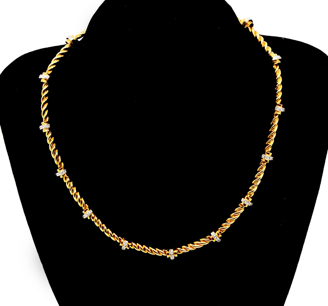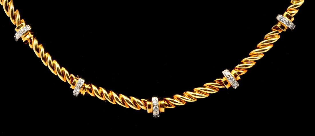 18K 0.84 CTW. DIAMOND NECKLACE: 18 karat yellow gold twist link and half-cylinder link necklace with 48 round full cut diamonds. WEIGHT: 0.84 ctw. approx. Rating is H-I in color and SI-1 to SI-2 in clarity. 46.4 grams.15'' in length.