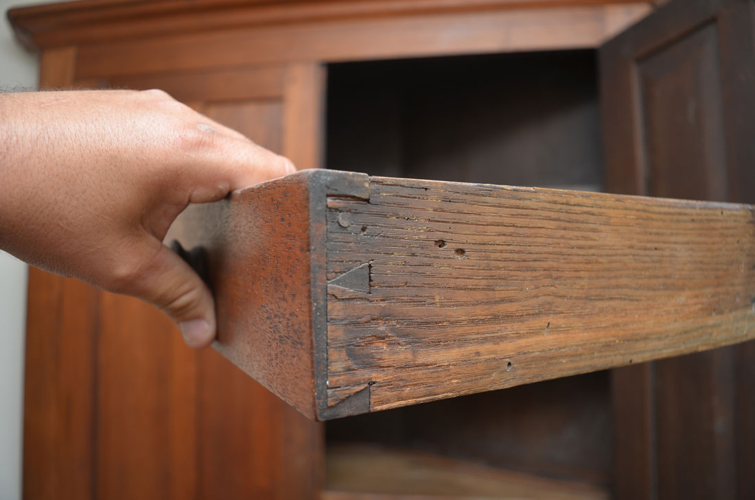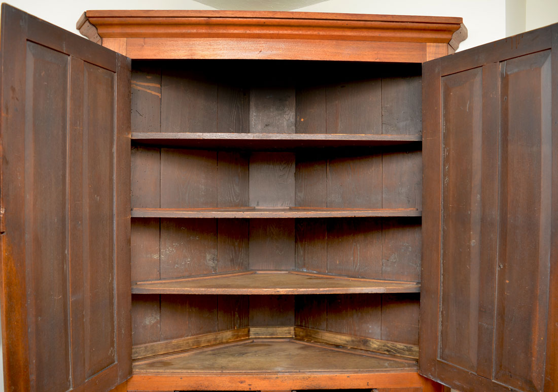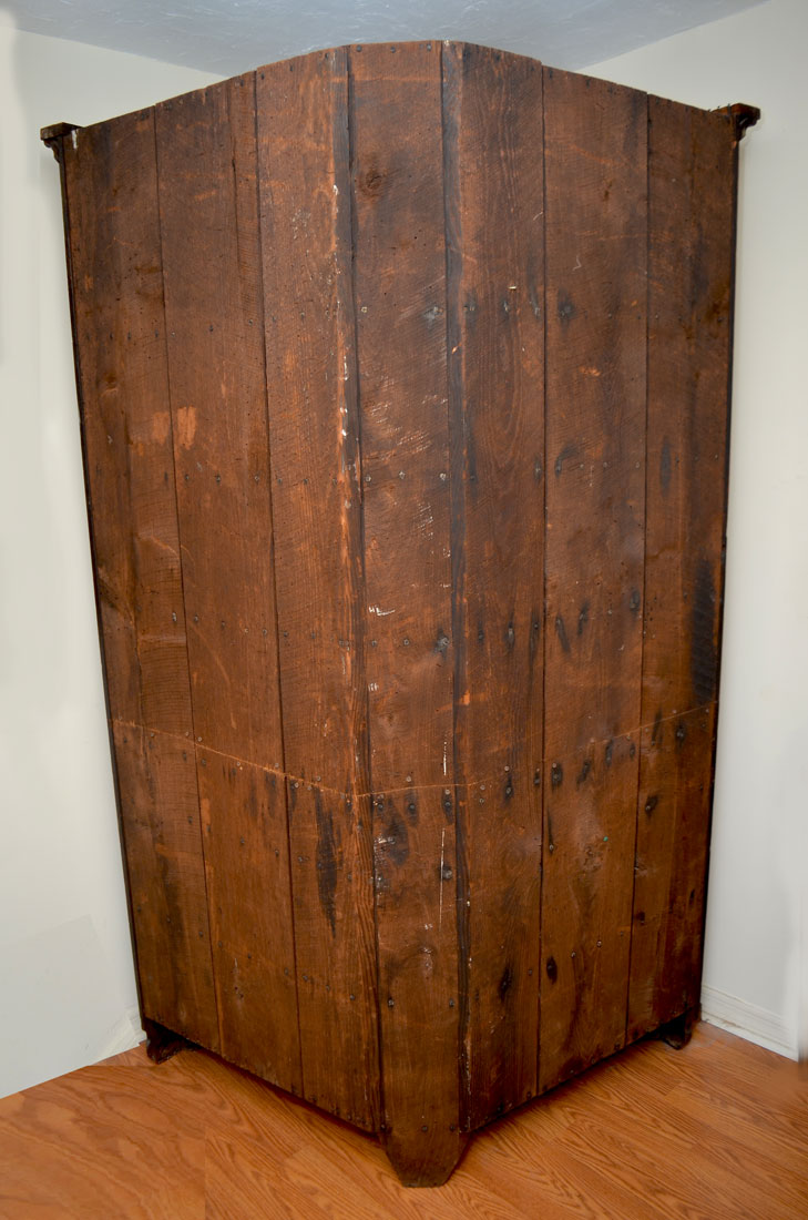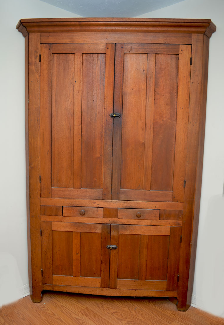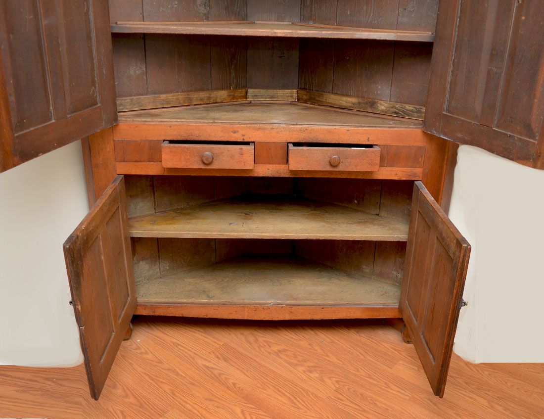 LARGE 19TH CENTURY AMERICAN PINE CORNER CUPBOARD: Larger than most, single piece, 2 blind doors with wood shelves over 2 drawers over 2 doors, canted corners, shaped feet. Overall measures 85 3/4'' h. x 58 1/2'' x 21 3/4''. Estate of William J. Murtagh, author and First Keeper of the National Register of Historic Places.