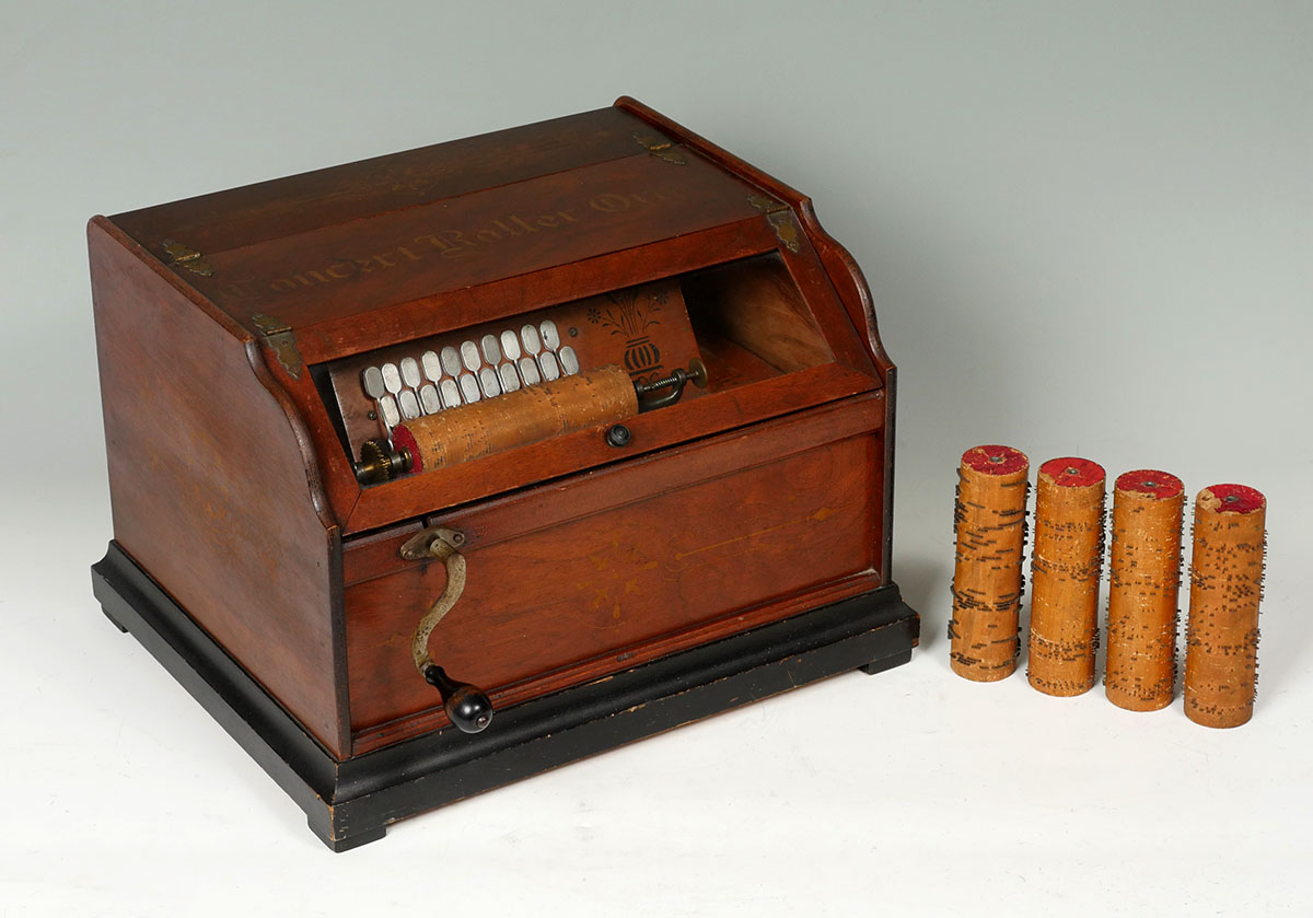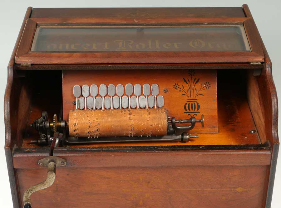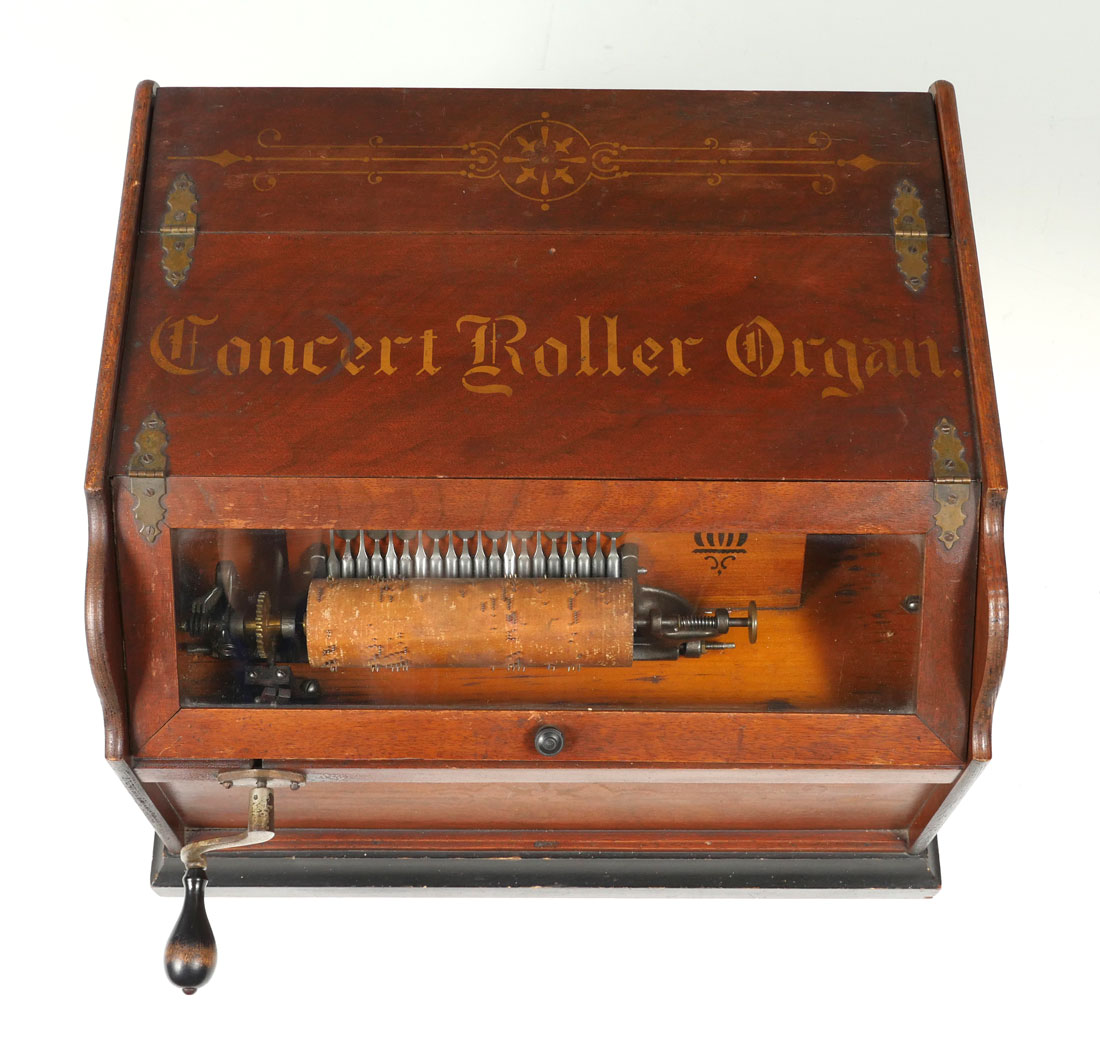 STENCILED OAK CONCERT ROLLER ORGAN: Hand crank Concert Roller Organ, oak case with stenciled marking and designs. Lift slant front with glass window. Sold with 5 cobs, bellows currently working fine. Overall 12 1/2'' h. x 17'' x 18 1/2'' with crank.