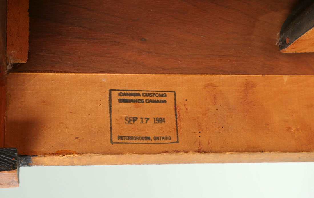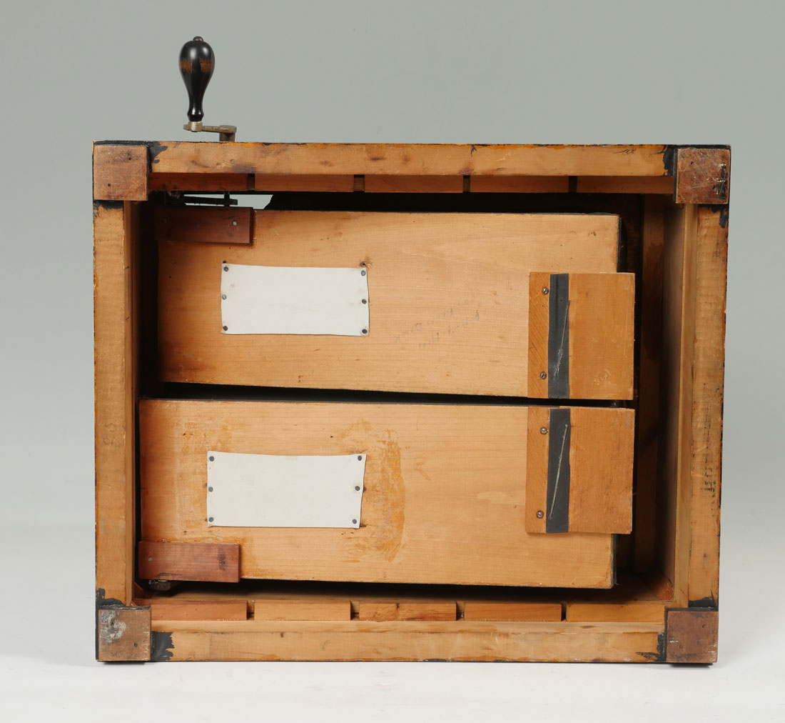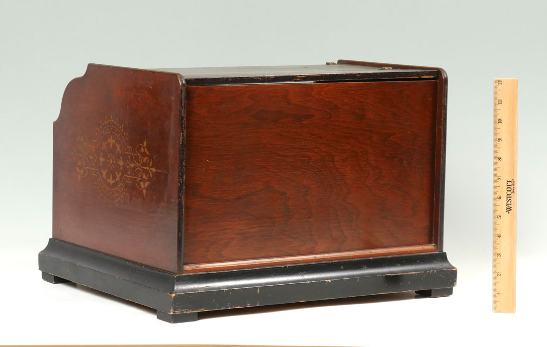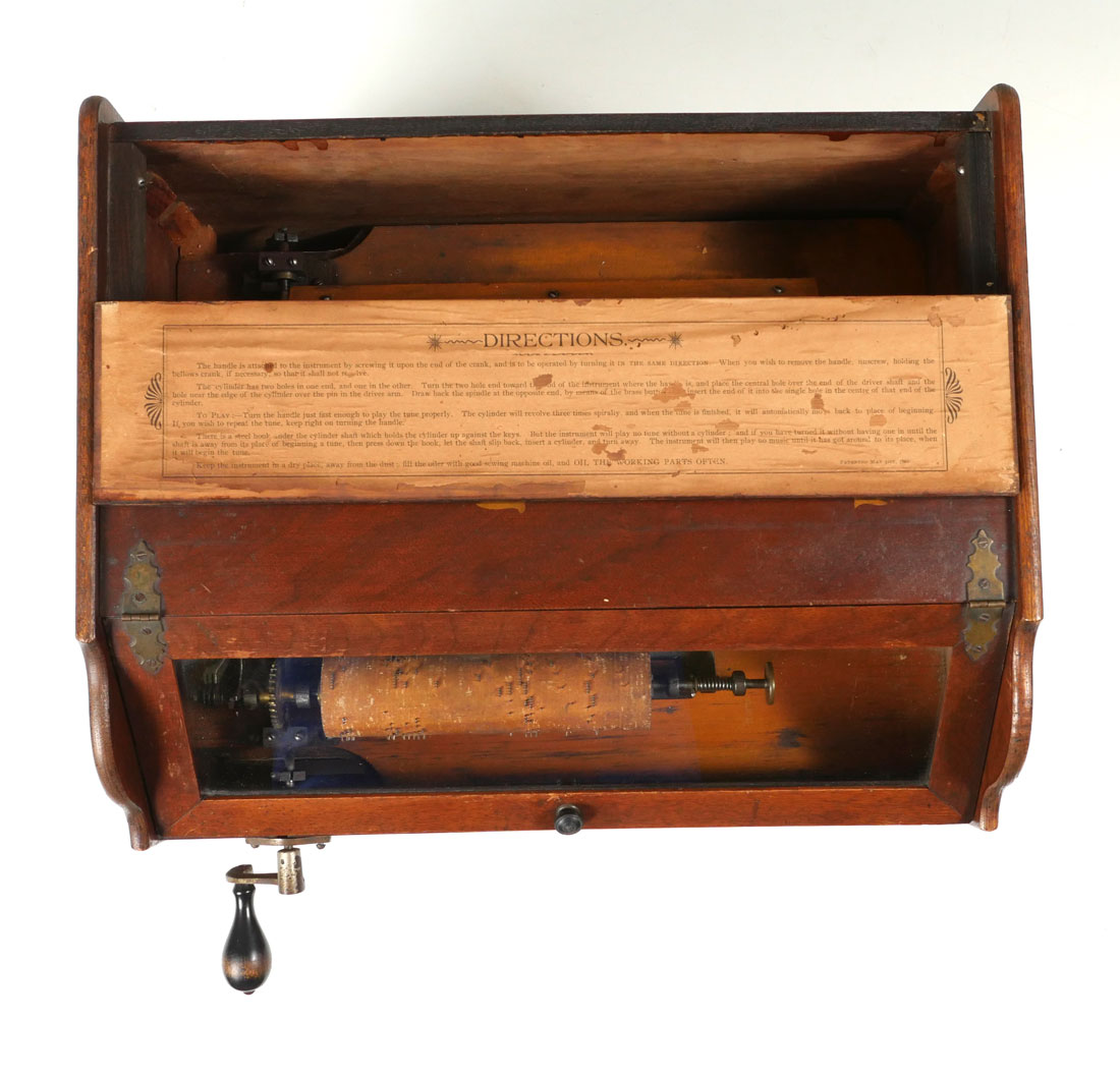 STENCILED OAK CONCERT ROLLER ORGAN: Hand crank Concert Roller Organ, oak case with stenciled marking and designs. Lift slant front with glass window. Sold with 5 cobs, bellows currently working fine. Overall 12 1/2'' h. x 17'' x 18 1/2'' with crank.
