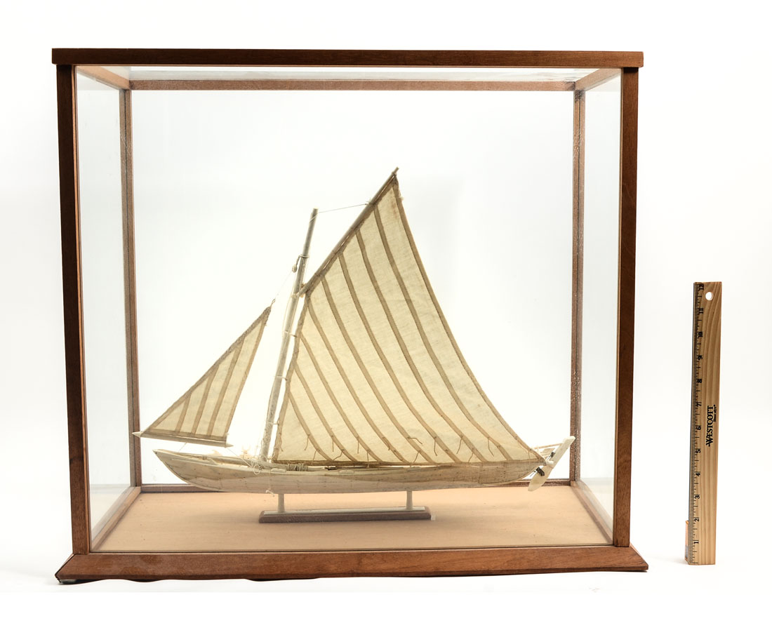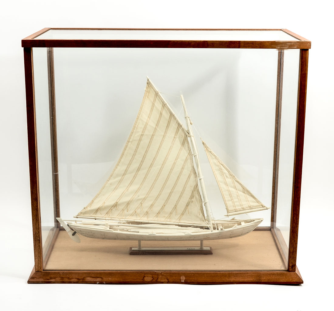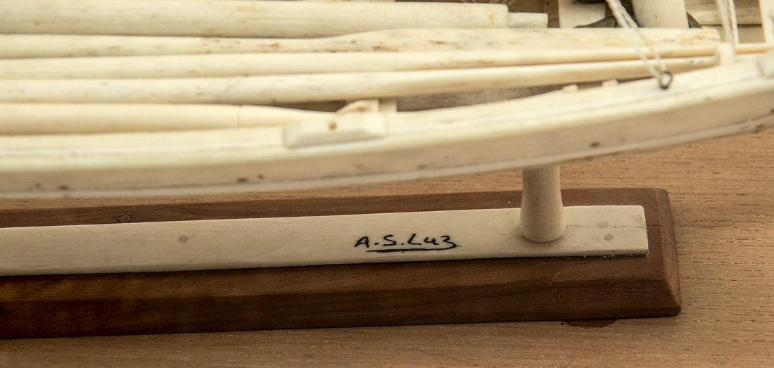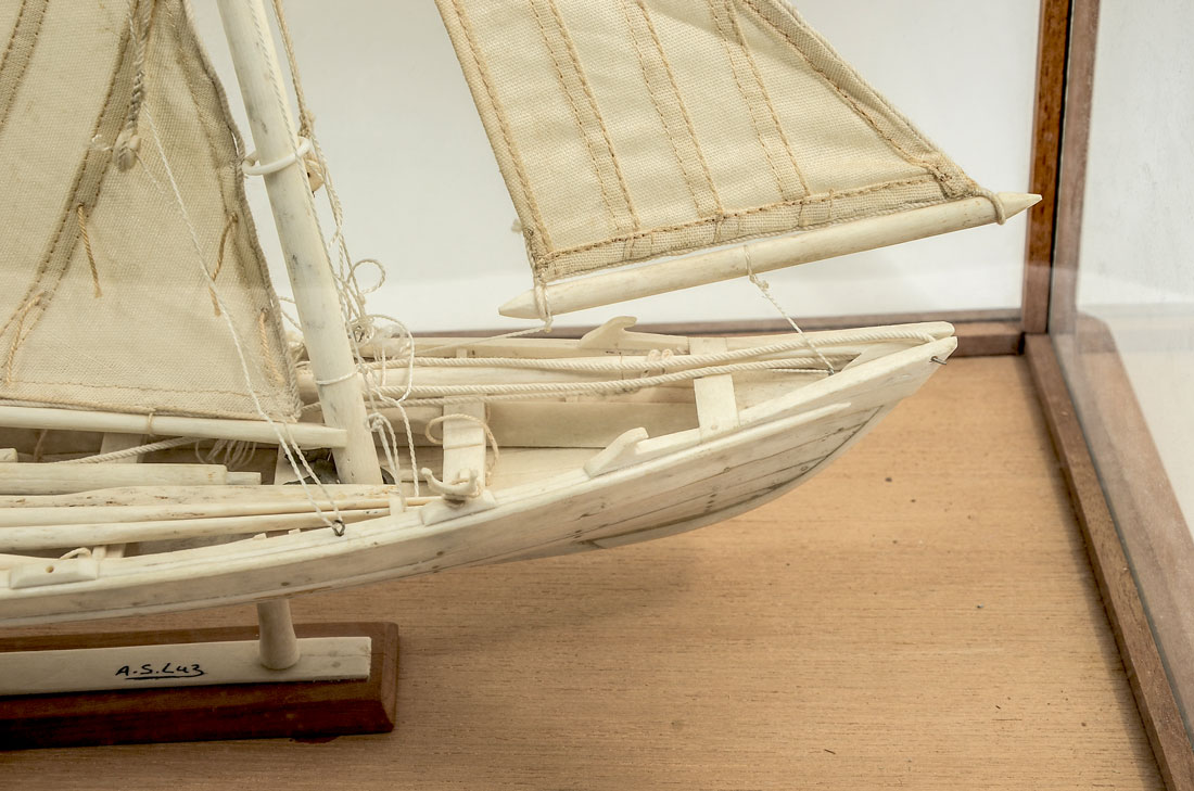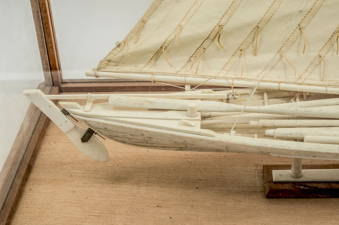 A.S. LUZ AZORES CARVED WHALE BONE BOAT: Circa later 20th century, model of a 19th century whaling vessel caved from whale bone and linen. Encased in glass display case, 23 1/2'' h. x 11 3/4'' x 9 1/4''.