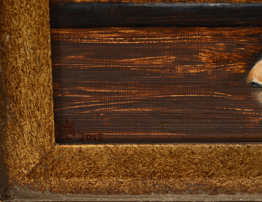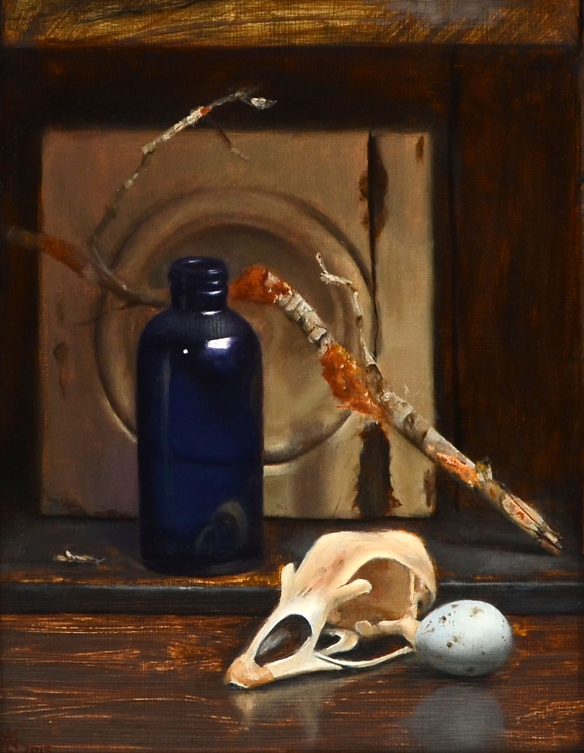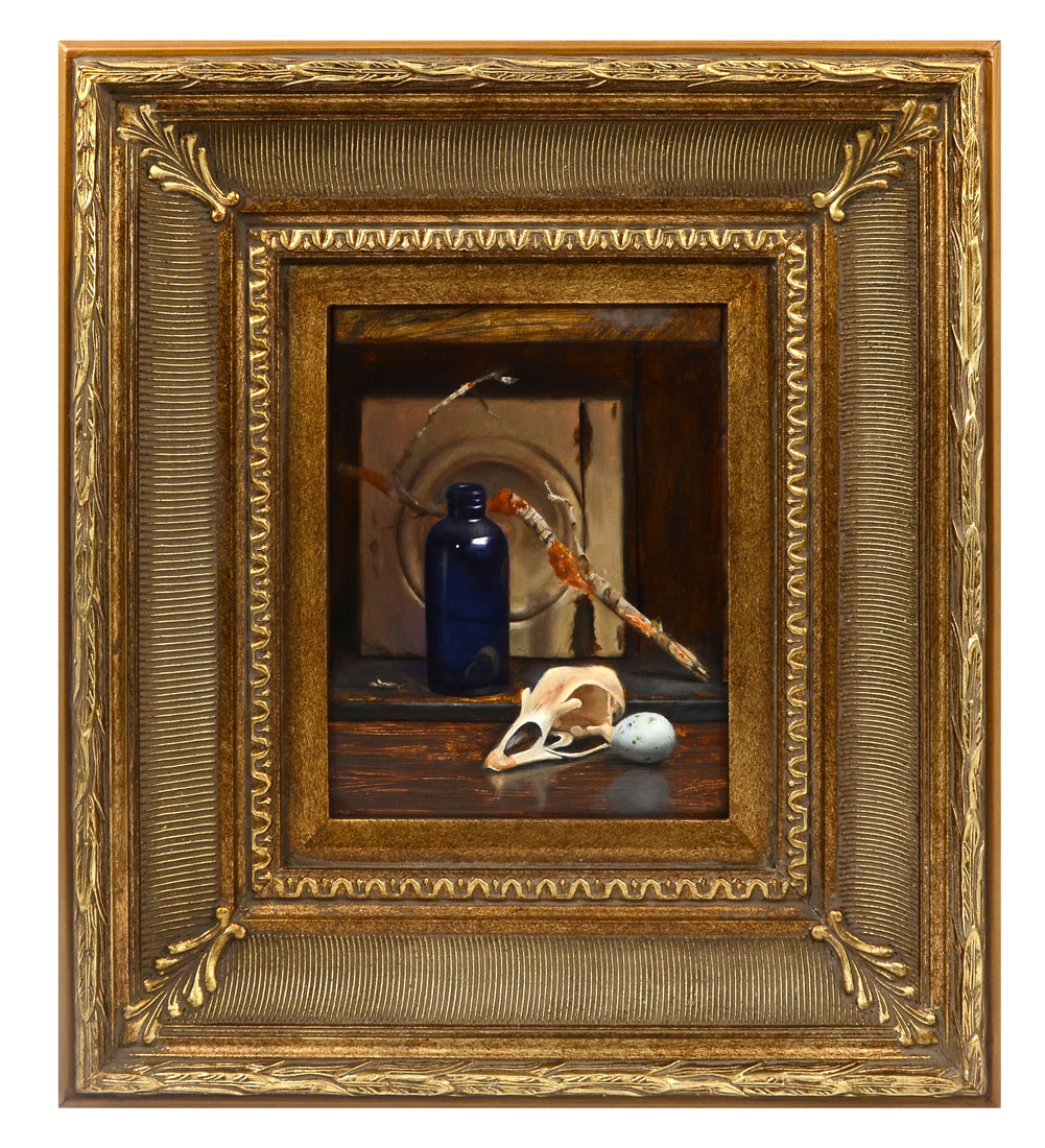 GLUCK, David, (American, 20/21st C.): ''Still Life with Bottle, Branch, Skull and Egg'', Oil/Glass, sight size is 9.50'' x 7.50'', signed lower left and dated 2015, fine custom framing is 19'' x 17.50''.