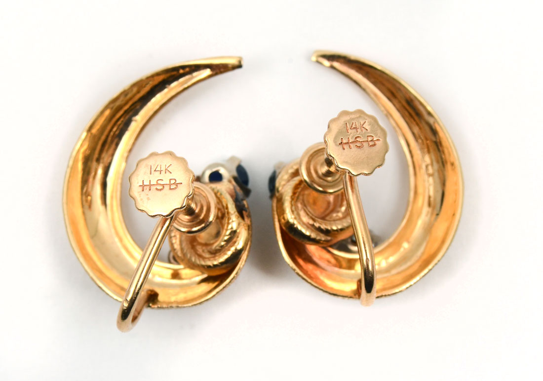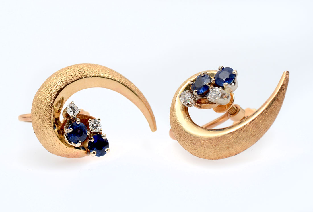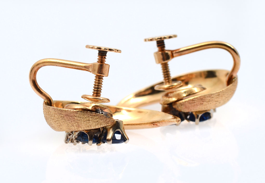 14K SAPPHIRE & DIAMOND EAR CLIPS: Designed by NYC jeweler Harry Bick & Son, a gentle wave of 14K yellow gold holds 2 sapphires and 2 diamonds each for a total .68 CTW. Weight 5.8 grams.