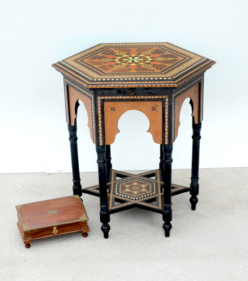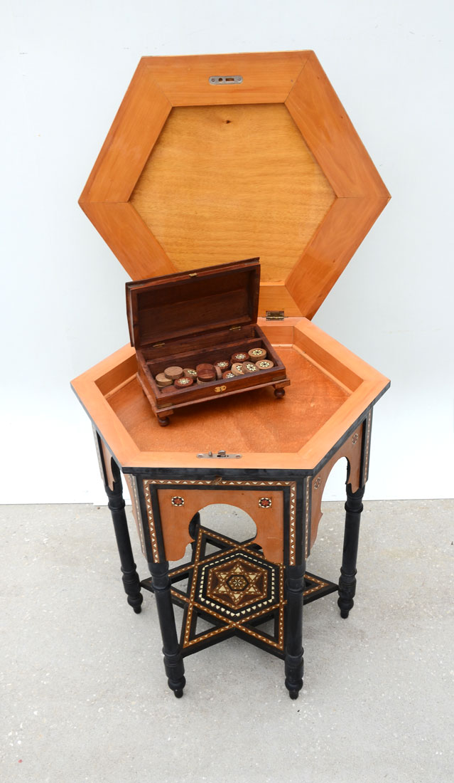MOORISH INLAID LIFT TOP SIDE TABLE: Profusely inlaid with bone and fruitwood Moorish parquetry design, 6 sided hinged lift top lifts to open inlaid, inlaid star stretcher, turned legs, overall 27'' h. x 22 1/2''. Sold with a small hinged lid box with inlaid game pieces.