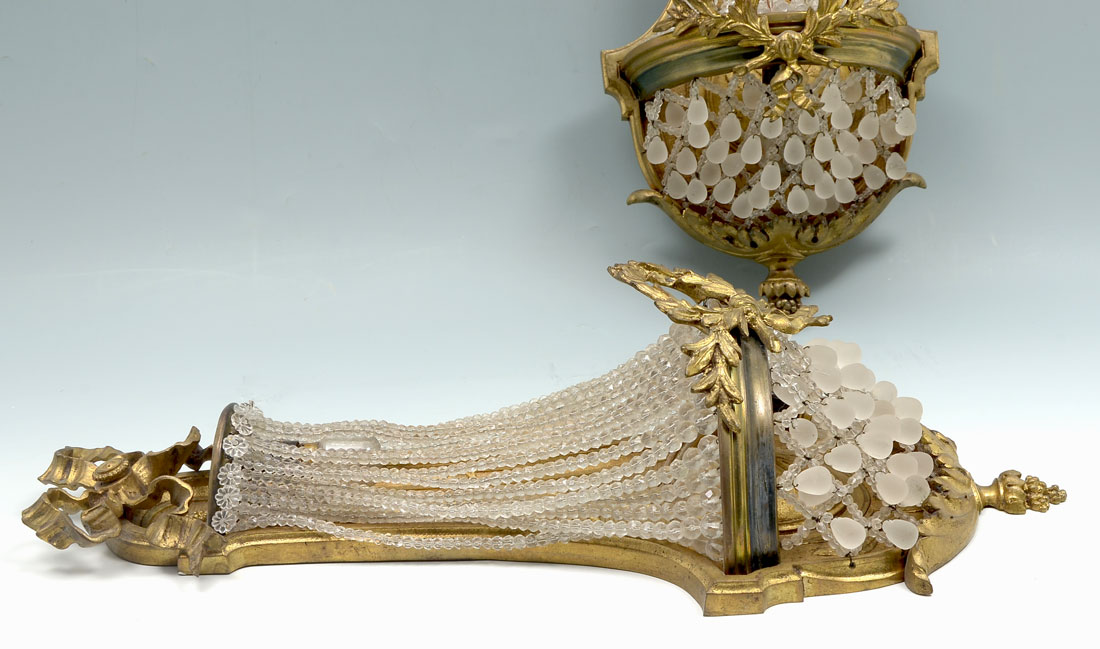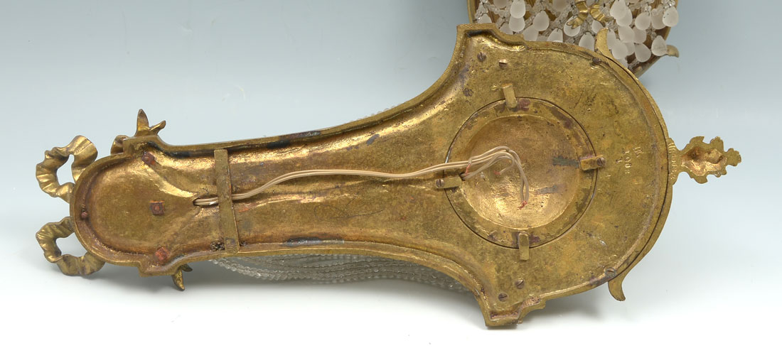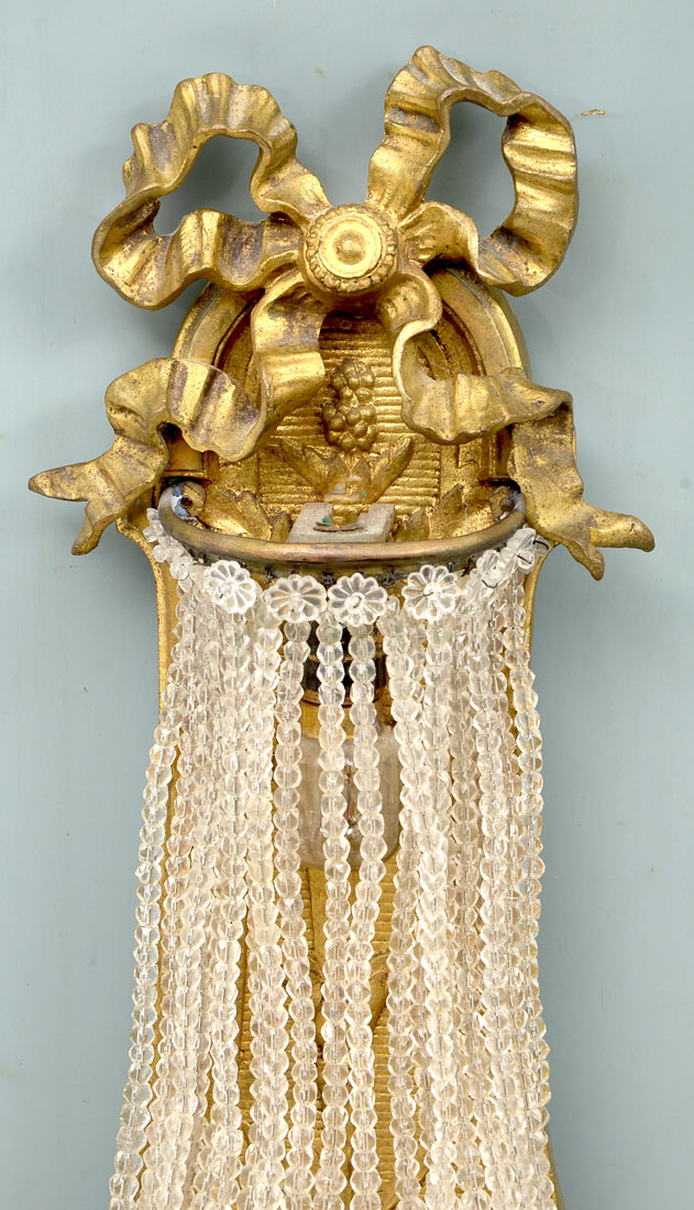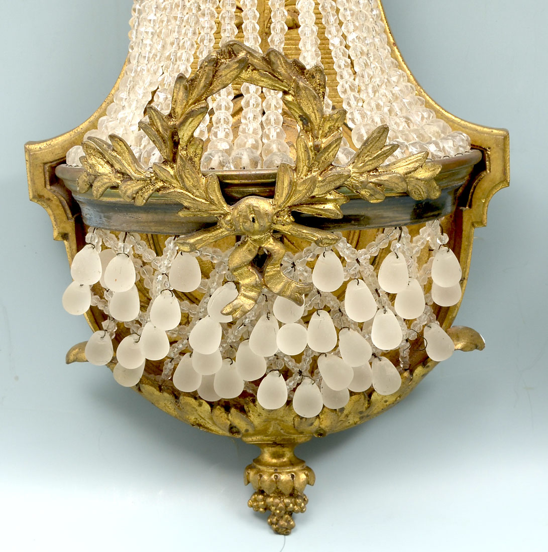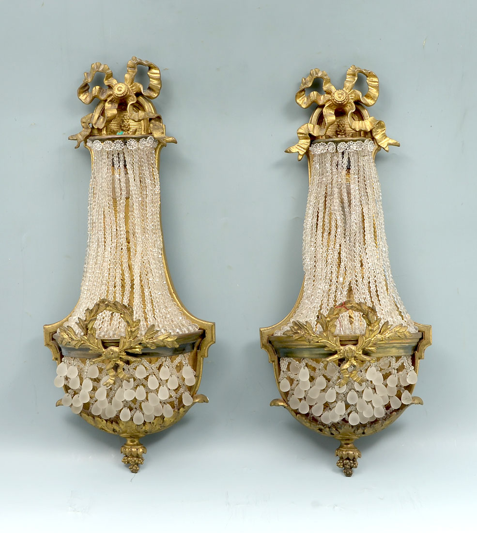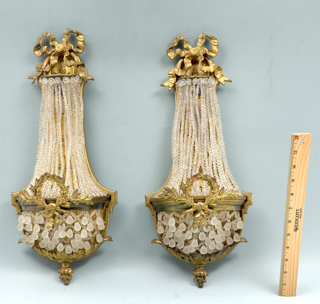 EARLY 20TH CENTURY GILT BRONZE FRENCH SCONCES: An elegant pair of Gilt Bronze French wall Scones decorated with stringed crystal beads and satin crystal drops. Wired for electric. Approx. 19'' h x 8'' l x 5'' w