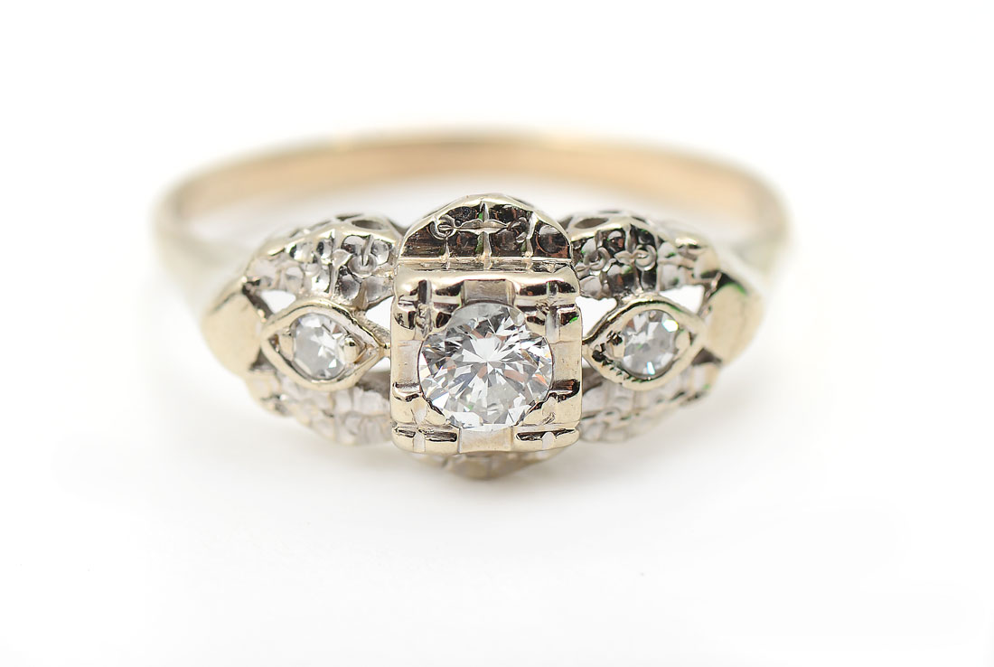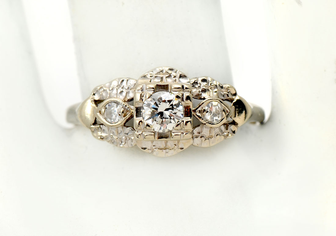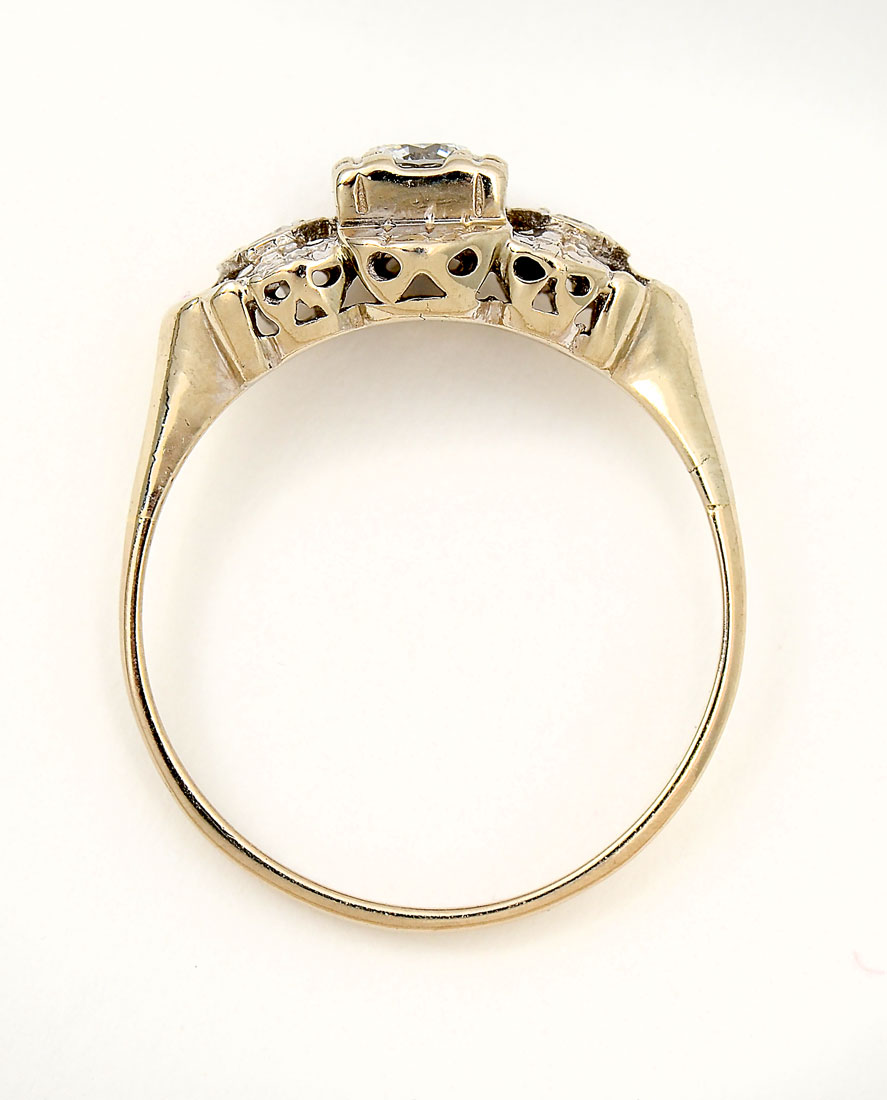14K & DIAMOND RETRO ENGAGEMENT RING: A single circular brilliant cut diamond is SI in clarity and H in color and is flanked by 2 single cut diamonds. Size 7.25. Weight 2.48 grams.
