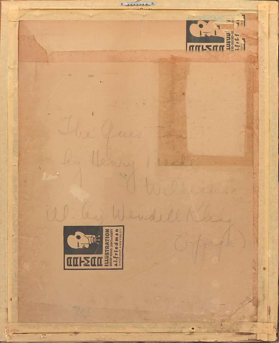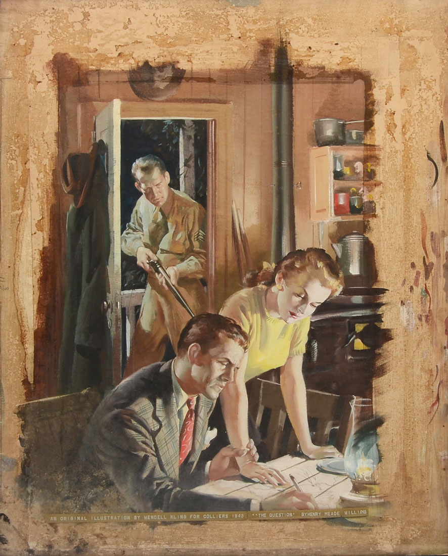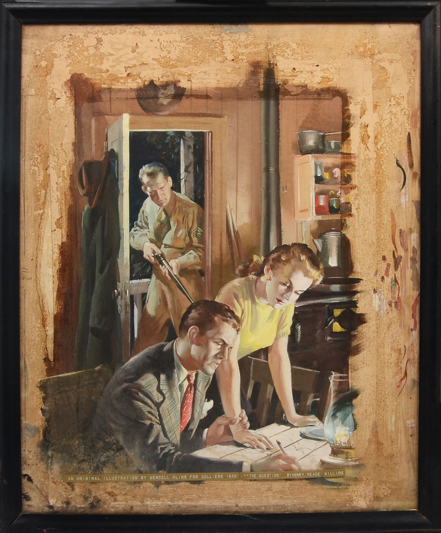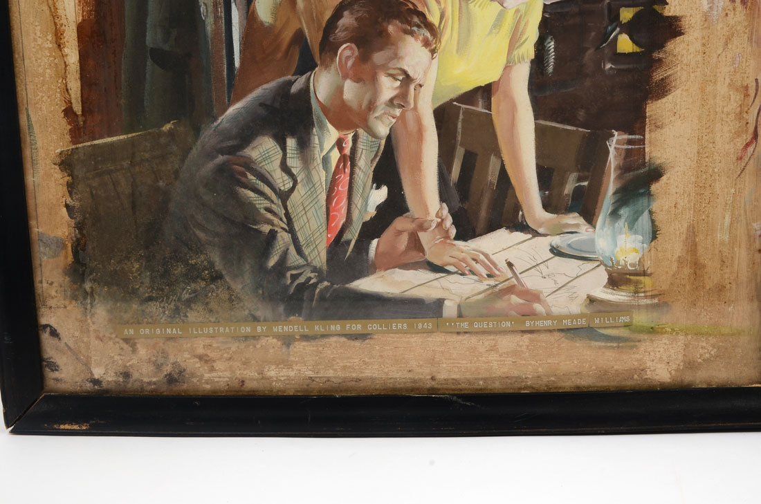 KLING, Wendell, (American, 20th Century): Original Illustration by Wendell Kling for Collier's 1943 ''The Question'' by Henry Meade Williams, Gouache, image size is approximately 18'' x 14'', sight size is 23.50'' x 19'', signed lower right, notations verso, framed 25.50'' x 21.50''.
