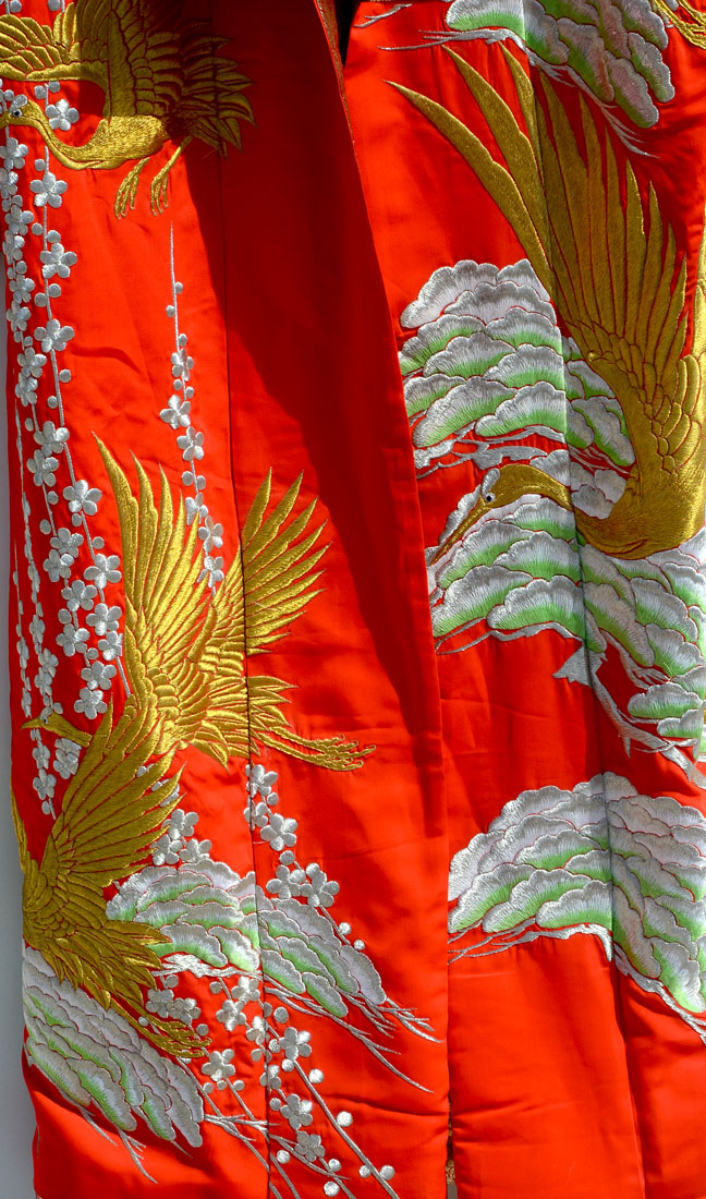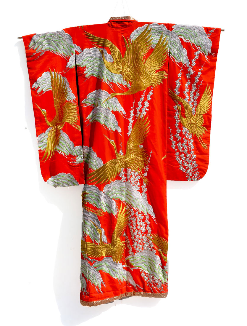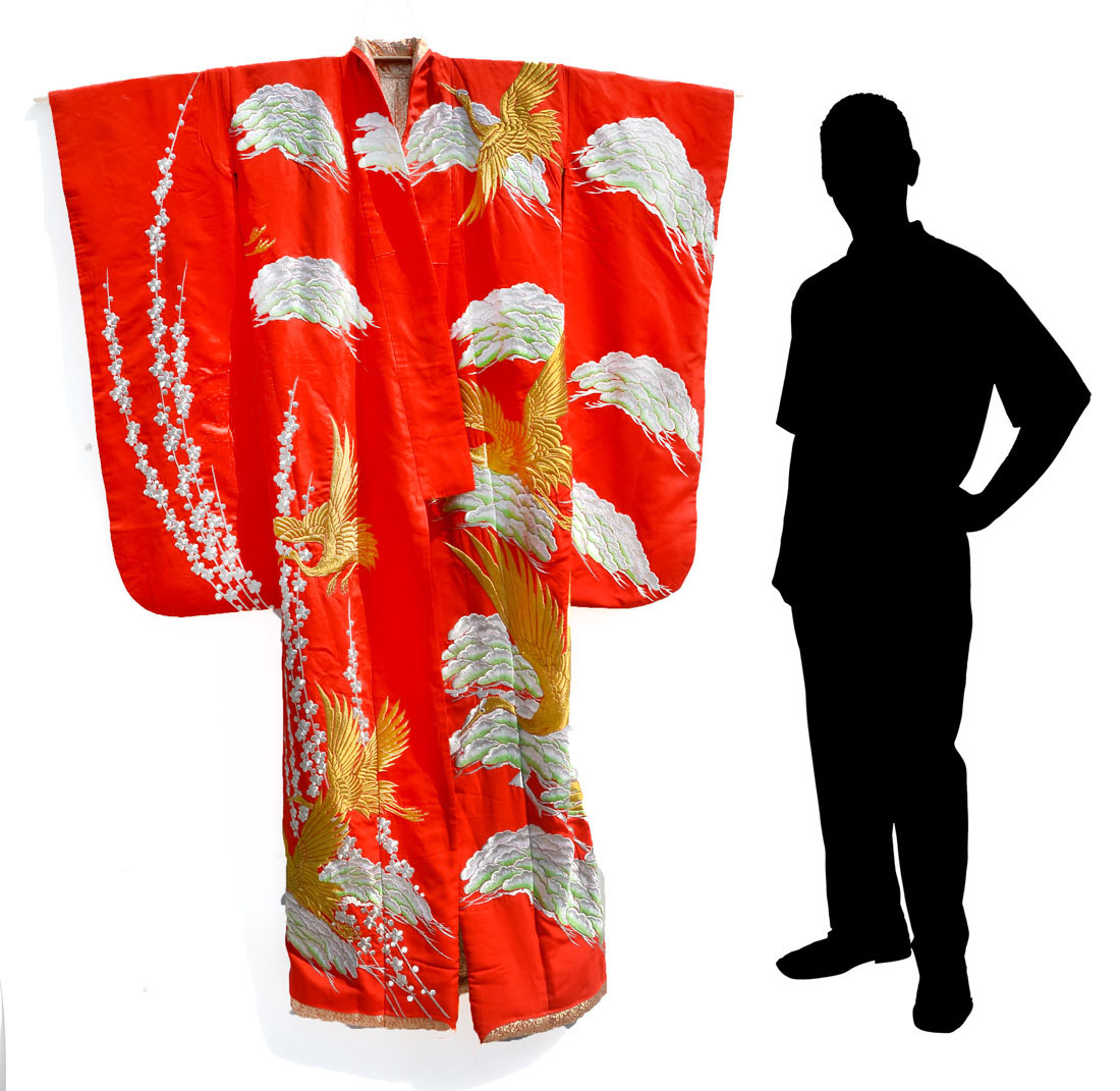 MID-CENTURY JAPANESE SILK CEREMONIAL KIMONO: Japanese Ceremonial Kimono made of silk with gold flying cranes foreground on a silver & green blossoming tree background. Interior has a gold on red floral pattern and a flared bottom. Stitched with gold, silver, and copper wrapped silk. Approx. 73'' h x 51'' l.
