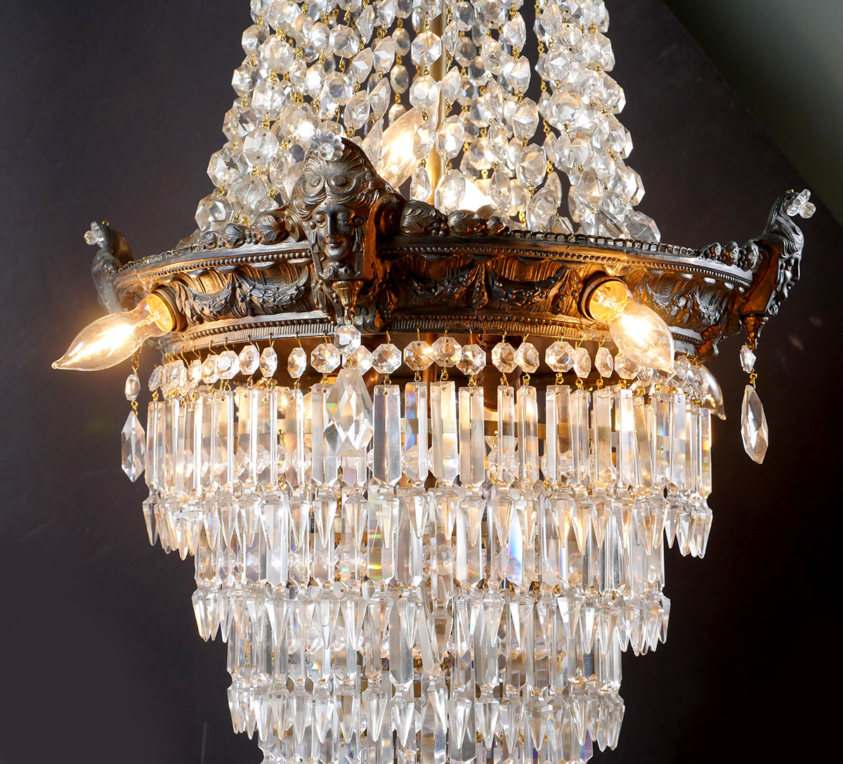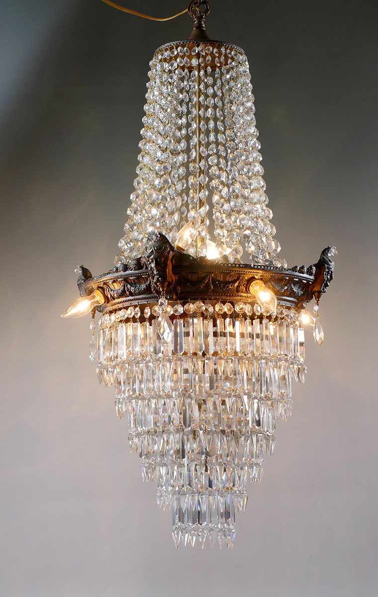 CRYSTAL AND BRASS WEDDING CAKE CHANDELIER: Draped multi-faceted crystal strings above second rim decorated with Masqueron faces and draped wreath design between. 6 diminishing tiers of arrow head crystals. Approx. 44'' h x 24'' w.