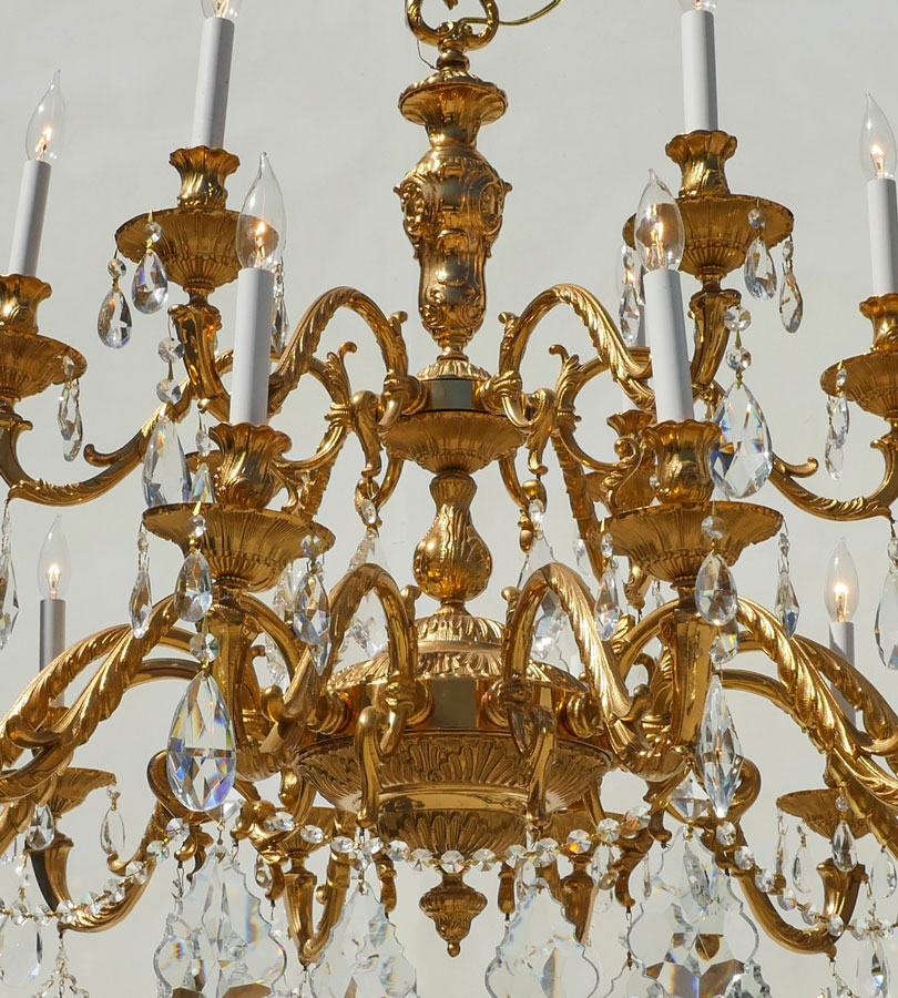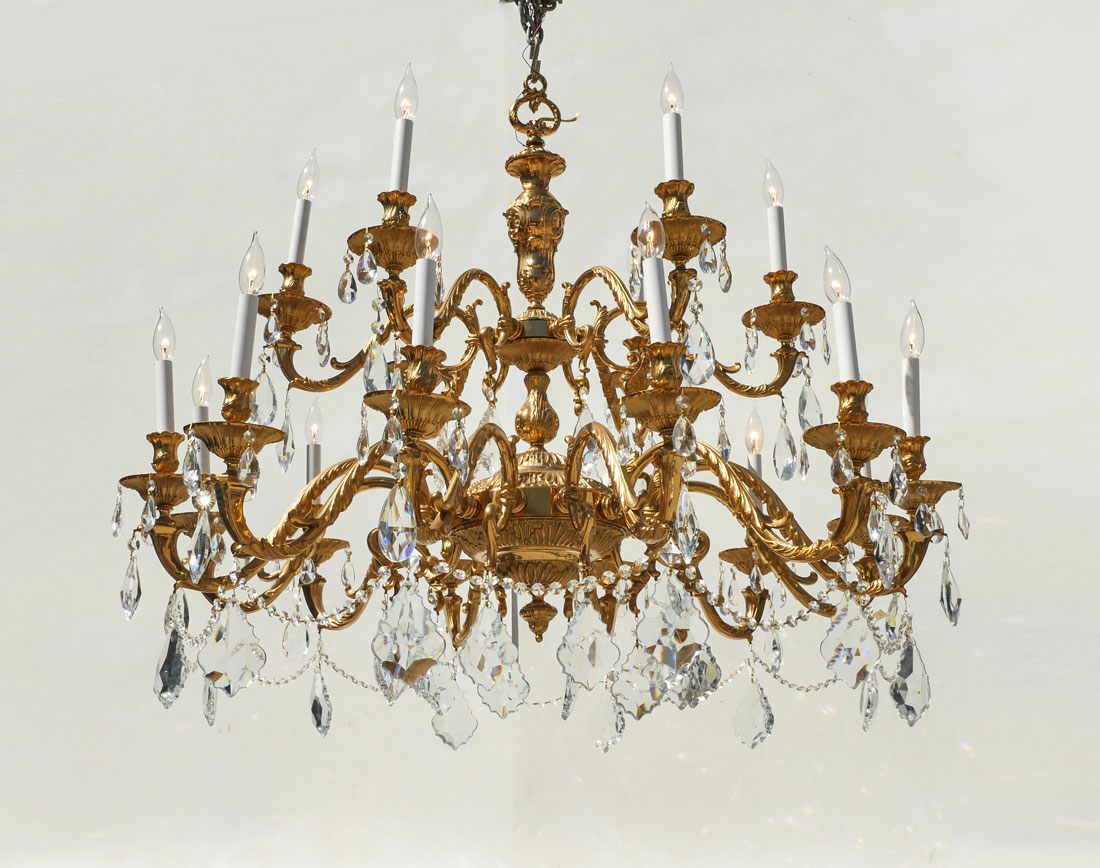 LARGE BRASS AND CRYSTAL CHANDELIER: 2 tier 18 Light scrolling foliate framework adorned with multi-faceted crystals on both tiers and faux candles. Multi-faceted crystals also reside on the bobeche. Approx. 34'' h x 45'' w.