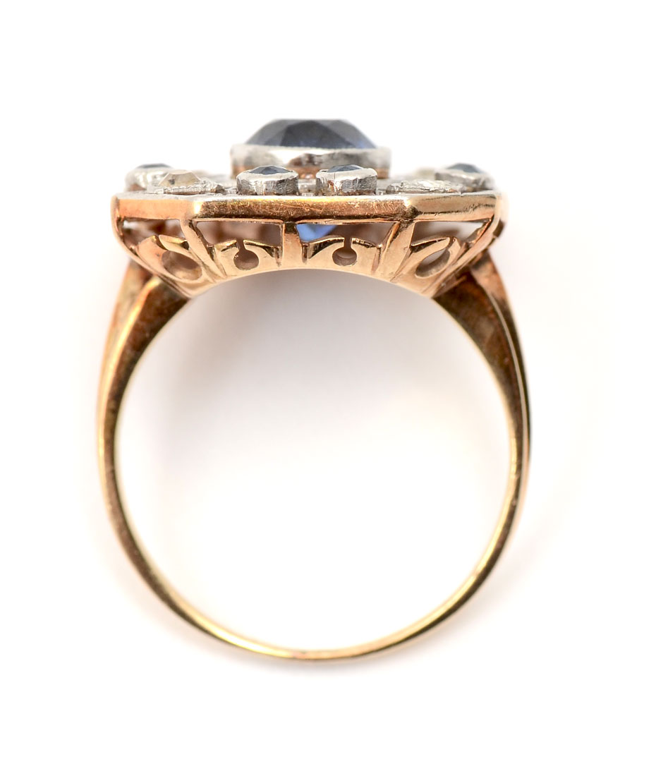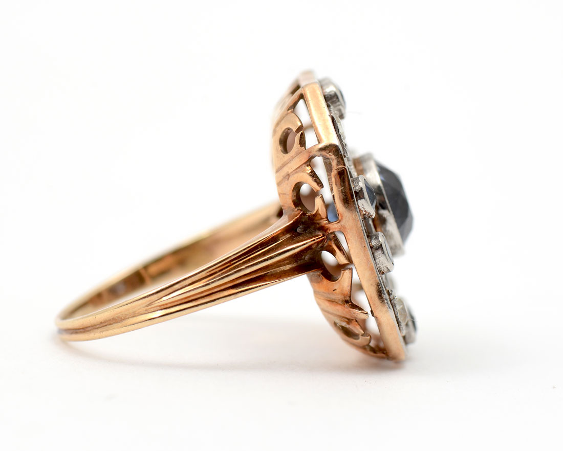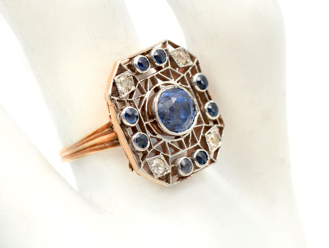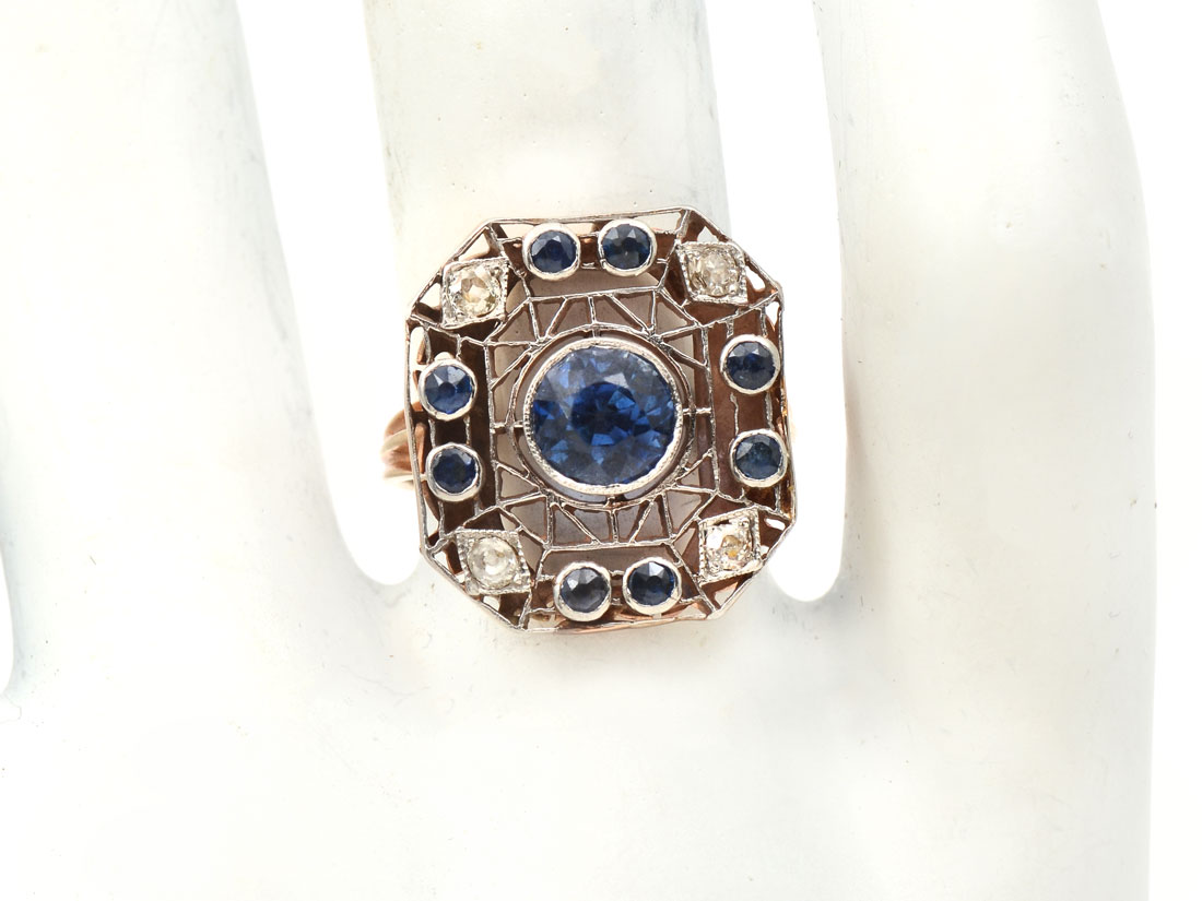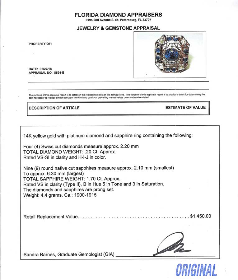 VINTAGE 14K SAPPHIRE & DIAMOND RING: 9 round native cut sapphires approx 1.70 CTW are featured and set into filigreed platinum with 4 Swiss cut diamonds. Total gemstone weight approx 1.90 CTW. CA 1900-1915. Size 5.5. Sold with current Florida Diamond Appraisers GIA graduates appraisal $1450.