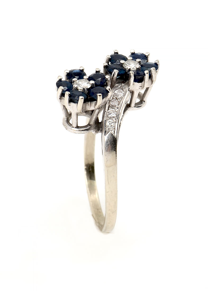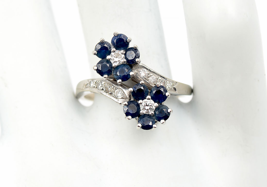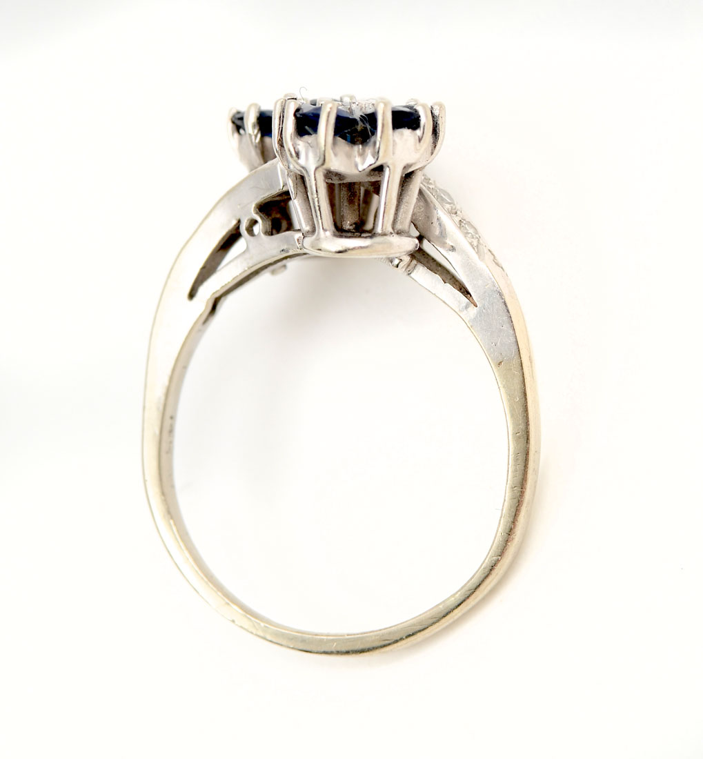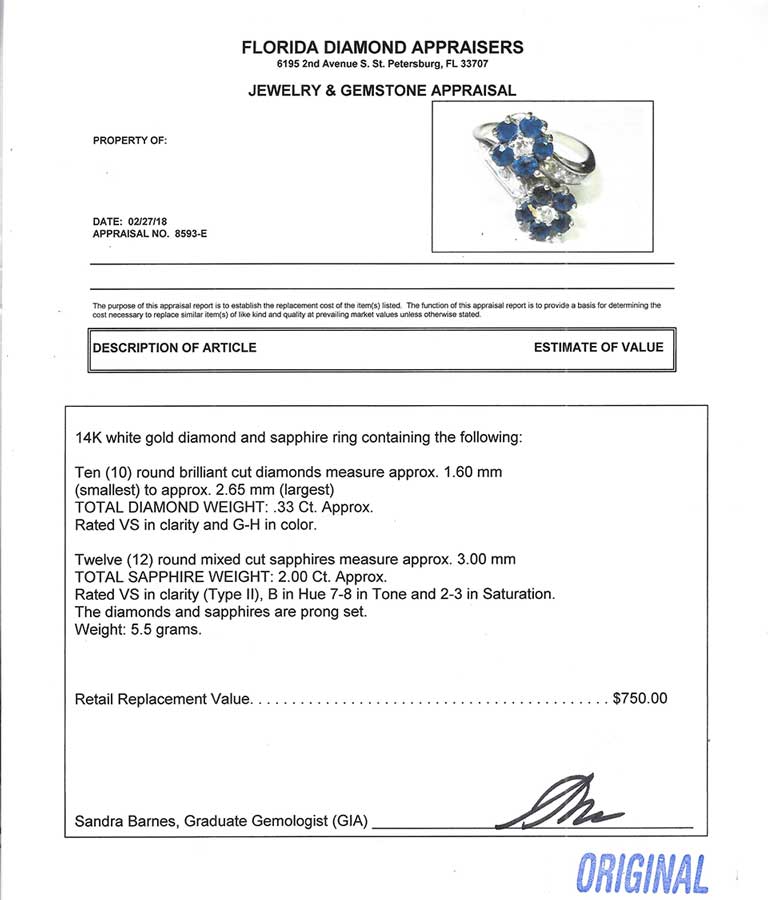 14K SAPPHIRE & DIAMOND RING: 12 round mixed cut sapphires form sweet flowers with 2 diamonds accenting the center and 8 diamonds cascading down the shoulders. Sapphires approx 2.00 CTW and diamonds approx .33 CTW. Size 8.75. Weight 5.5 grams. Sold with current Florida Diamond Appraisers GIA graduates appraisal for $750.