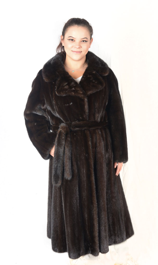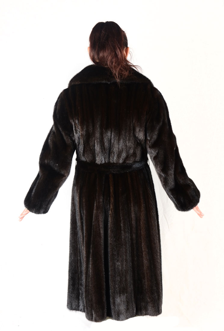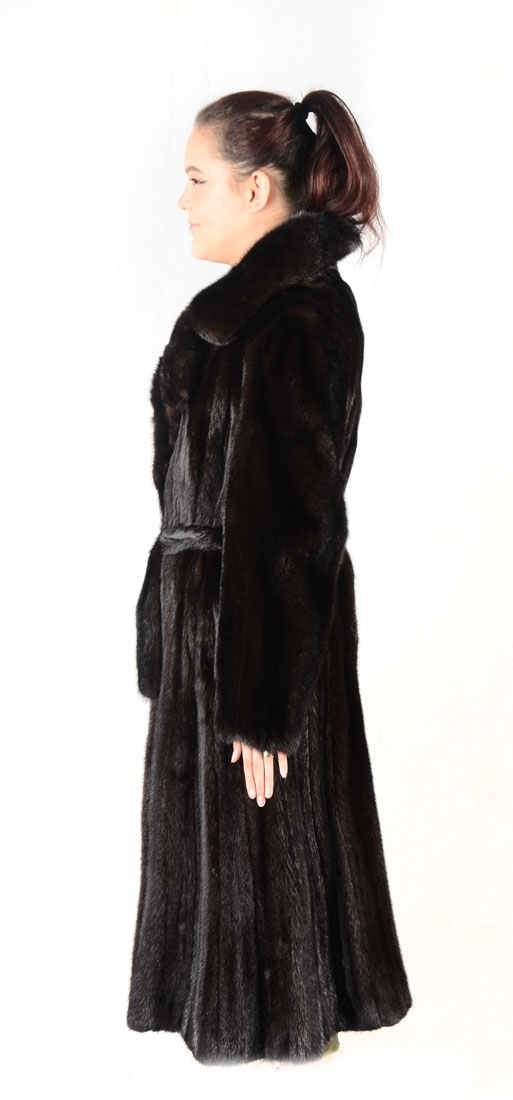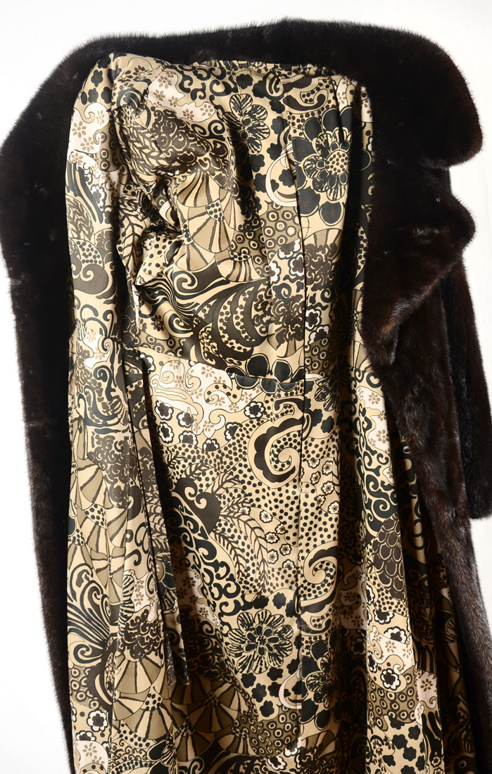 VINTAGE FULL LENGTH BLACK GLAMA FUR COAT: Beautiful full length Black Glama coat has a lining that is very attractive and distinctive. Lining has no labels or embroidered initials. 2 hook and eye closures in the front and fur belt at the waist. Approx size 8-10.