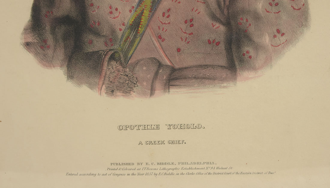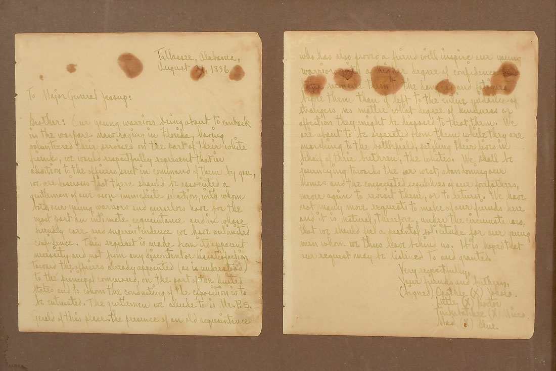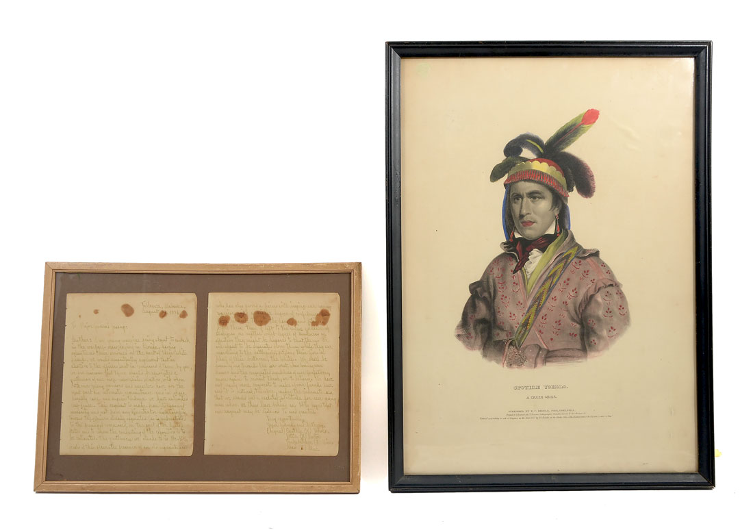1836 FLORIDA SEMINOLE WAR OPOTHLE YOHOLO LETTER TO GENERAL JESUP: Hand written letter by interpreter from Opothle Yoholo, Leader of the Upper Creeks; Little Doctor; Tuckabatchee Micco; and Mad Blue to Major General Tomas Jesup (misspelled Jessup), regarding the request to send Creek warriors to fight with the US government against the Seminole Indians in Florida. 2 page letter signed with an X, names added later by letter writer. Each page 8'' x 6 1/2'', framed 11 1/2'' x 16''. Sold with hand tinted McKinney & Hall portrait of Yoholo, published by E. Biddle, sight size 20 1/4'' x 14 1/2'', framed 22'' x 16''.