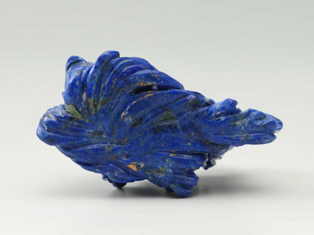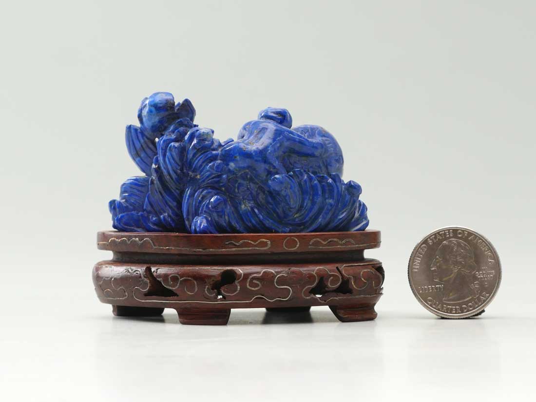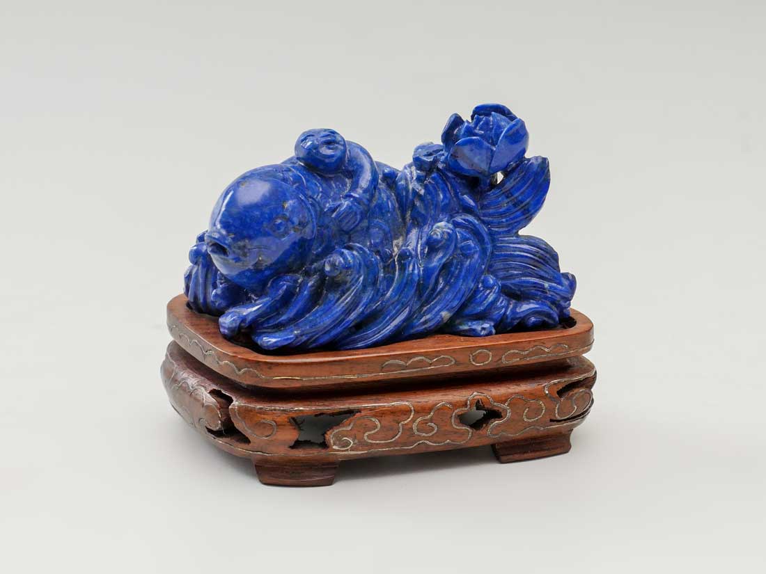 CHINESE CARVED LAPIS LAZULI FISH WITH RIDER: Small carved figural group of a fish in waves with small boy riding on back, 1 1/2'' h. x 2 1/4''. Sold with fitted wood base.