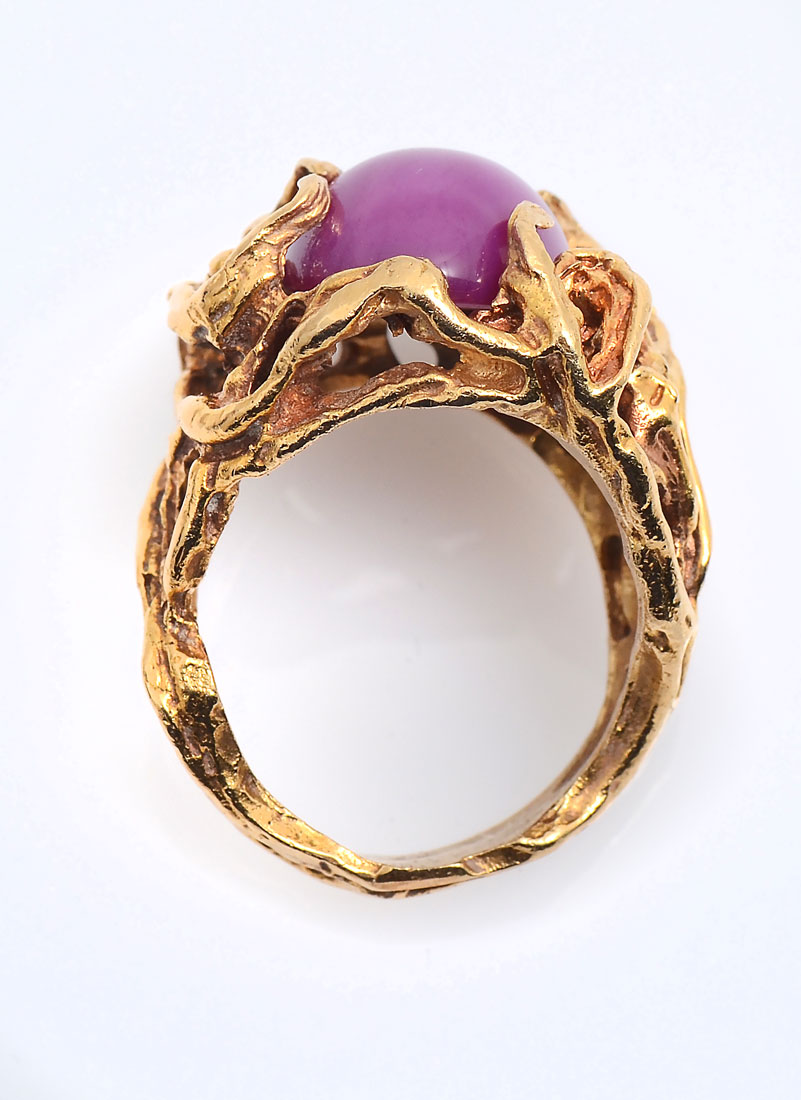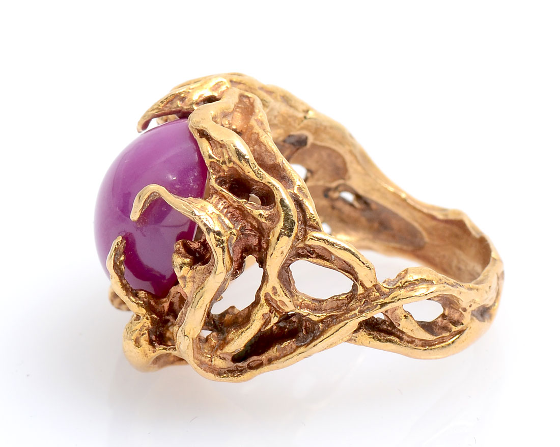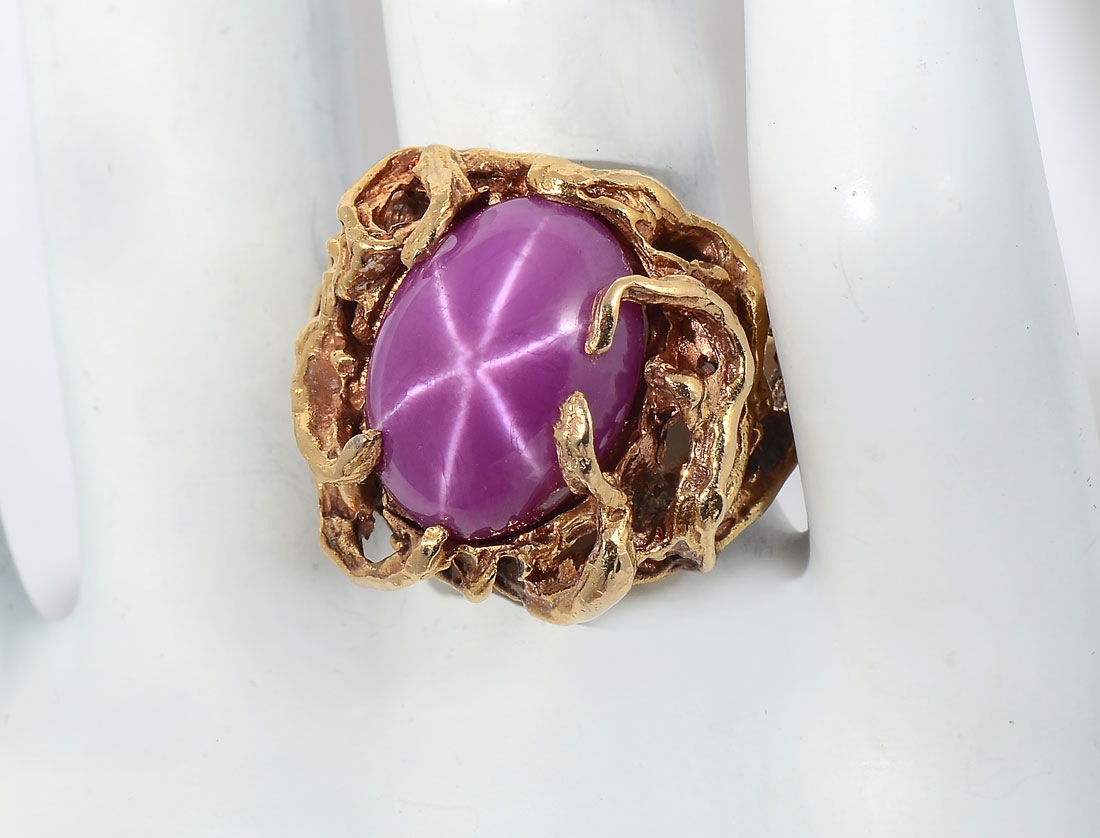 14K CABACHON STAR SAPPHIRE RUBY RING: 14k yellow gold with a large ruby star sapphire and custom band in a nugget design. Size 7. Weighs 15.6 grams.