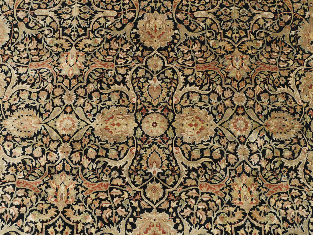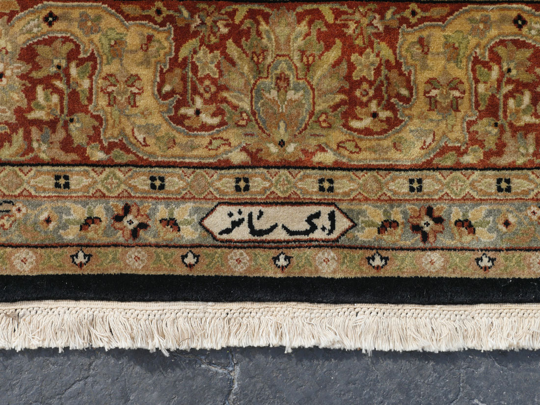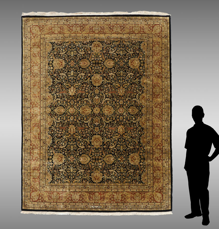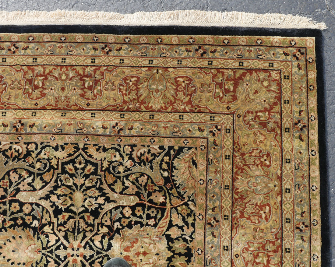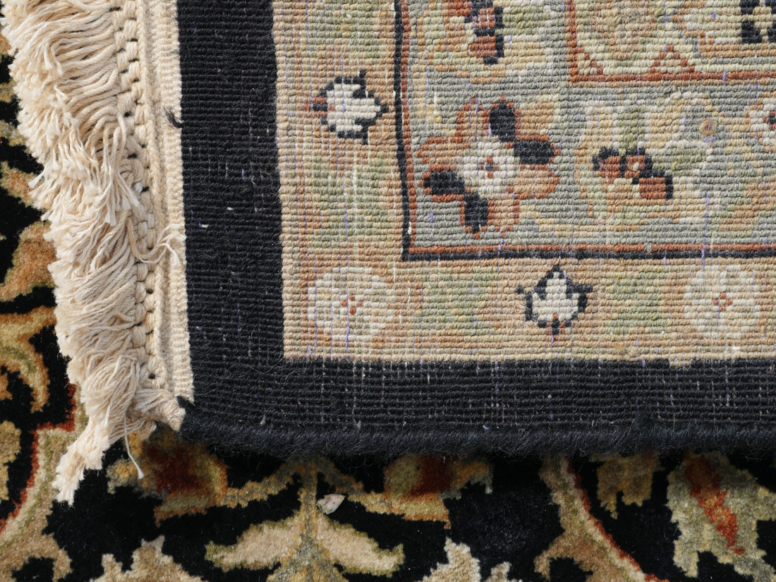 AMERICAN KARASTAN MACHINE MADE WOOL RUG, 7'1'' X 9'11'': This pretty rug has a Persian design complete with a date cartouche at one end. Black, pale yellow, and ivory colors are used in the intricate design on the black field.