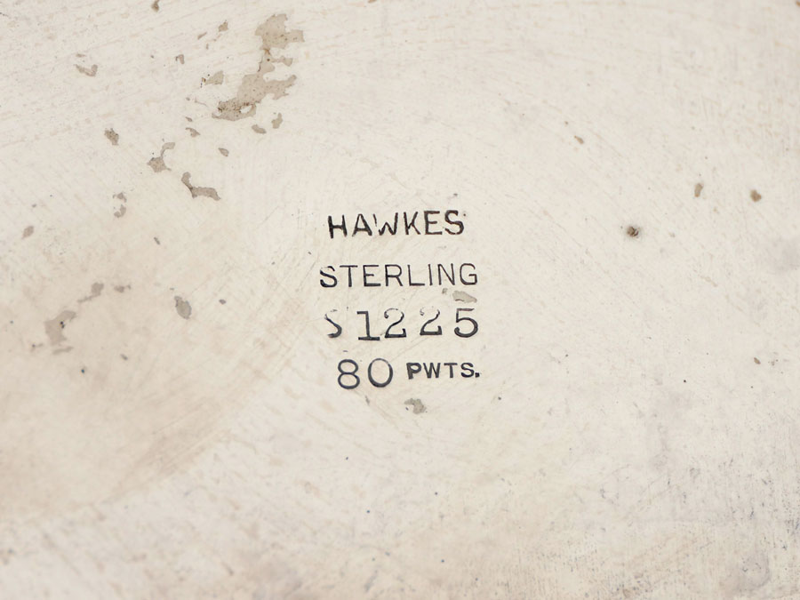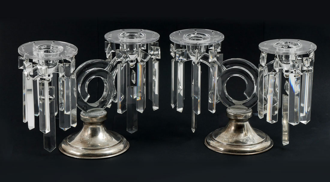 PAIR OF HAWKES PRISIMED CANDELABRA ON STERLING SILVER BASE: Art deco Hawkes crystal mounted in Sterling Silver bases, with removable Bobeche and attached prisms. Stamped under base, Hawkes Sterling. Approx. 8.25'' h x 11'' l x 5.25 w.