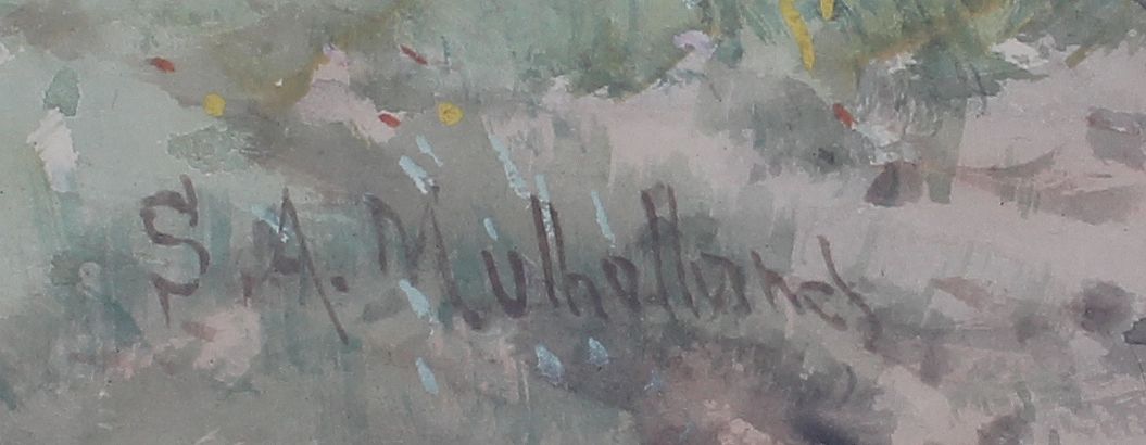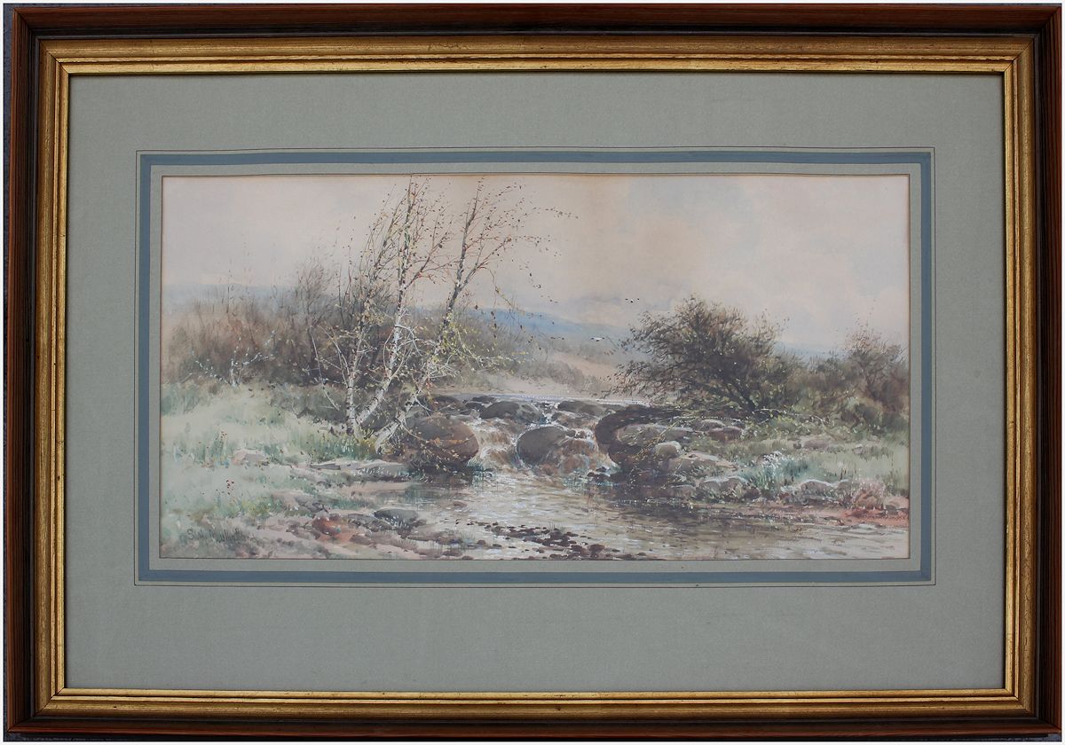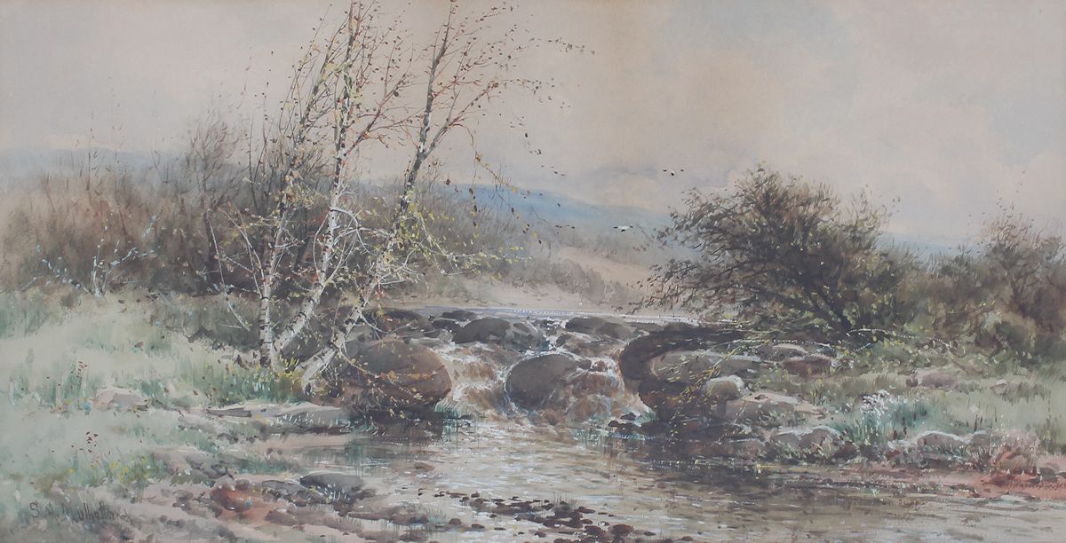 MULHOLLAND, Saint Clair Augustin, (American, 1839-1910): Fall Landscape with Birches by a Bubbling Stream, Watercolor, sight size 11.5'' x 23.5'', signed lower left, framed, 21.5'' x 32.5''.