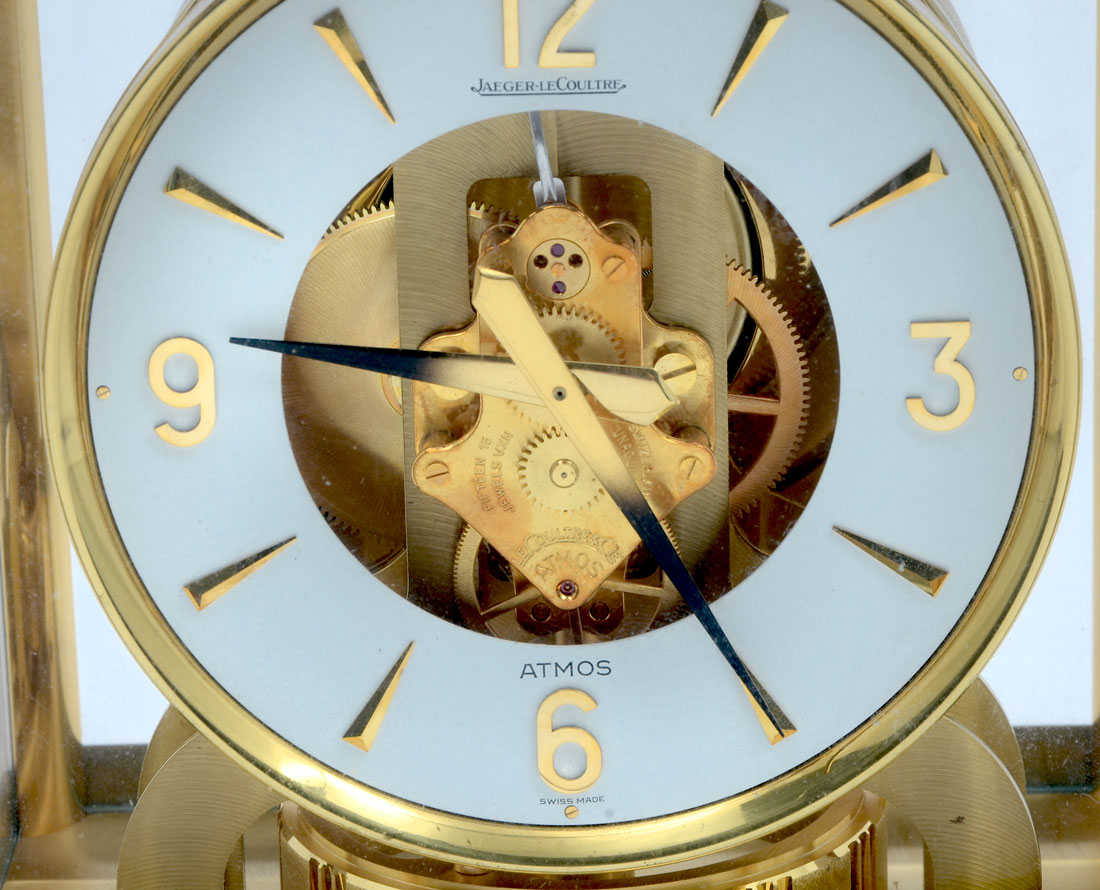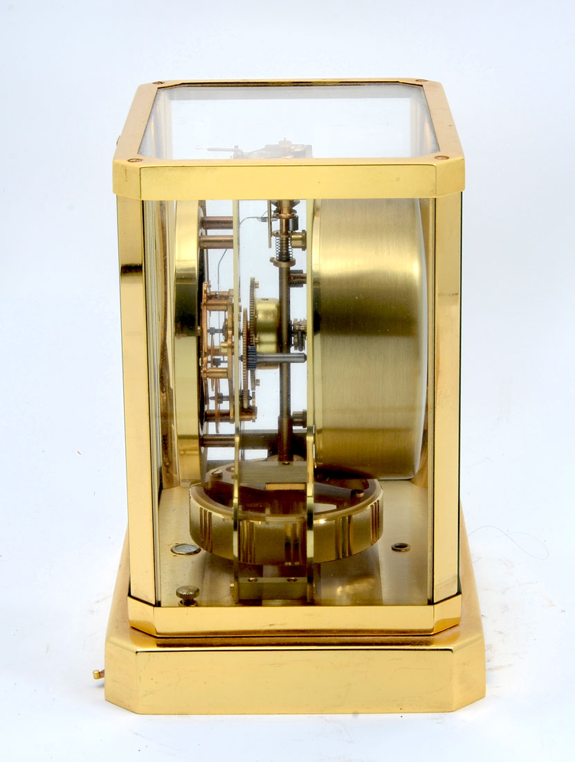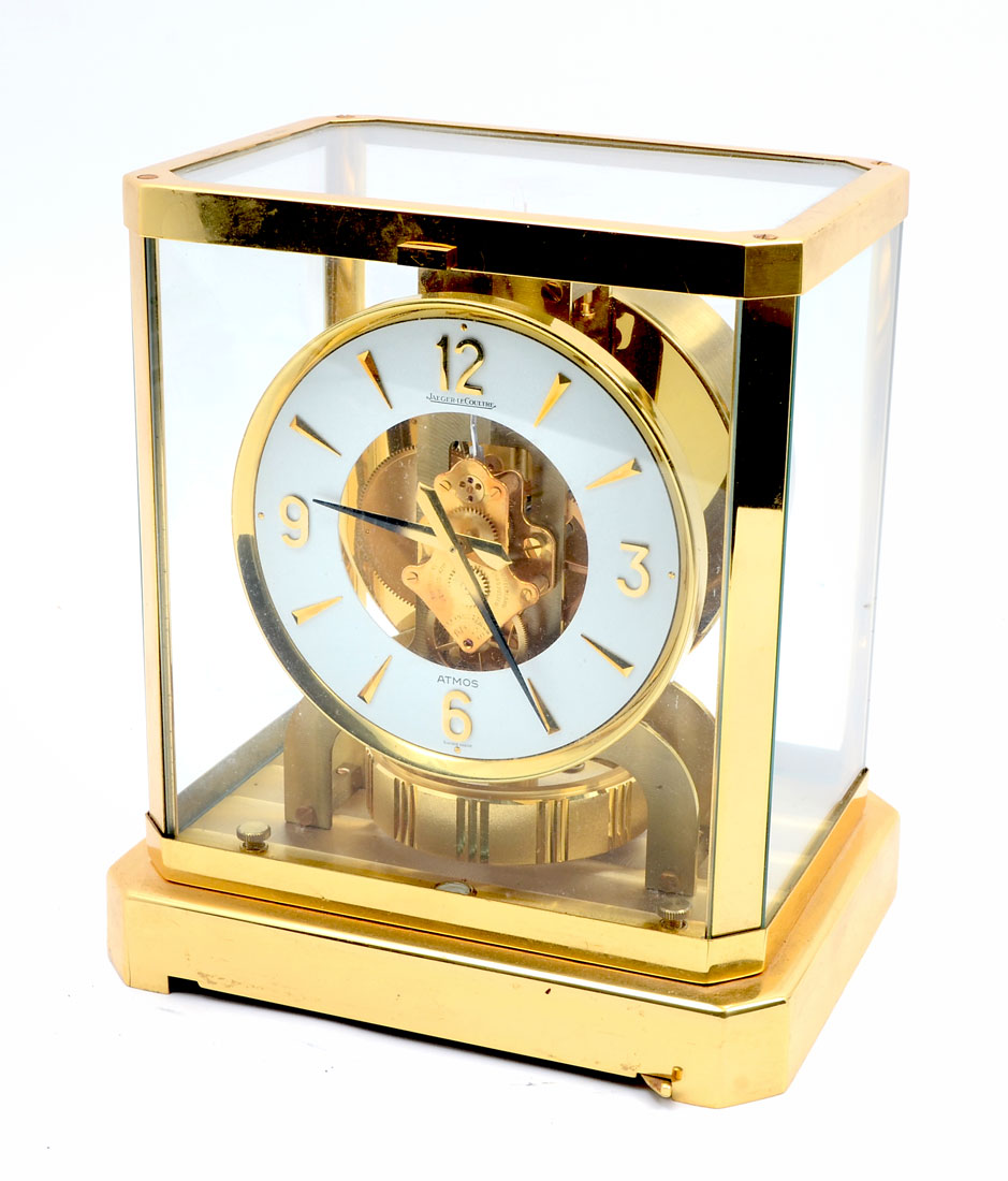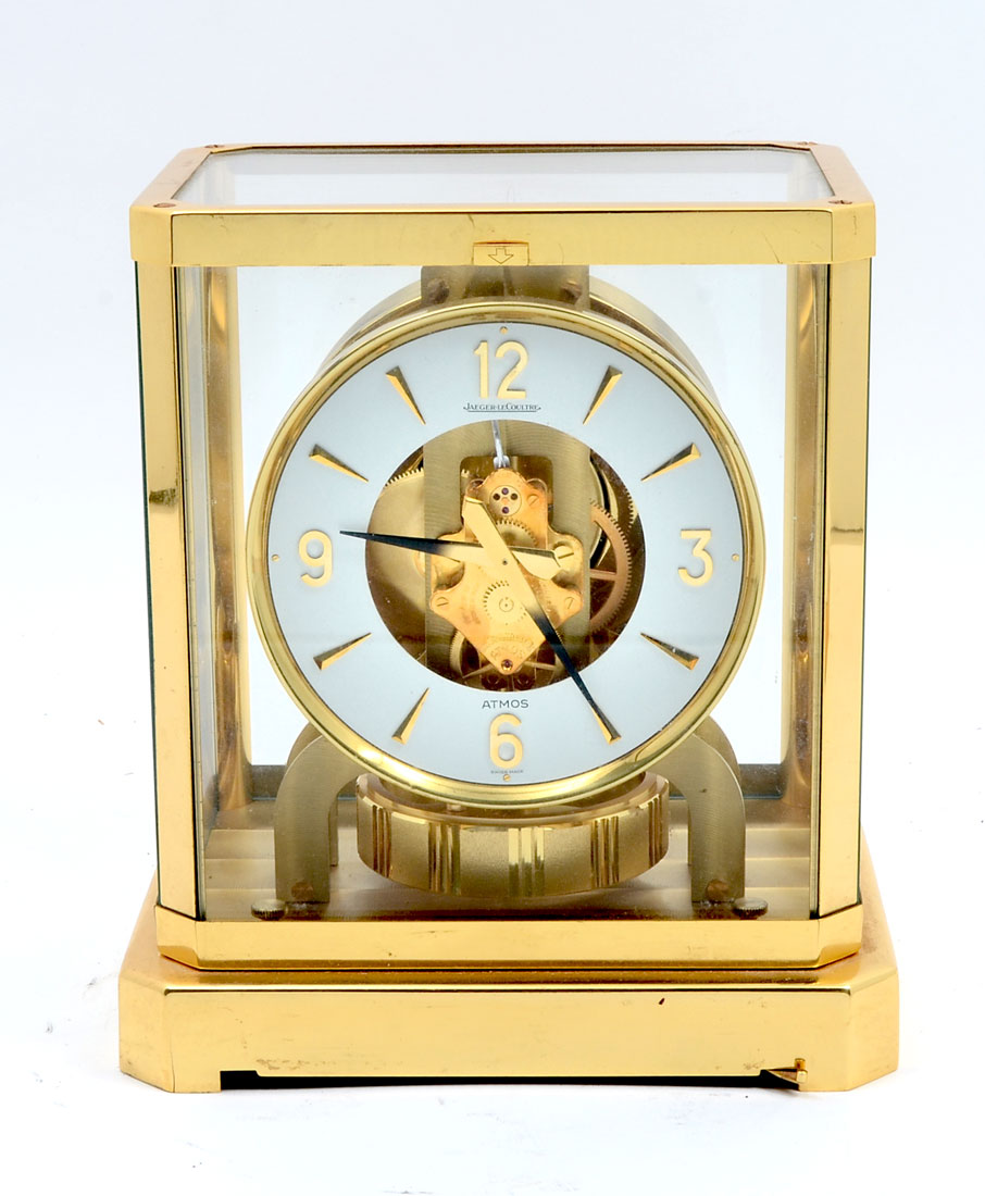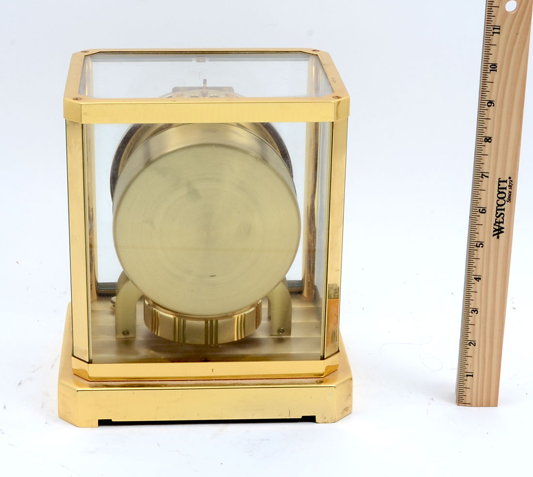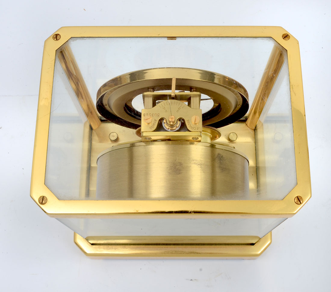 JAEGER LECOULTRE 15 JEWELS ATMOS CLOCK: Finely made Swiss Atmos clock cased in brass with glass panels. Internal level with spring loaded front removable glass. 9.25'' h x 8.25'' x 6.25'' w.