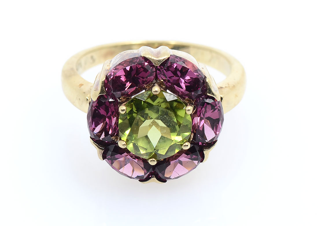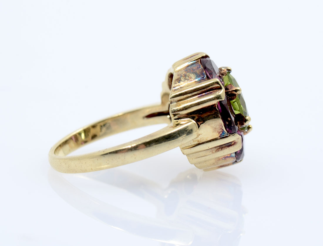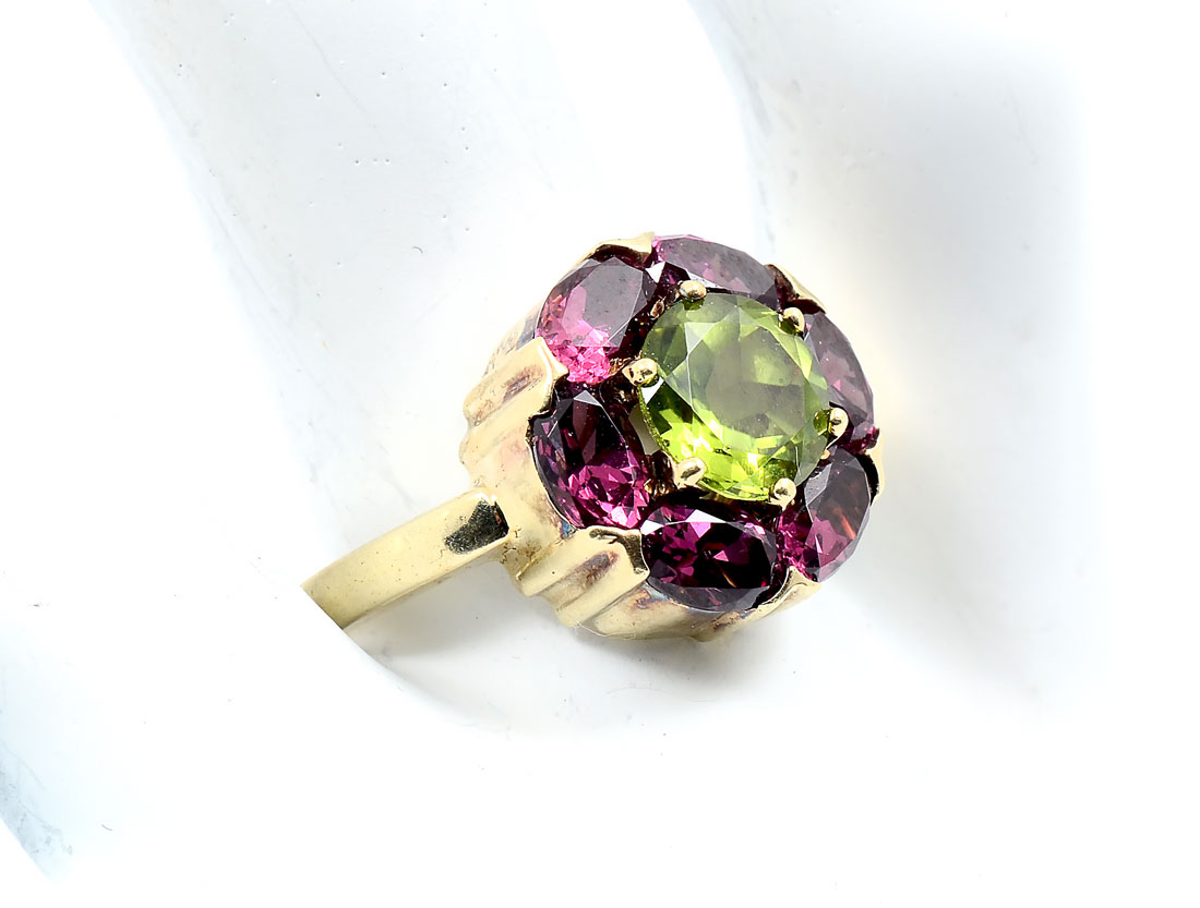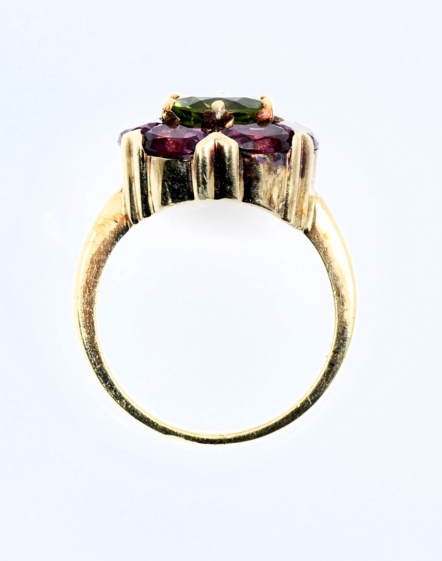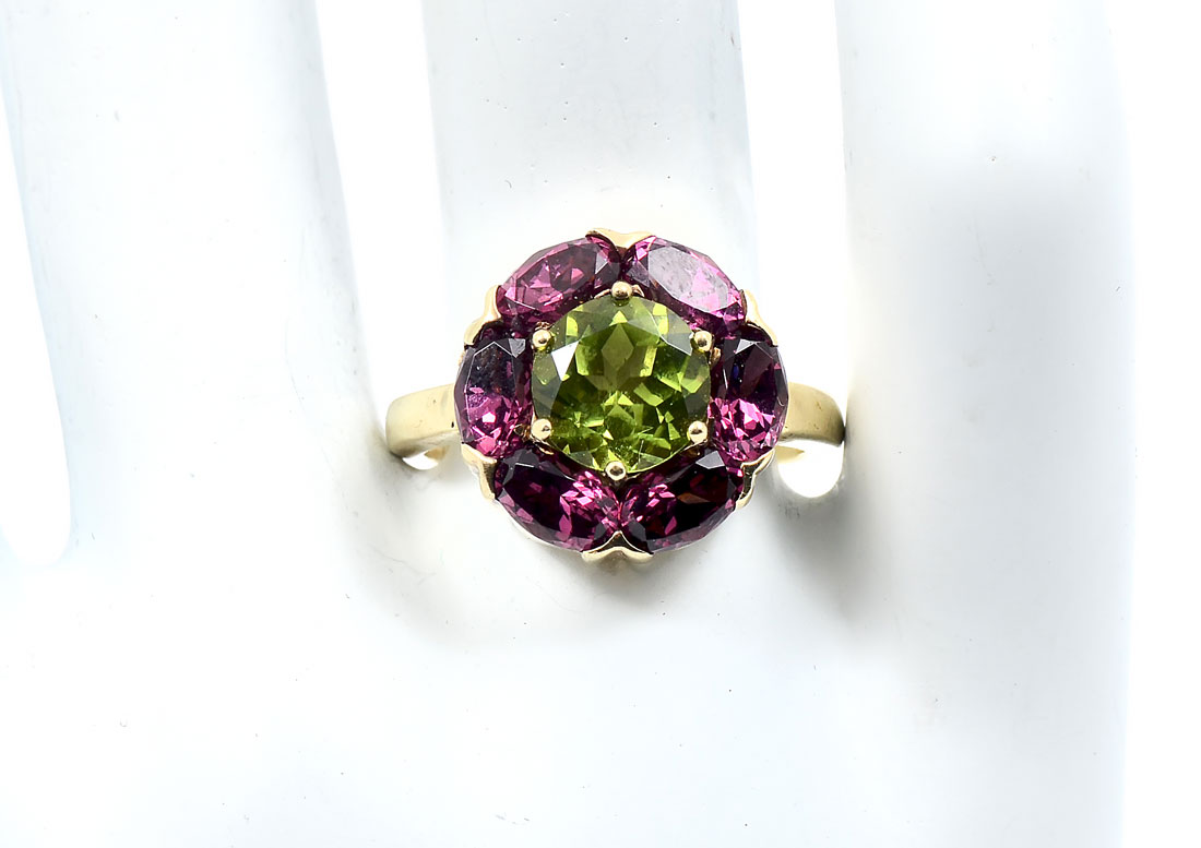 14K PERIDOT & GARNET FLOWER RING: 14 karat yellow gold with 1 round faceted Peridot. Weight: 1.88 carats approx. and 6 oval Rhodolite Garnets. WEIGHT: 3.84 ctw. approx. 8.1 grams. Size: 7-1/4