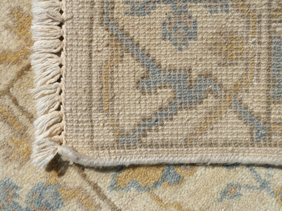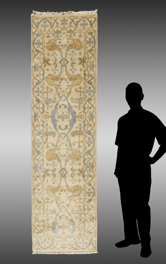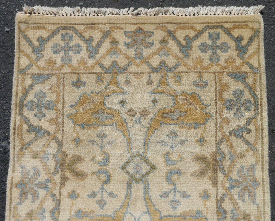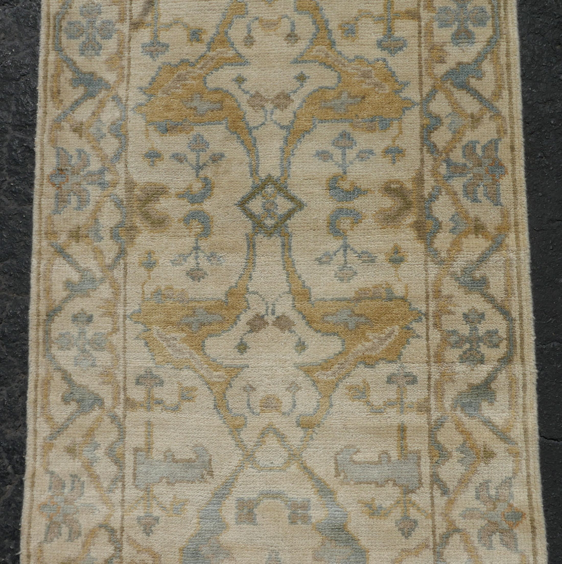 TURKISH OUSHAK HAND KNOTTED WOOL RUNNER, 2'7'' x 8': This soft ivory field runner has an undulating nouveau style repeating design in soft blues and yellow.