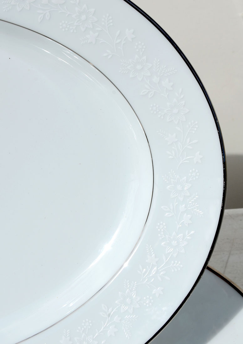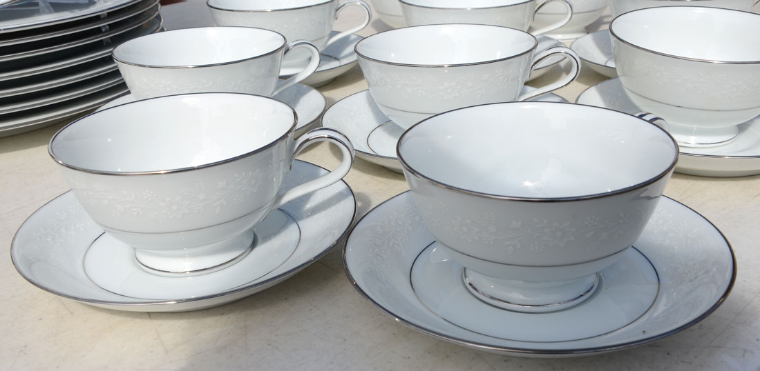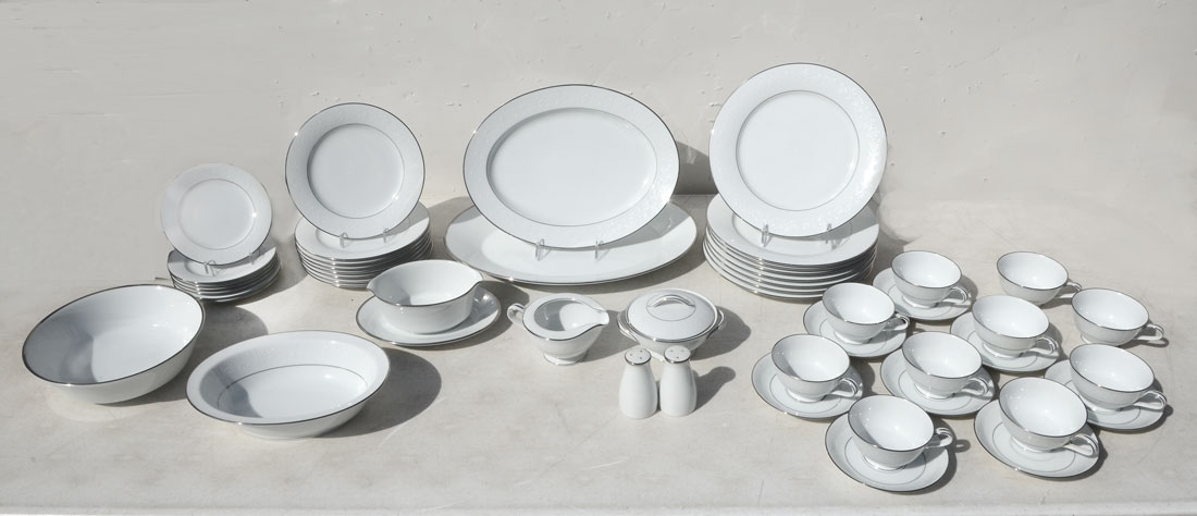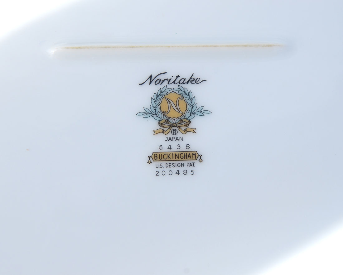 NORITAKE BUCKINGHAM CHINA SERVICE: Partial service, approx. 48 pieces in the Buckingham pattern by Noritake to include 8 dinner plates (10 1/2''), 8 salad plates (8 3/8''), 7 bread plates (6 1/2''), 10 teacups, 8 saucers, oval platter (10 1/2'' x 13 3/4''), open vegetable, gravy boat, open creamer, covered sugar, salt & pepper. Sold with an additional oval platter in the Pilgrim pattern (12'' x 16 1/4'').