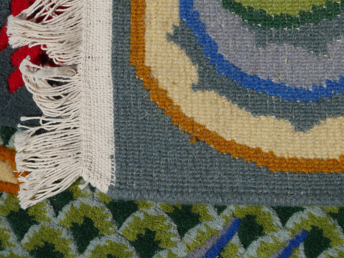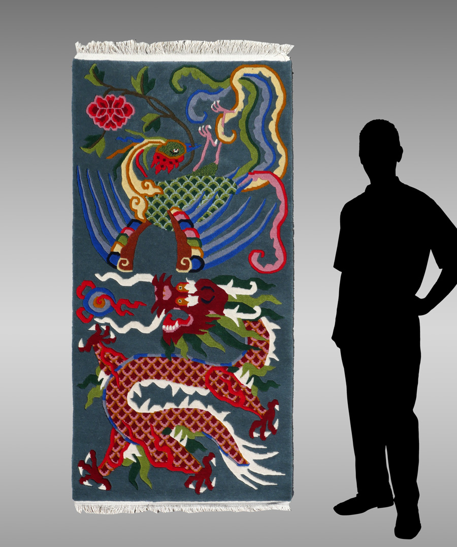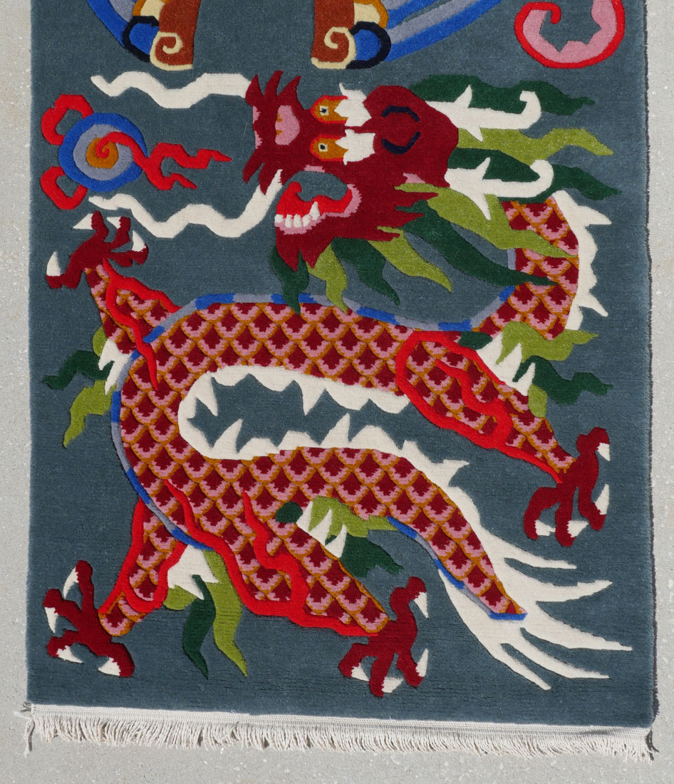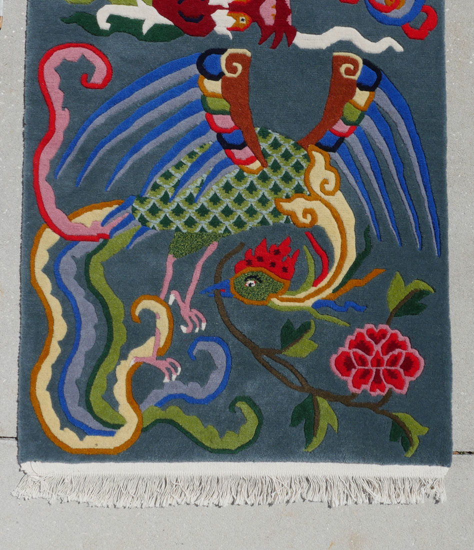 CHINESE HAND KNOTTED WOOL RUG, 3'' x 6'1'': Fun, funky Chinese rug with a dragon chasing a flaming pearl at one end and a beautiful Phoenix rising on the other end of the blue/grey field.