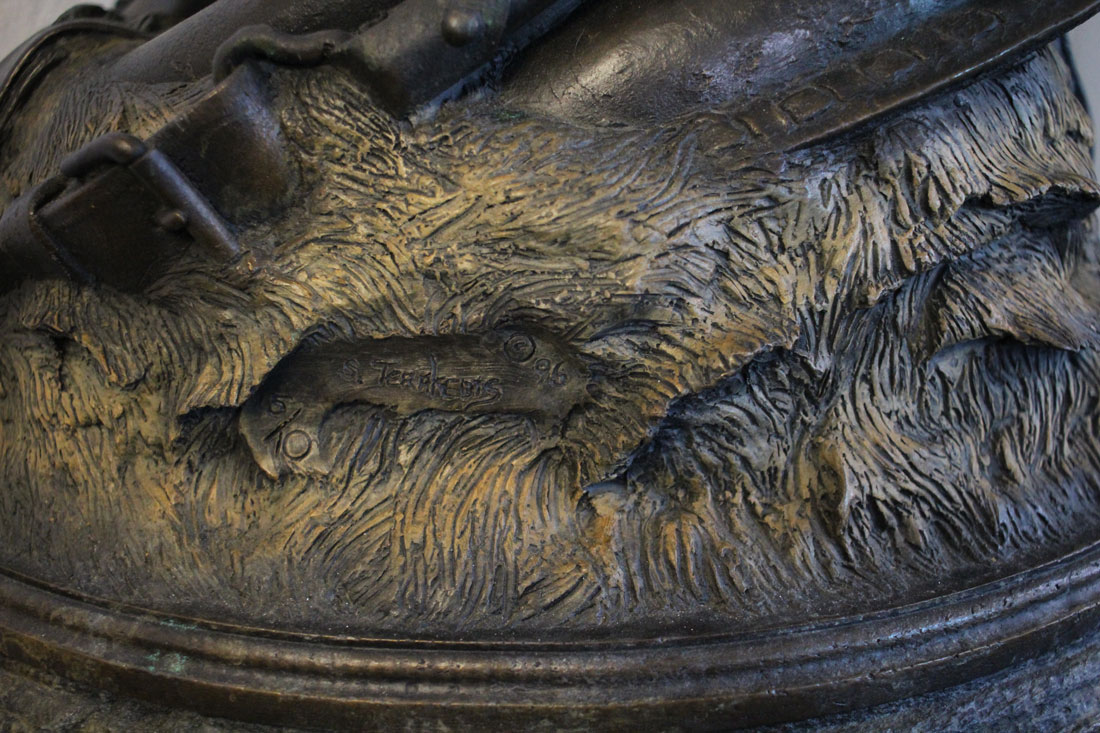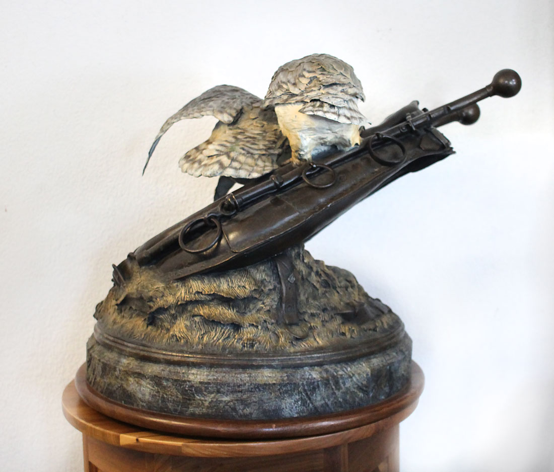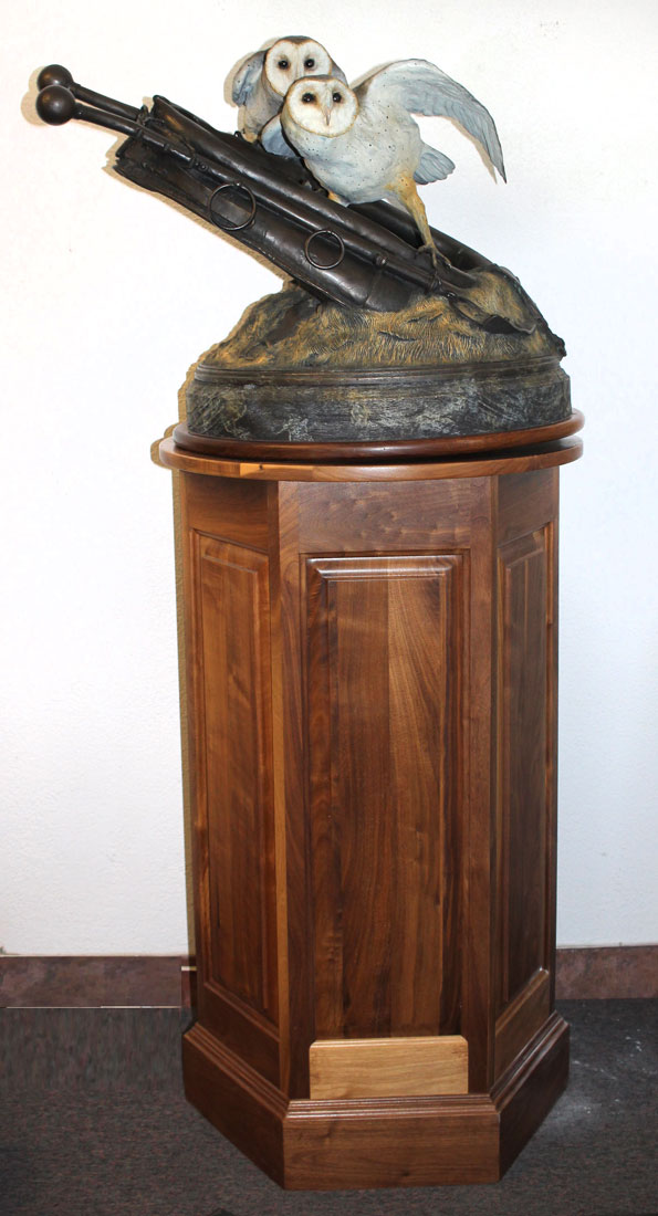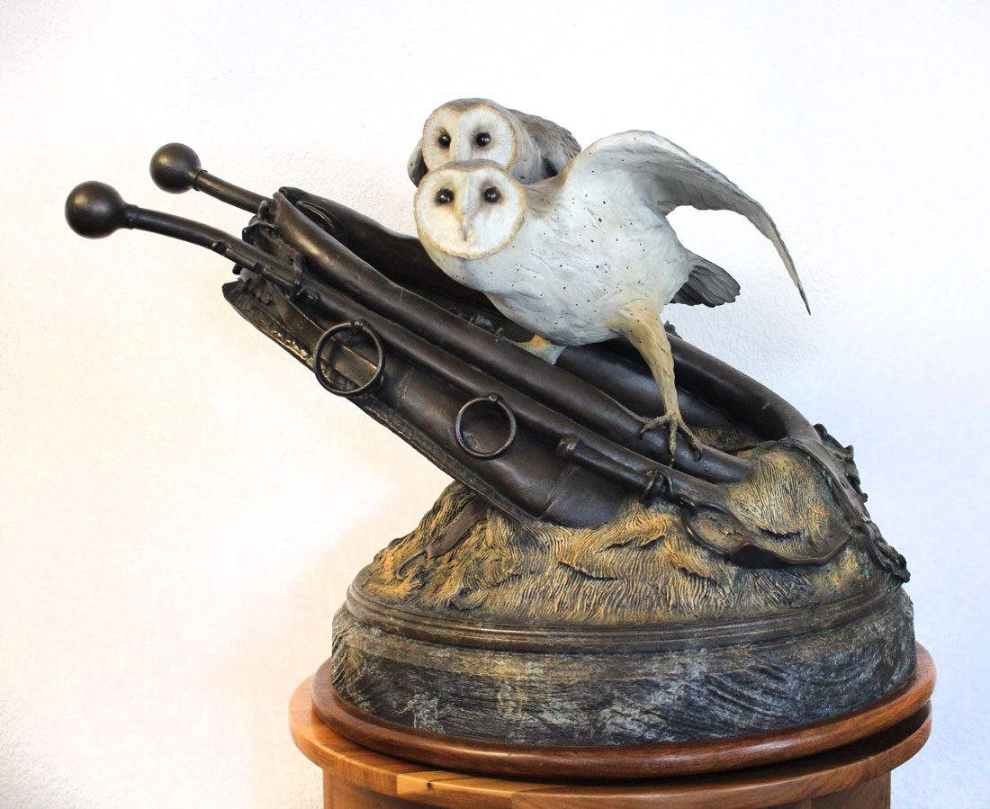 TERAKEDIS, Sam, (American, 20th C.): Barn Owls Perched on a Horse Collar, Patinated Bronze, 20'' h. x 28'' w., signed and dated '96, numbered 5/10, affixed to lazy susan wooden plinth, sold with custom wood paneled stand, 39'' h.