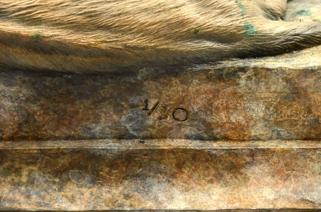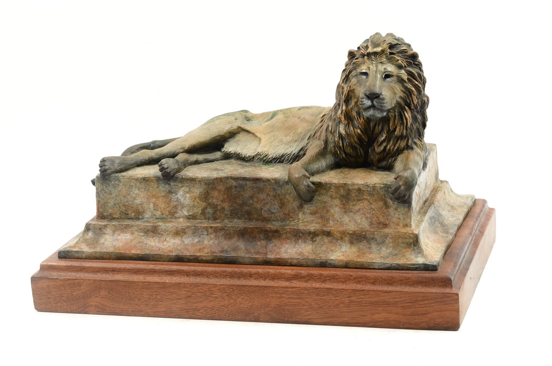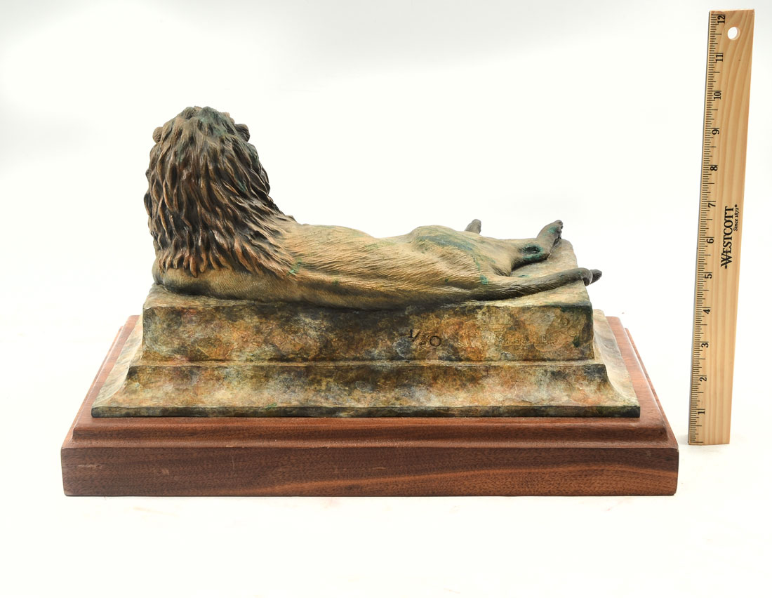 TERAKEDIS, Sam, (American, 20th C.): Male Lion Relaxed, Patinated Bronze, 7.5'' h., 14.5'' w., 8.5'' d., signed, dated '04 and numbered 1/30, affixed to wooden plinth, 9.5'' overall h., 16'' w., 10'' d..