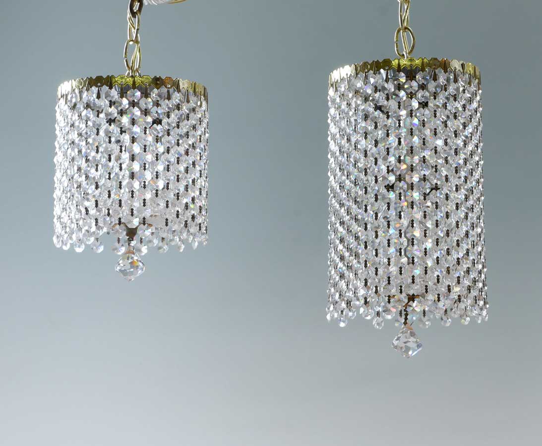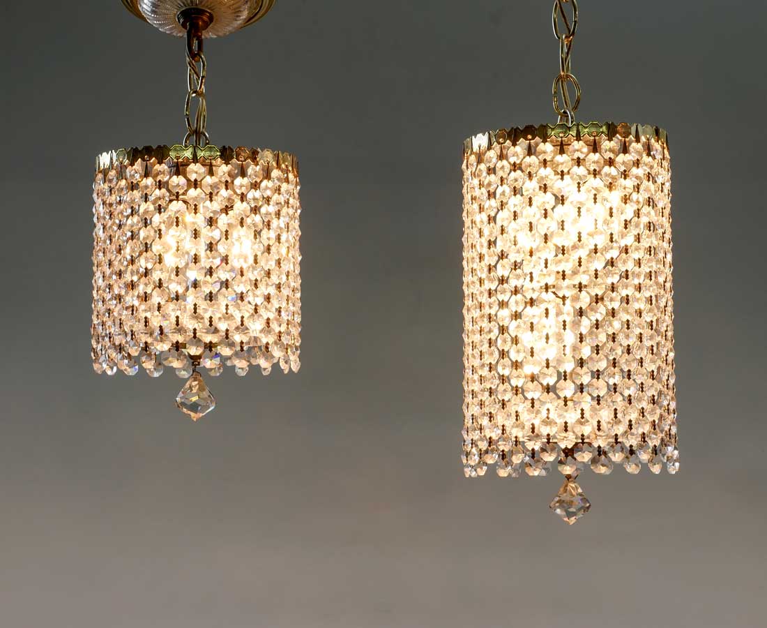 2 VINTAGE SCHONBEK CRYSTAL HANGING LIGHTS: Both lights have draped prisms on a metal frame. One is a single tier light and the other is a double tier light. Metal and crystal ceiling mounts on both. One is Approx. 12.5'' h x 6.75'' w. One is Approx. 32'' h x 6.75'' w.